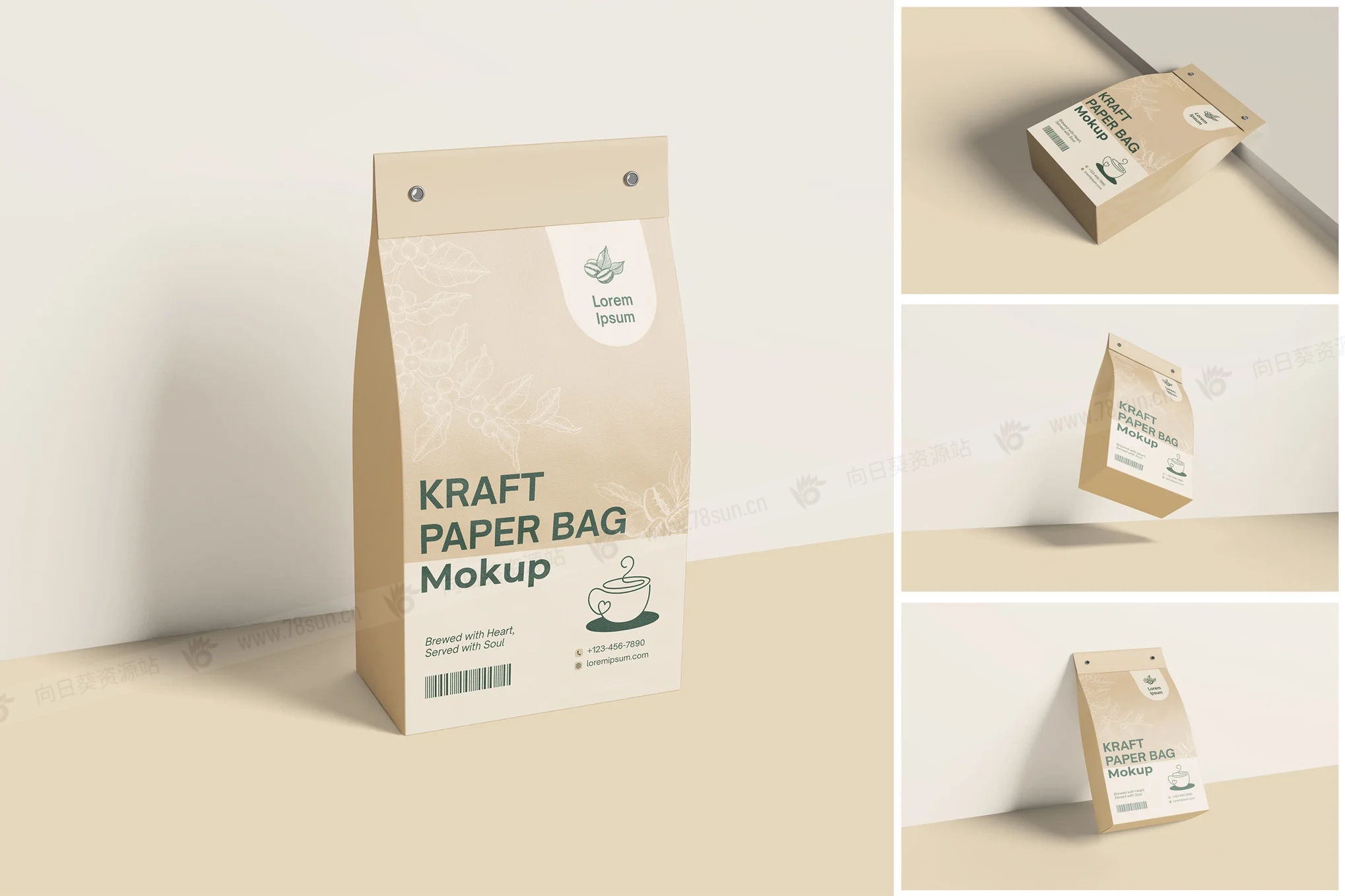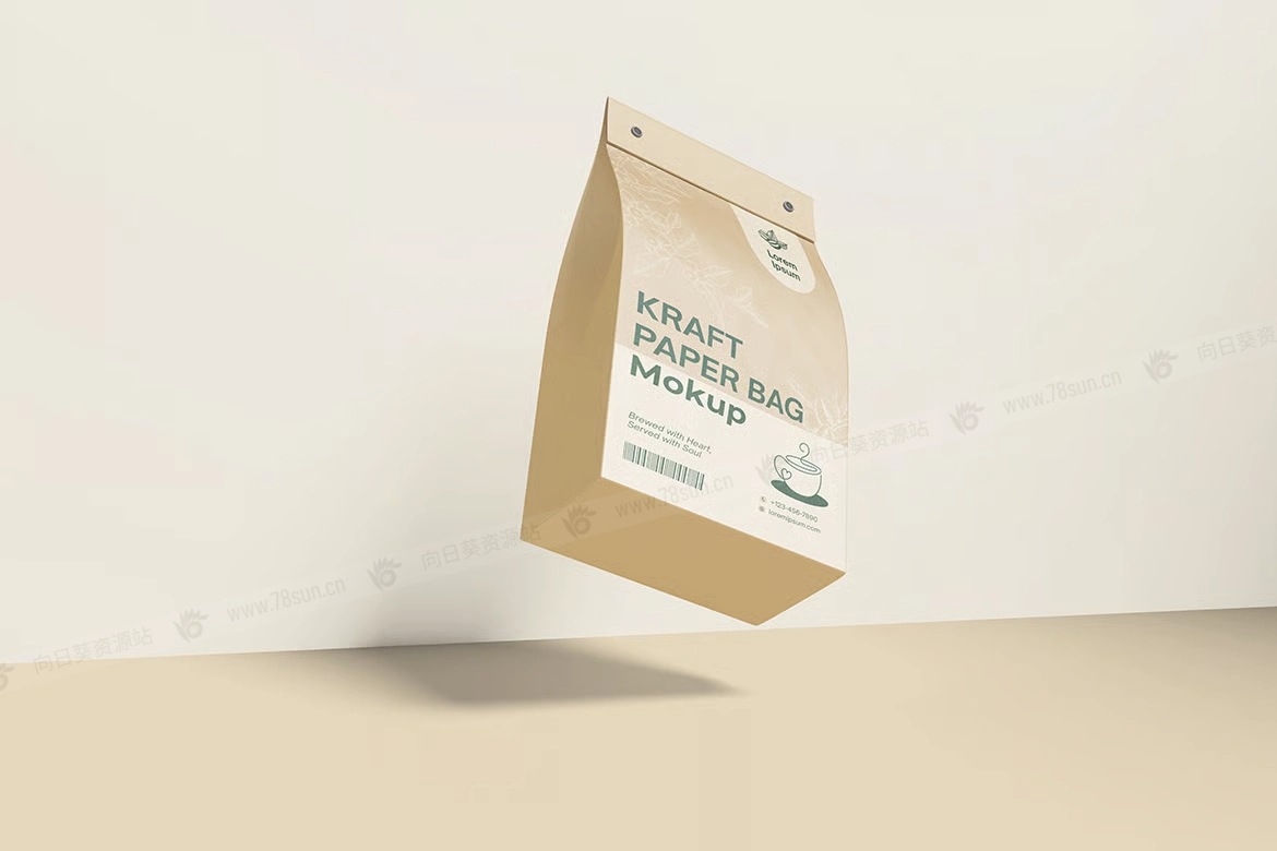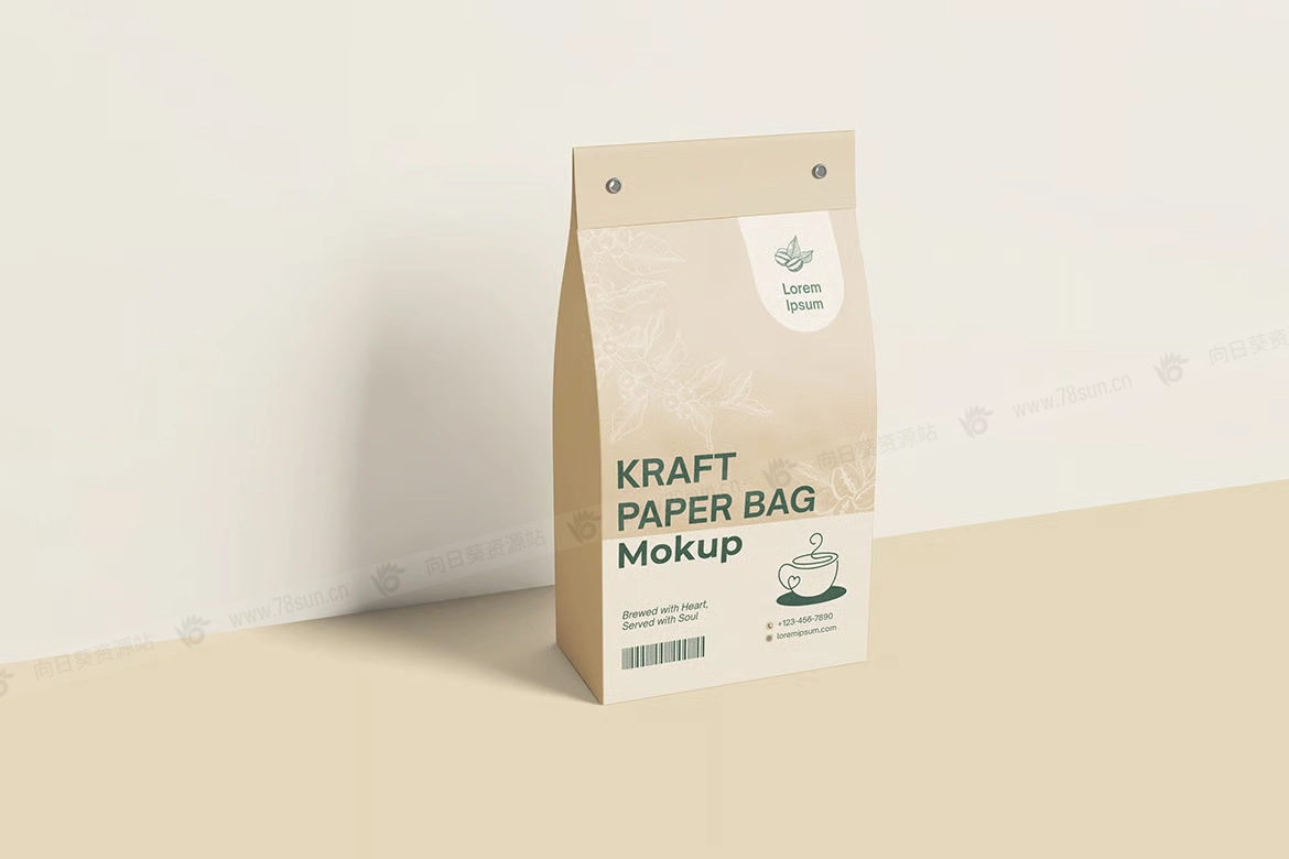 食品站立式牛皮纸袋品牌VI效果图展示智能贴图psd设计样机。使用智能对象轻松替换您的设计,双击智能图层,复制并粘贴您的图稿,保存即可完成!