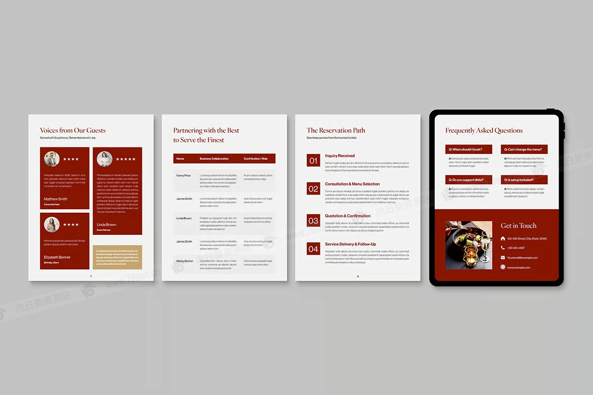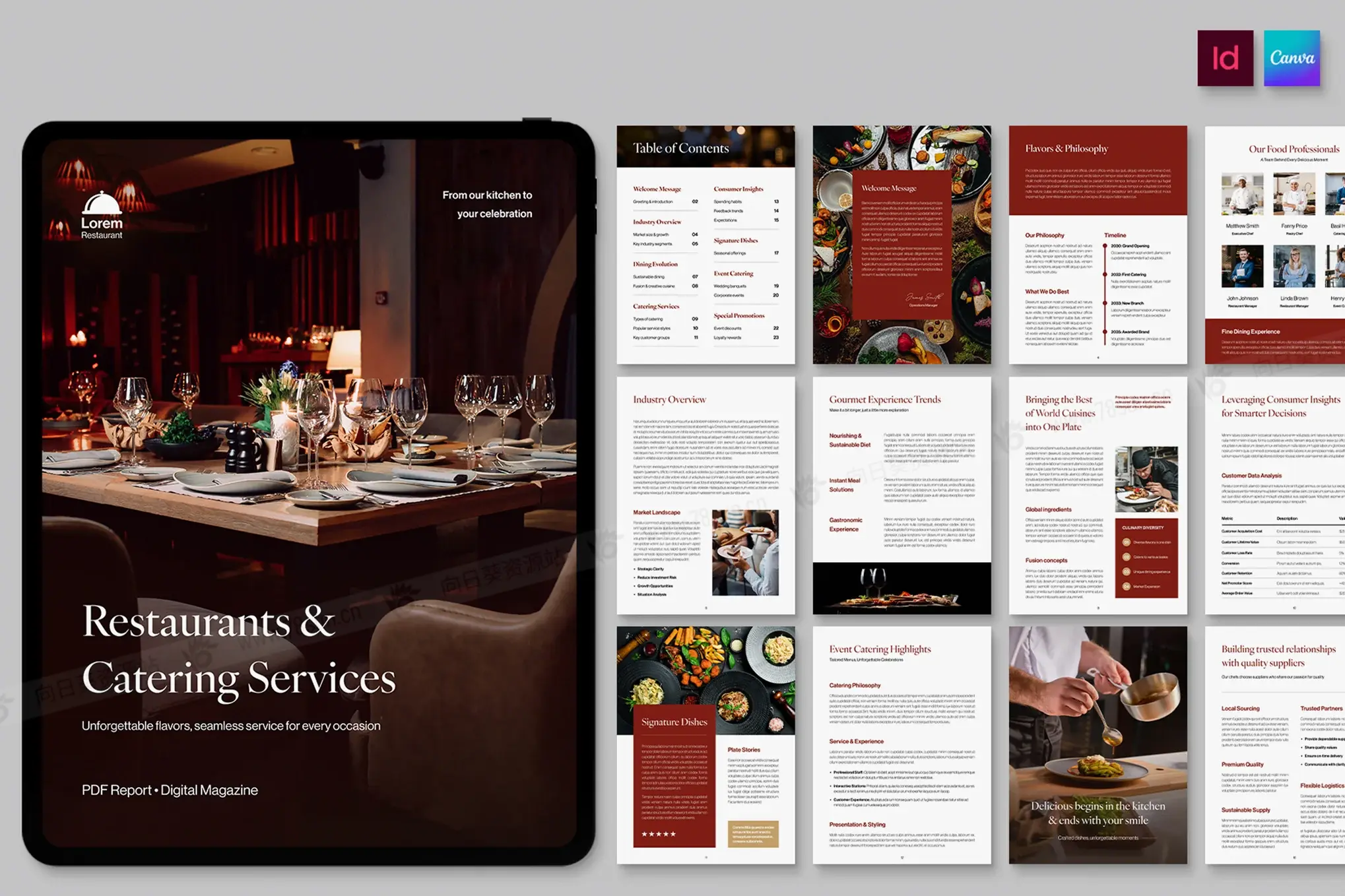 酒店食品美食餐厅电子书数字小册子杂志宣传册画册indd设计模板 — 适用于酒店、餐厅、咖啡馆、度假村以及旅游和食品品牌的干净、现代的布局。采用 Canva、InDesign IDML、InDesign INDD 格式,具有可编辑的页面、排版、颜色样式和图像占位符。