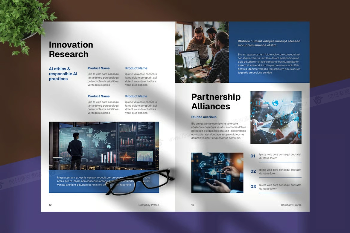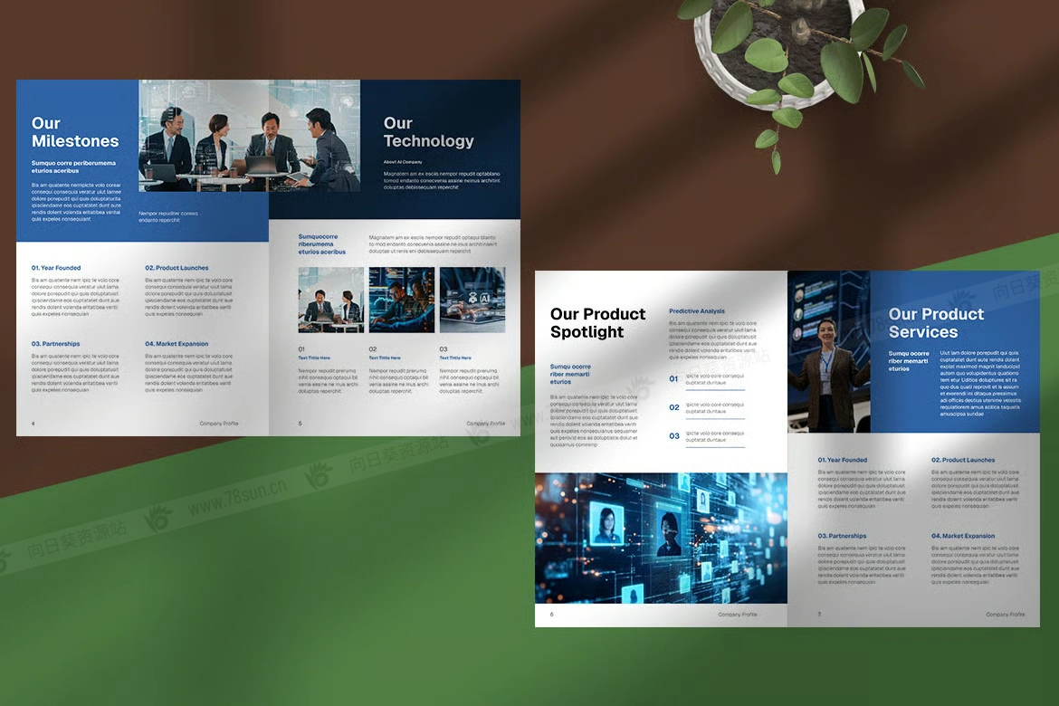 人工智能高科技公司简介小册子杂志宣传册画册indd设计模板,非常适合展示人工智能和技术业务。它平衡地结合了清晰的白色空间和干净的蓝色点缀,营造出时尚的企业外观,强调创新和信誉。该模板包含里程碑、服务、案例研究、团队简介和推荐等结构良好的部分,可以轻松展示您的品牌故事并与客户建立信任。