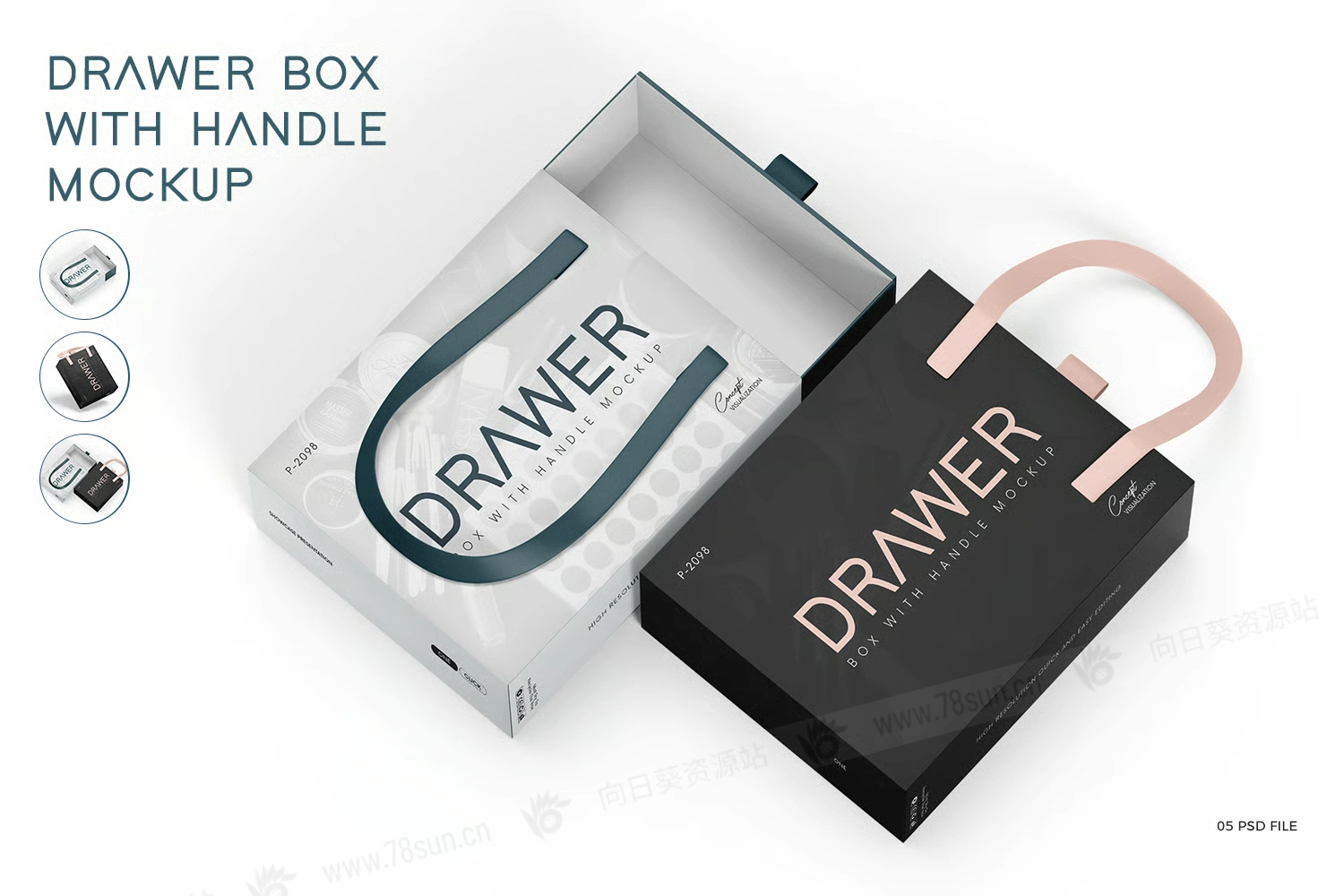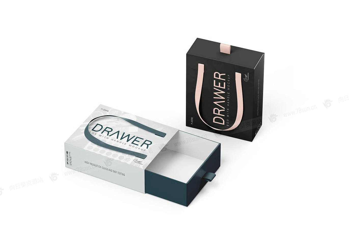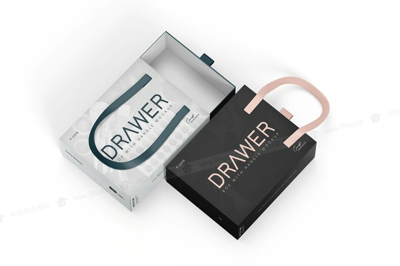 带把手滑动抽屉盒品牌VI效果图展示智能贴图psd设计样机,带有织物或丝带拉手,非常适合展示珠宝、化妆品或奢侈品礼品的包装设计。