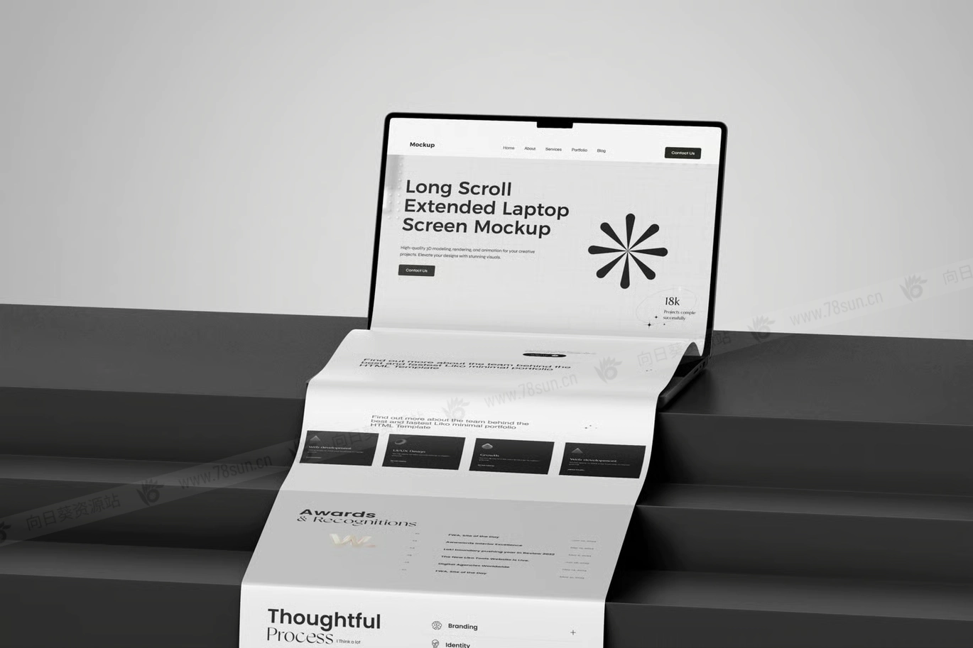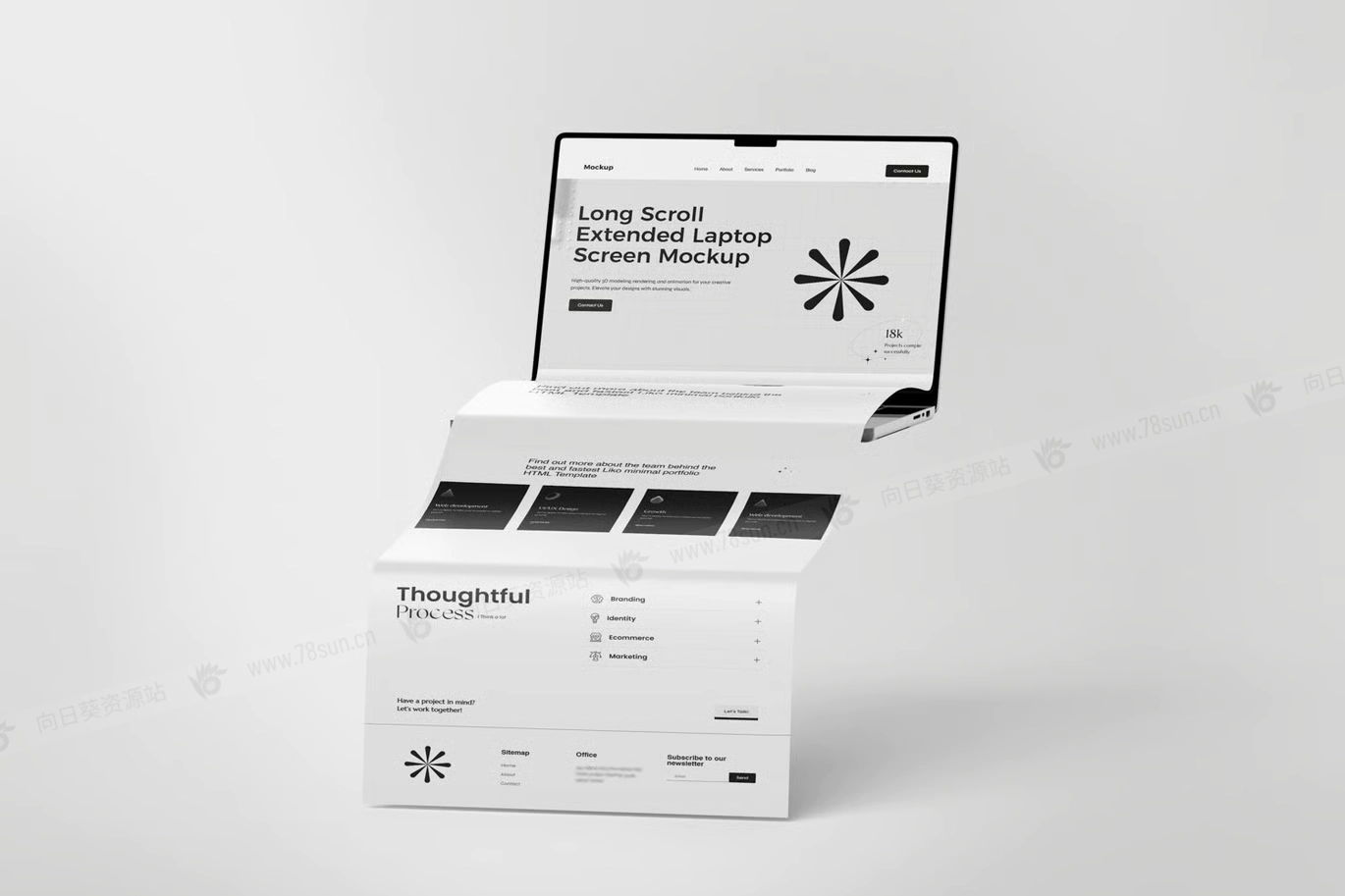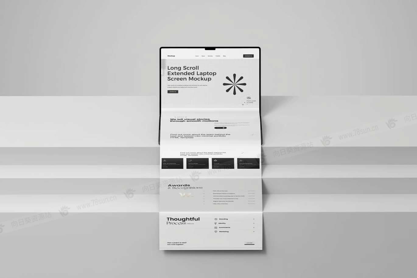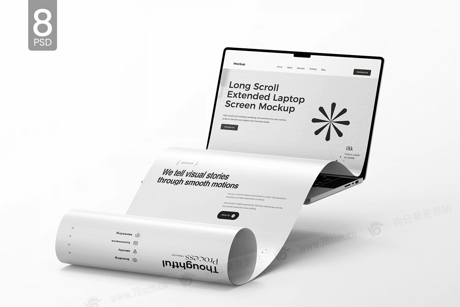 长卷轴扩展笔记本电脑浏览器屏幕UI效果图展示智能贴图psd设计样机,旨在以视觉上引人入胜且专业的方式展示网站、移动应用程序和响应式 UI/UX 设计。无论您是展示登录页面、桌面布局还是移动界面,这个独立的、逼真的模型都可以作为多功能模板,在上下文中演示 Web 和应用程序设计