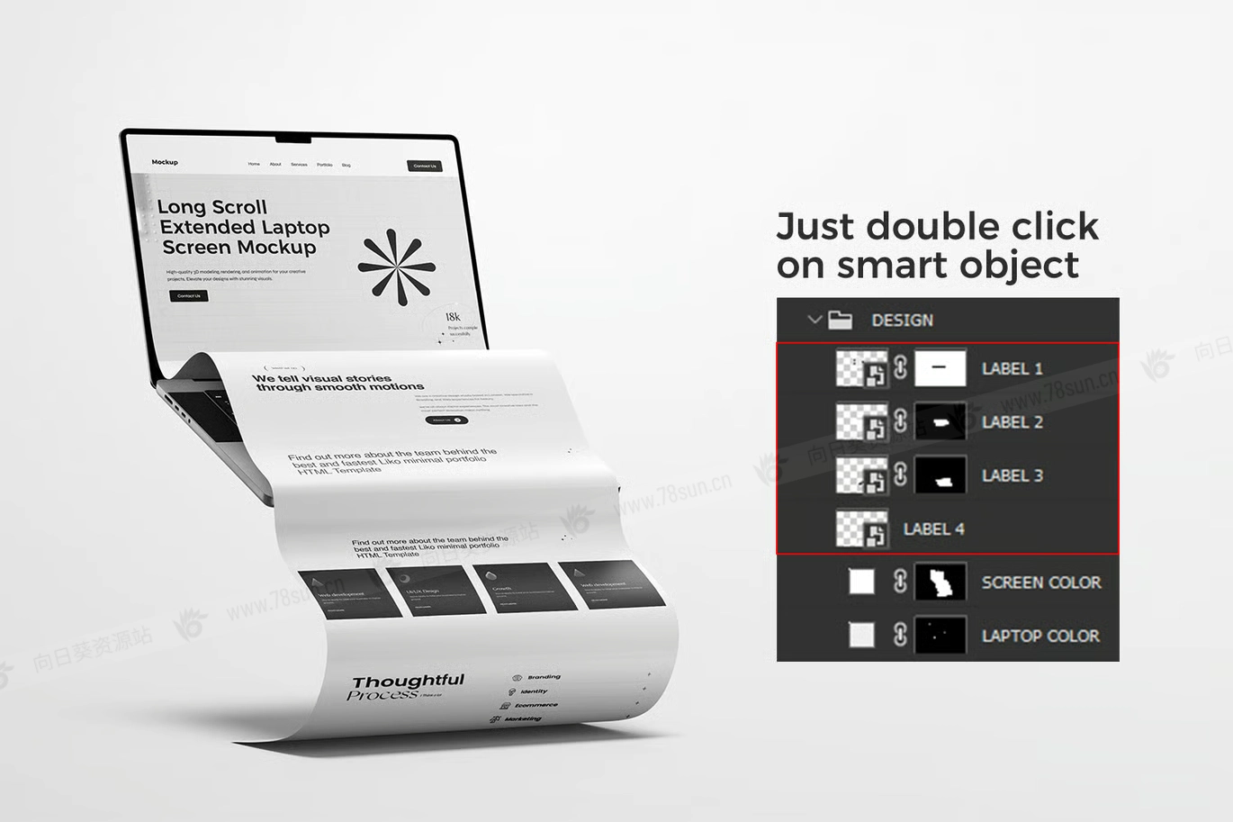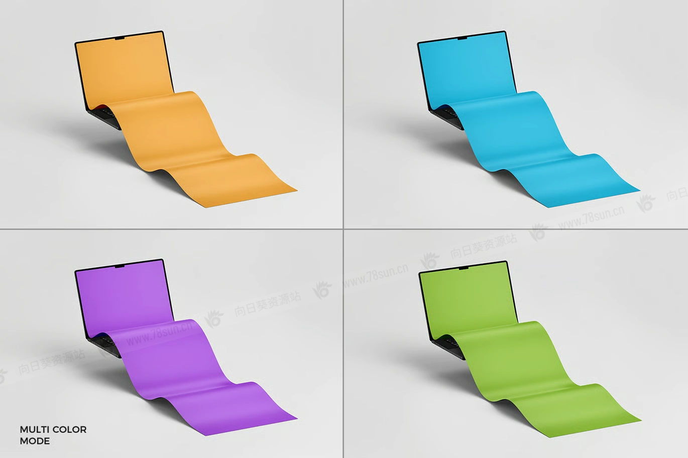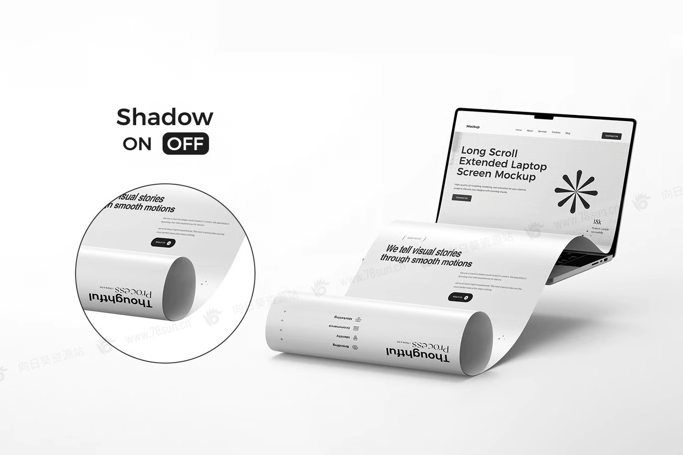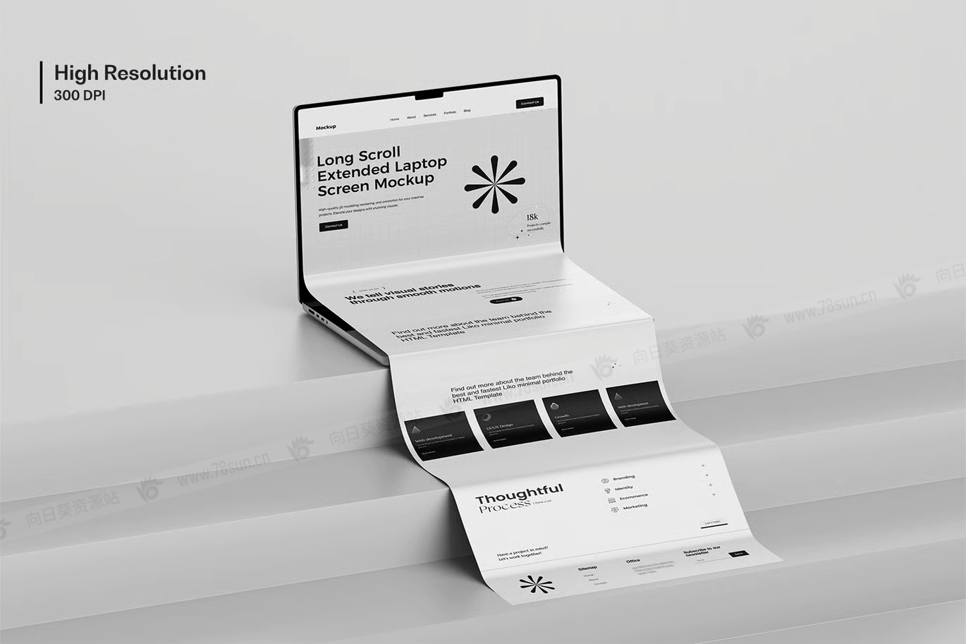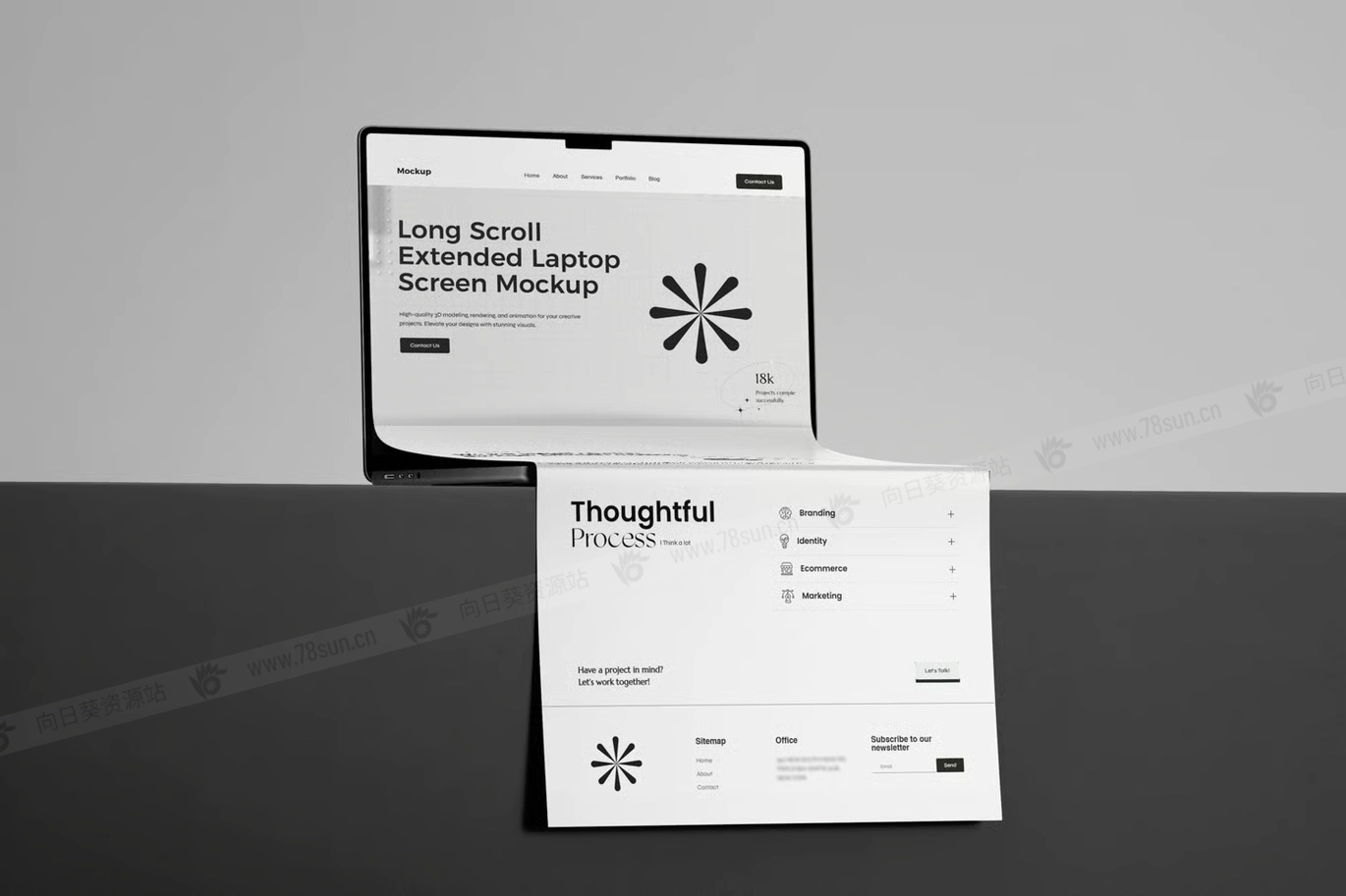 长卷轴扩展笔记本电脑浏览器屏幕UI效果图展示智能贴图psd设计样机,旨在以视觉上引人入胜且专业的方式展示网站、移动应用程序和响应式 UI/UX 设计。无论您是展示登录页面、桌面布局还是移动界面,这个独立的、逼真的模型都可以作为多功能模板,在上下文中演示 Web 和应用程序设计