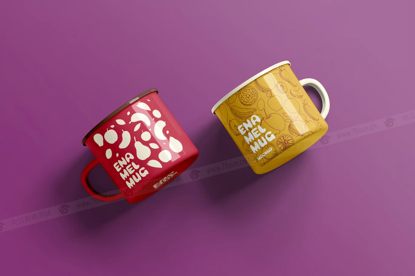 珐琅搪瓷马克杯品牌VI效果图展示智能贴图psd设计样机,展示您的徽标、图案或颜色。