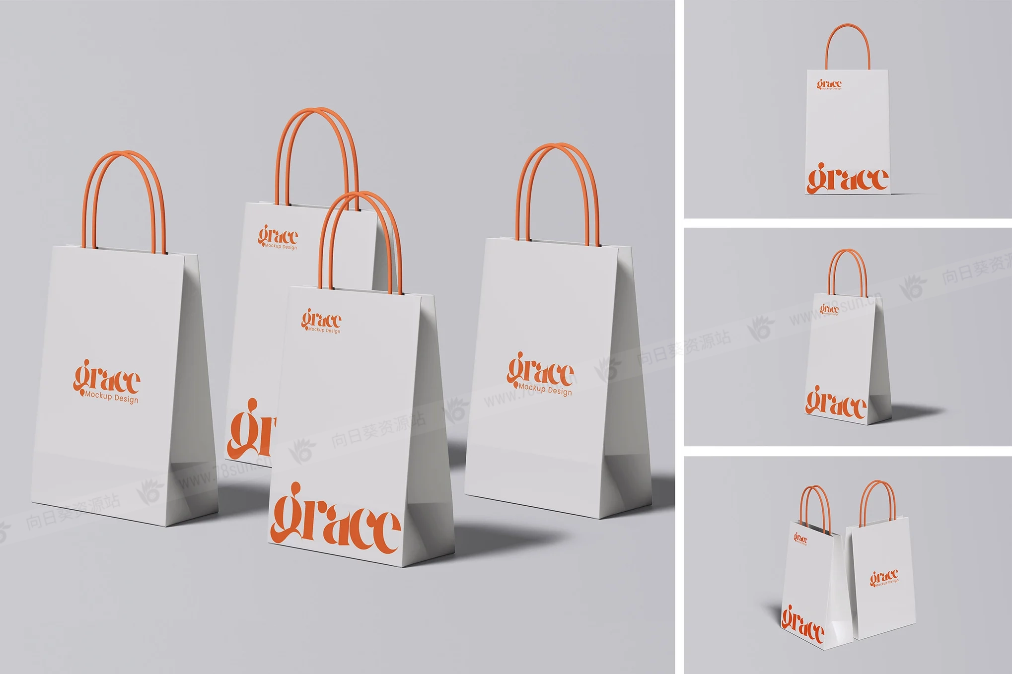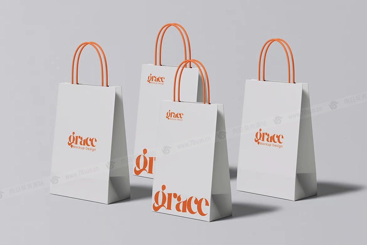 纸质手提袋购物袋品牌VI效果图展示智能贴图psd设计样机,该模型包括 4 个带有分层良好 PSD 文件,并且该模型还使用智能对象功能,这意味着您可以在几秒钟内轻松快速地使用自己的设计更改当前设计。