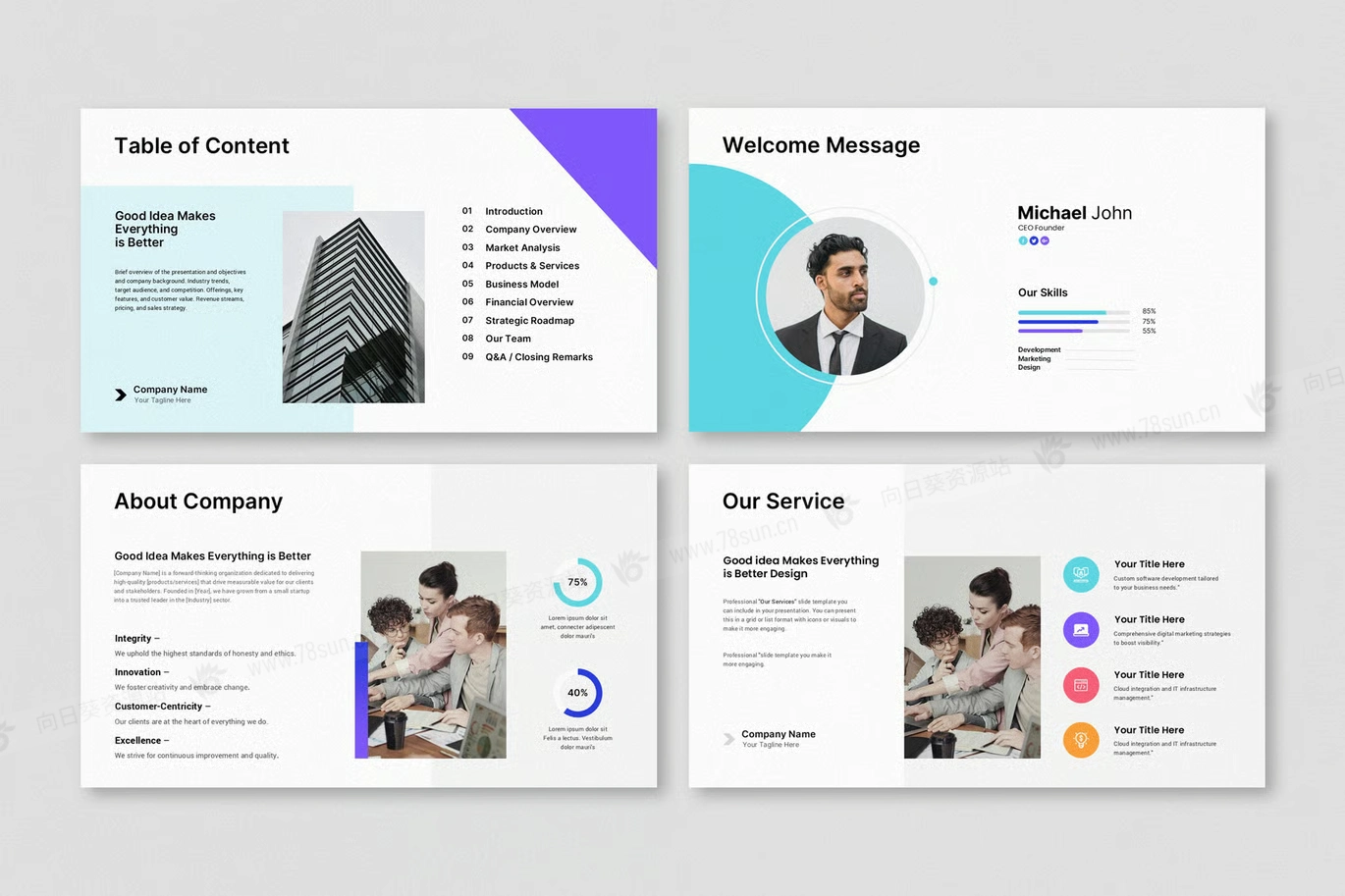 公司简介商业营销计划书演示PowerPoint幻灯片模板。所有元素都易于编辑,您可以轻松更改 与您的个人或公司品牌相匹配的颜色。