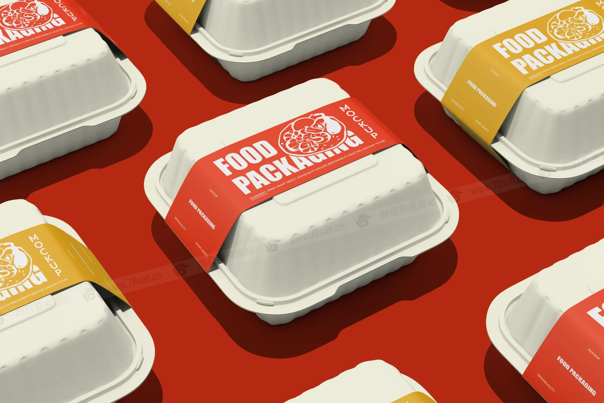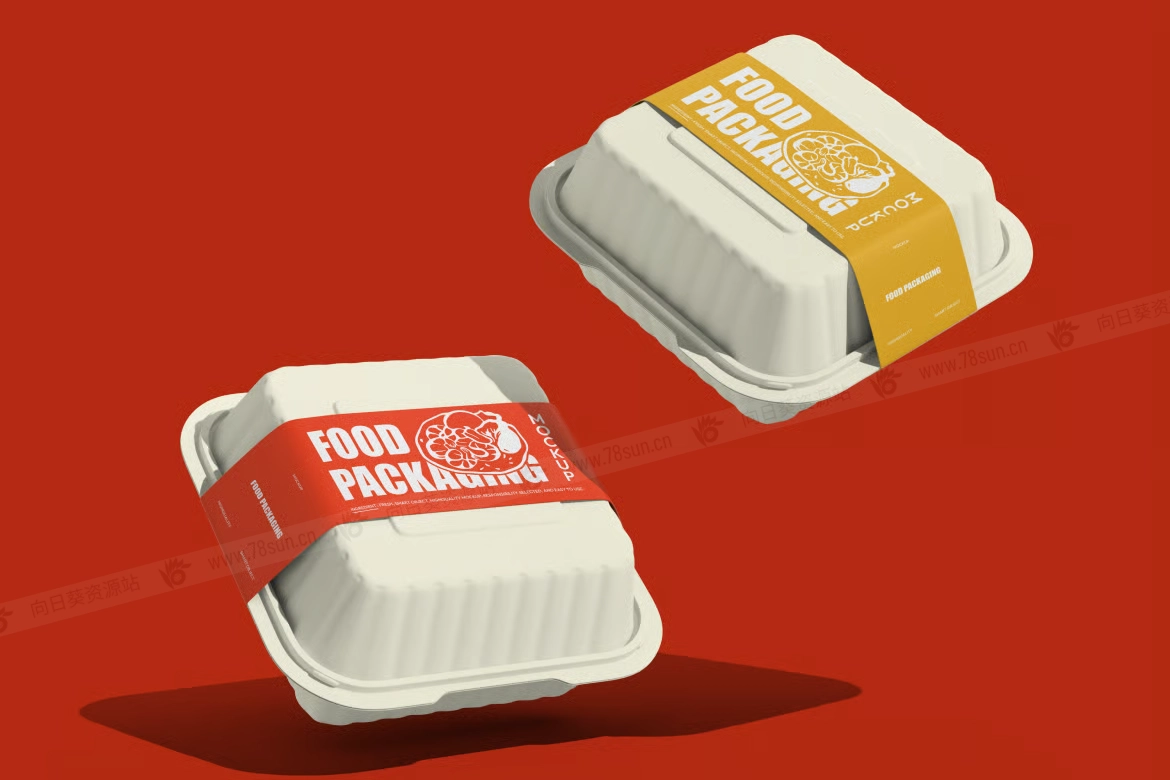 带标签外卖打包盒食品包装盒品牌VI效果图展示智能贴图psd设计样机,该包装盒具有两个独立的场景,此模型可让您完全自定义盒子颜色、袖子设计和背景,以满足您的品牌需求。智能对象图层非常适合餐厅、送货服务或生态包装概念,使编辑变得快速而轻松。
