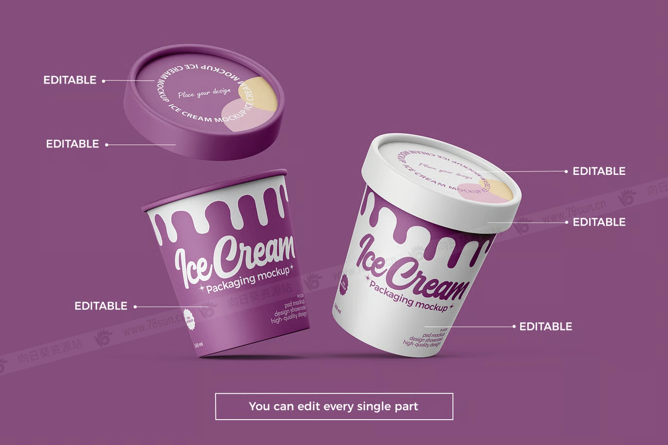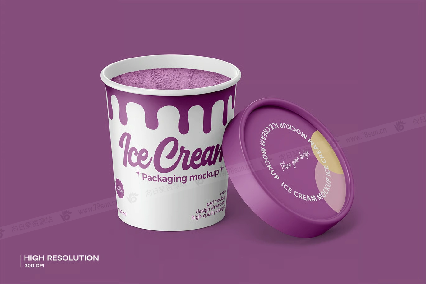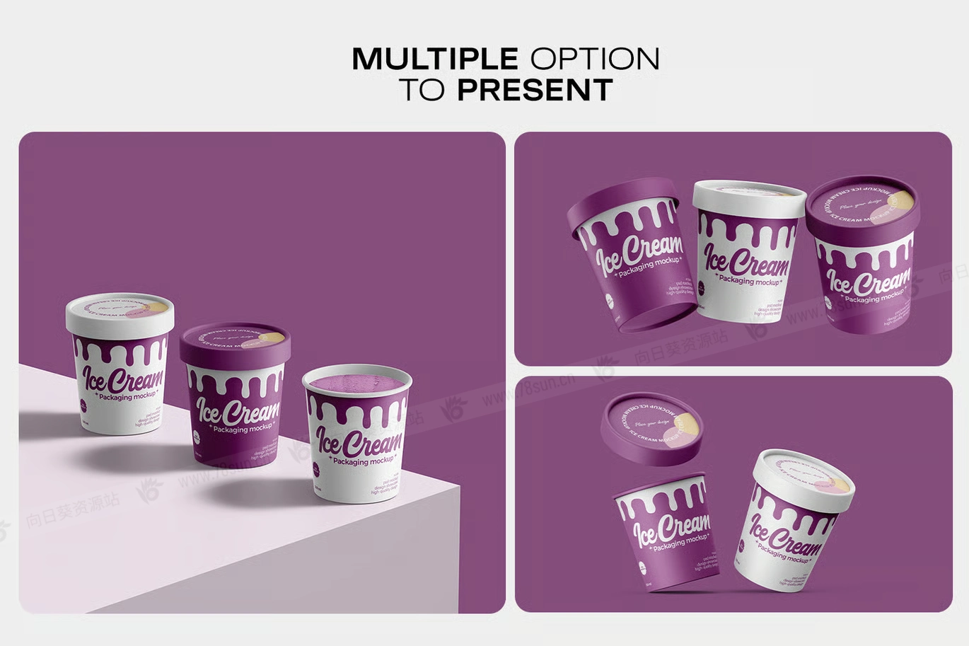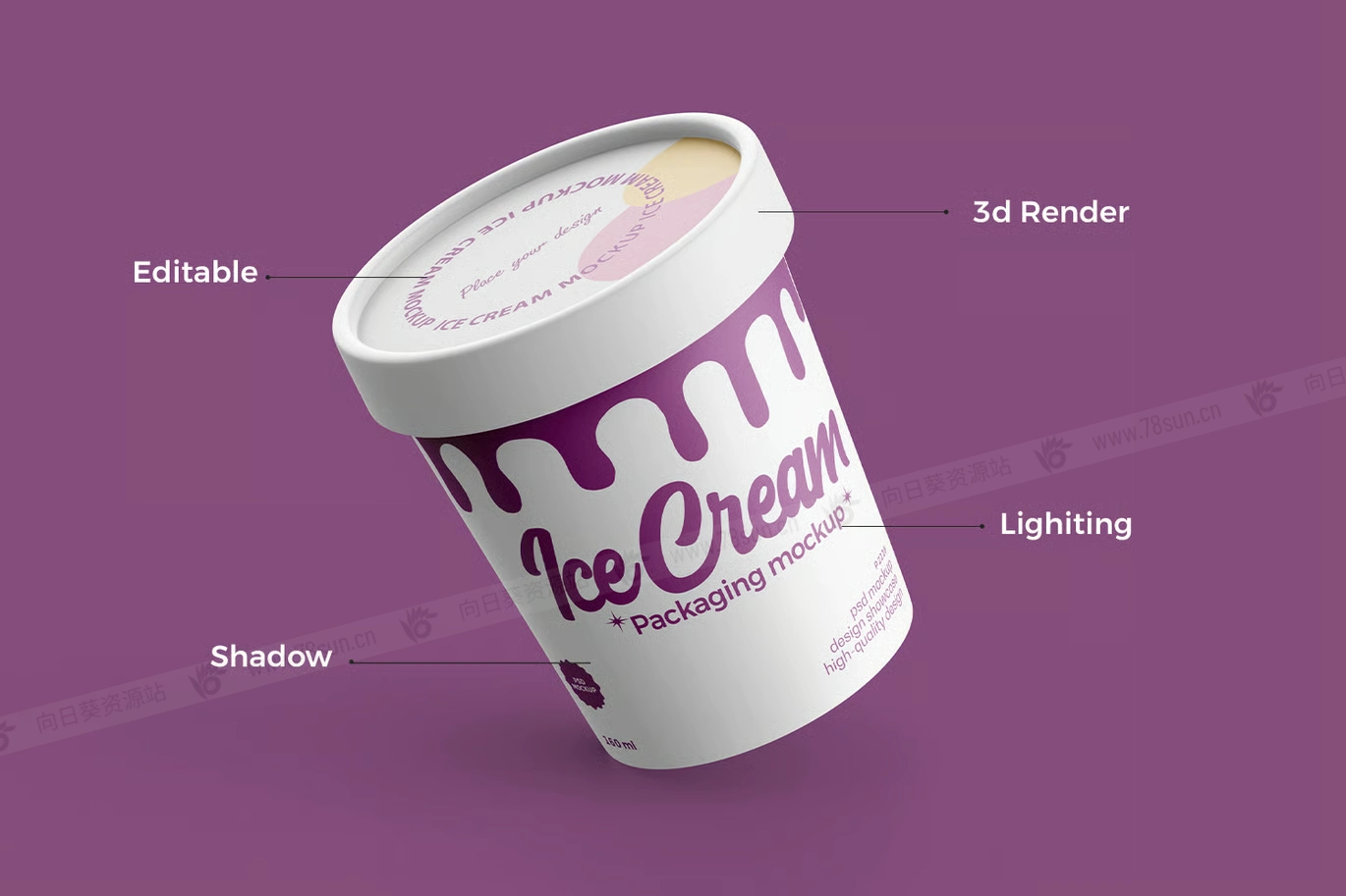 桶装冰淇淋纸杯品牌VI效果图展示智能贴图psd设计样机,这个冰淇淋杯模型是一个高质量、完全可定制的PSD模板,旨在展示您的冰淇淋、酸奶或冷冻甜点包装,具有逼真的细节。该模型非常适合塑料杯、零食桶或乳制品甜点,具有可编辑的智能对象,可快速轻松地插入设计。