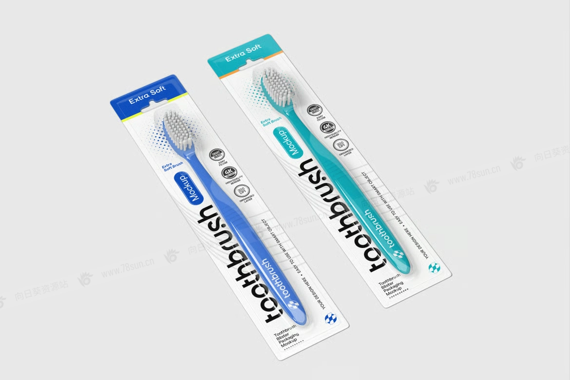牙刷泡罩包装品牌VI效果图展示智能贴图psd设计样机,该模型在两个独立的场景中展示了泡罩包装。智能对象图层使插入您自己的品牌、图形或标签设计变得简单,同时保持逼真的外观。该模型完全可定制,允许您调整颜色和背景,以获得专业且精美的显示效果。
