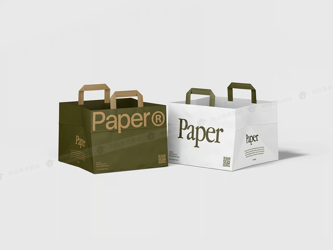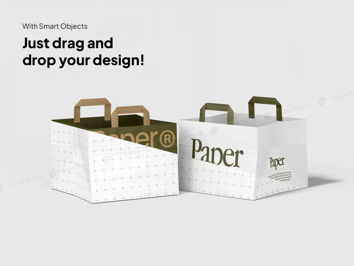纸质手提袋购物袋品牌VI效果图展示智能贴图psd设计样机,具有智能对象集成功能,让您可以轻松插入您的艺术品并调整包的颜色以适应您的审美。有组织的图层结构确保了无缝的编辑体验,可以轻松自定义每个细节,而无需搜索多个图层的麻烦。