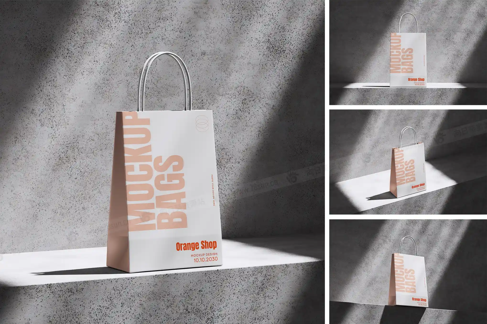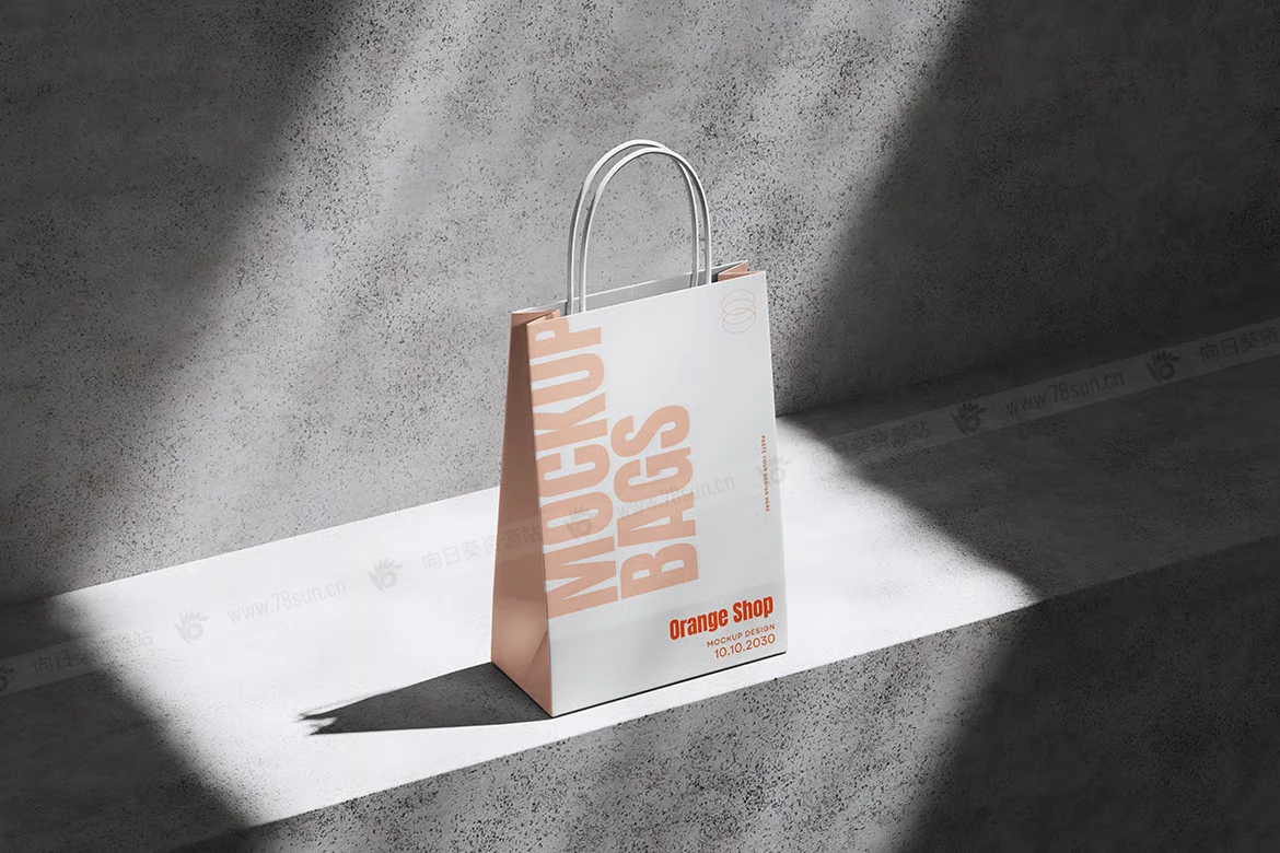 纸质手提袋购物袋品牌VI效果图展示智能贴图psd设计样机,该模型包括 4 个带有分层良好 PSD 文件,并且该模型还使用智能对象功能,这意味着您可以在几秒钟内轻松快速地使用自己的设计更改当前设计。