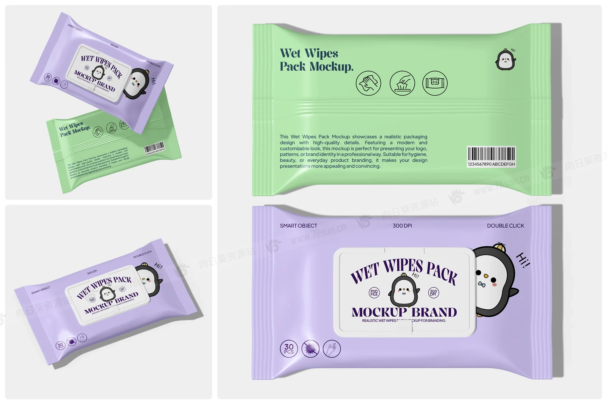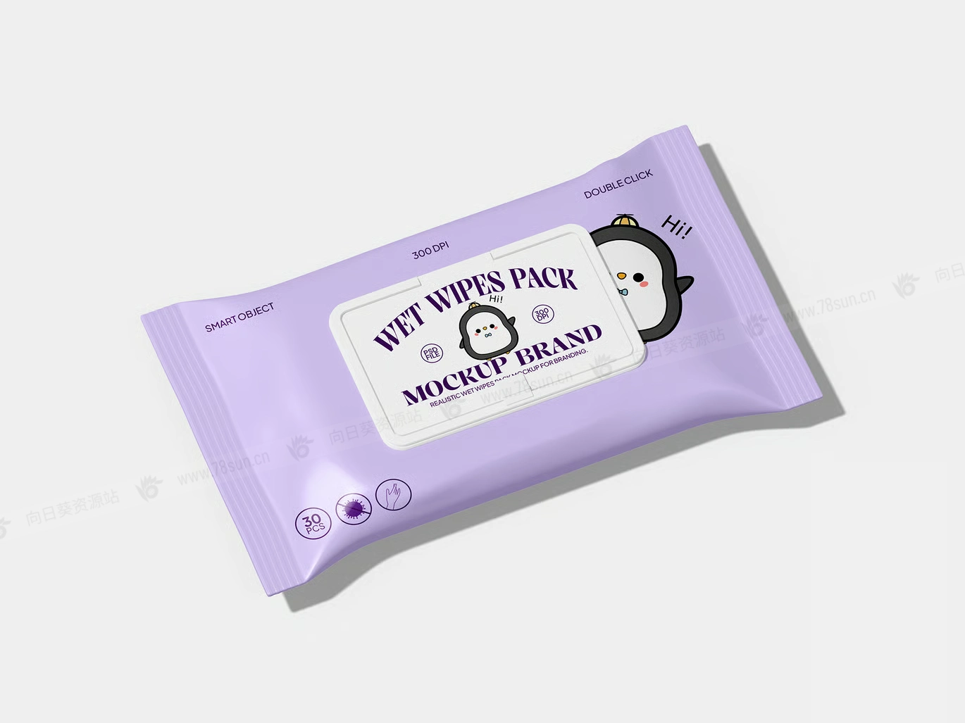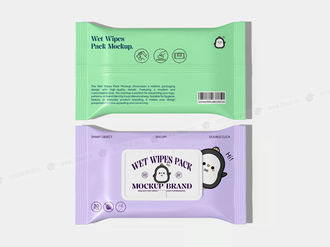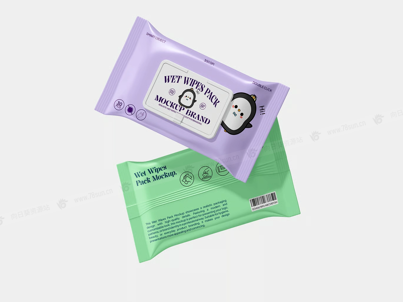 湿巾纸包装品牌VI效果图展示智能贴图psd设计样机,使用智能对象图层快速应用您的图稿,并自定义包颜色、纹理和背景以获得有凝聚力的外观。