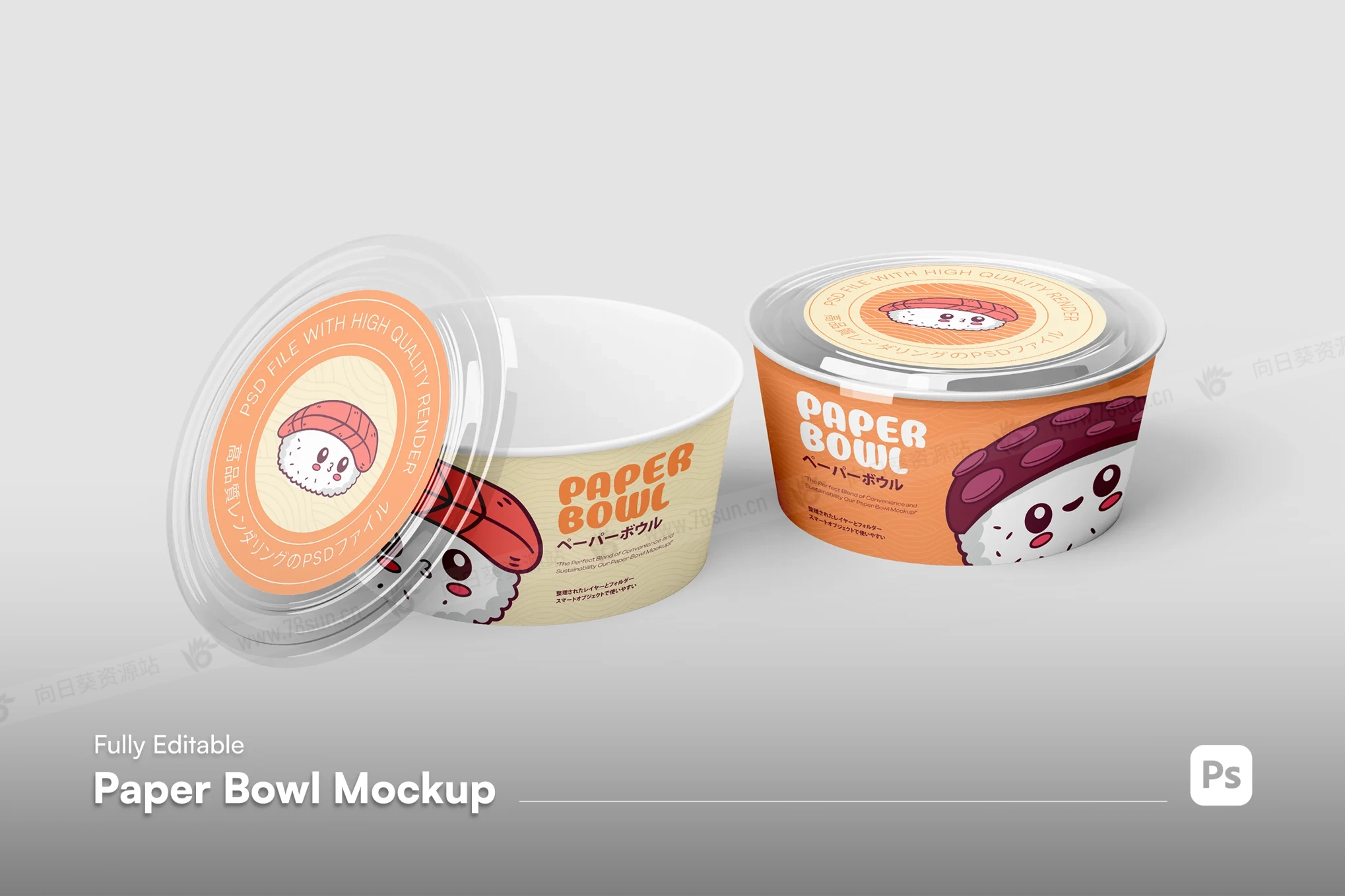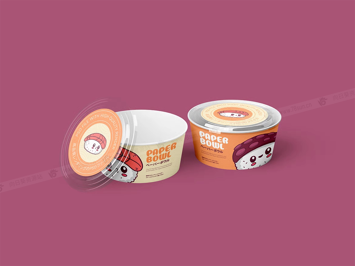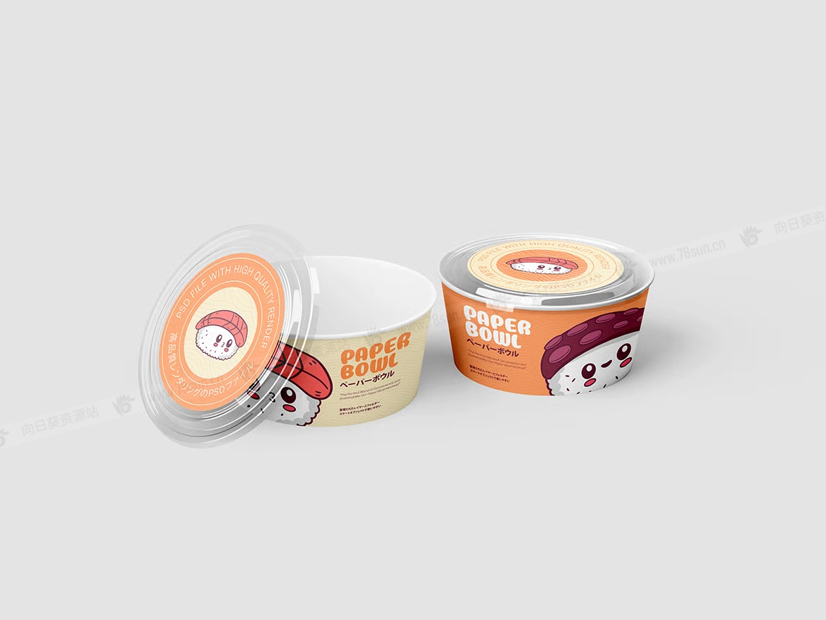 外卖食品纸碗品牌VI效果图展示智能贴图psd设计样机。智能对象图层可以轻松自定义设计,而高分辨率文件可确保逼真的结果。