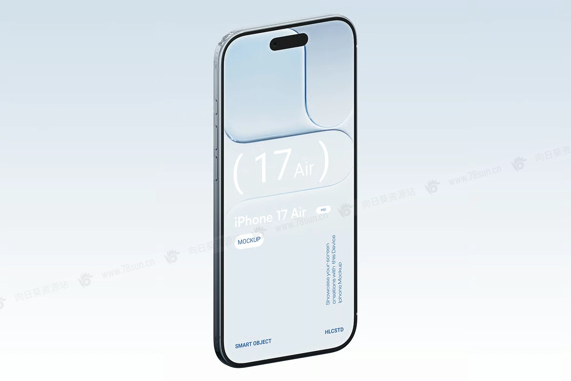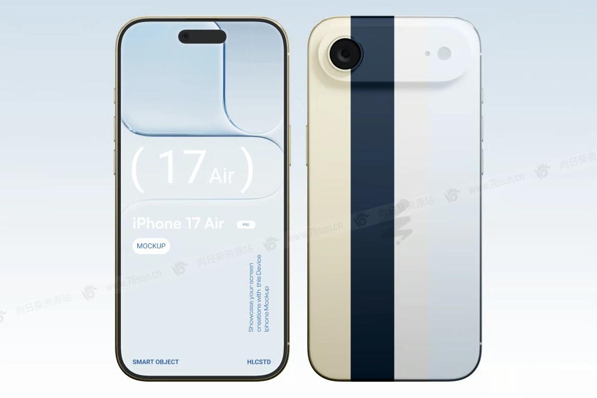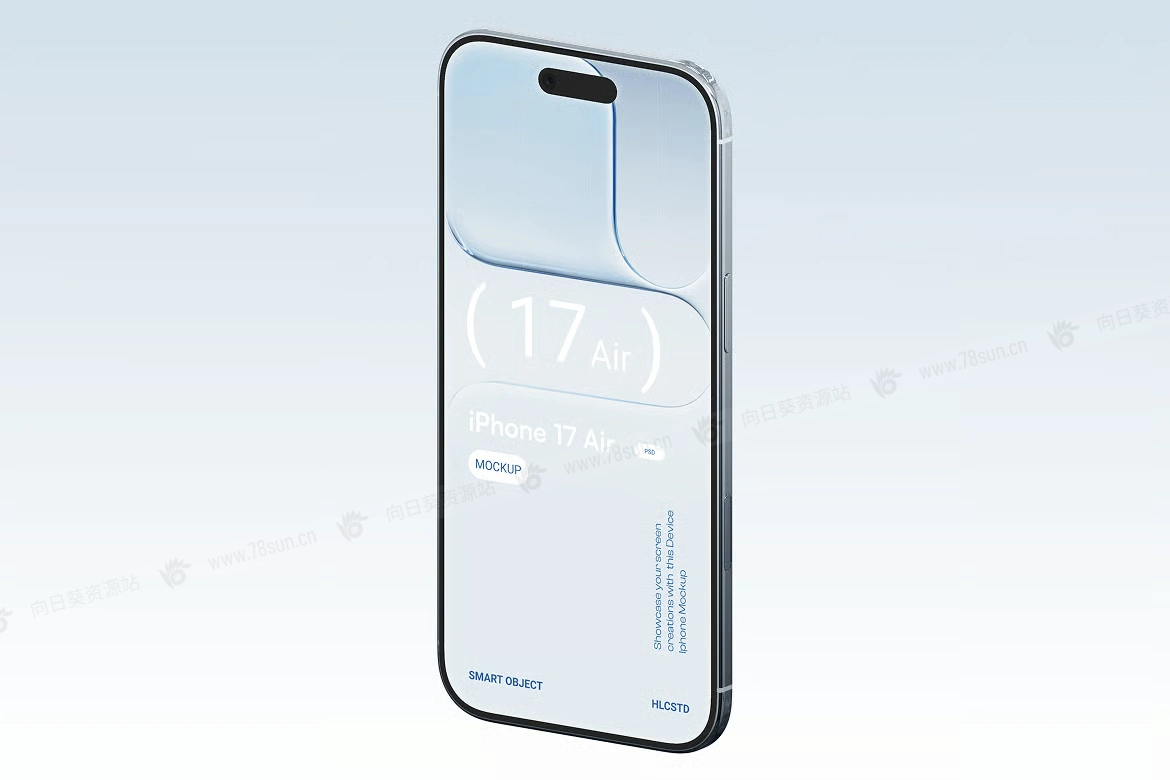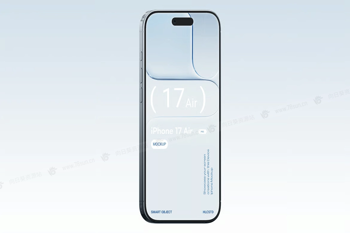 iPhone 17 Air苹果手机UI效果图展示智能贴图psd设计样机。使用这款高品质 iPhone 17 Pro 模型展示您的 UI/UX、应用程序设计或品牌演示。