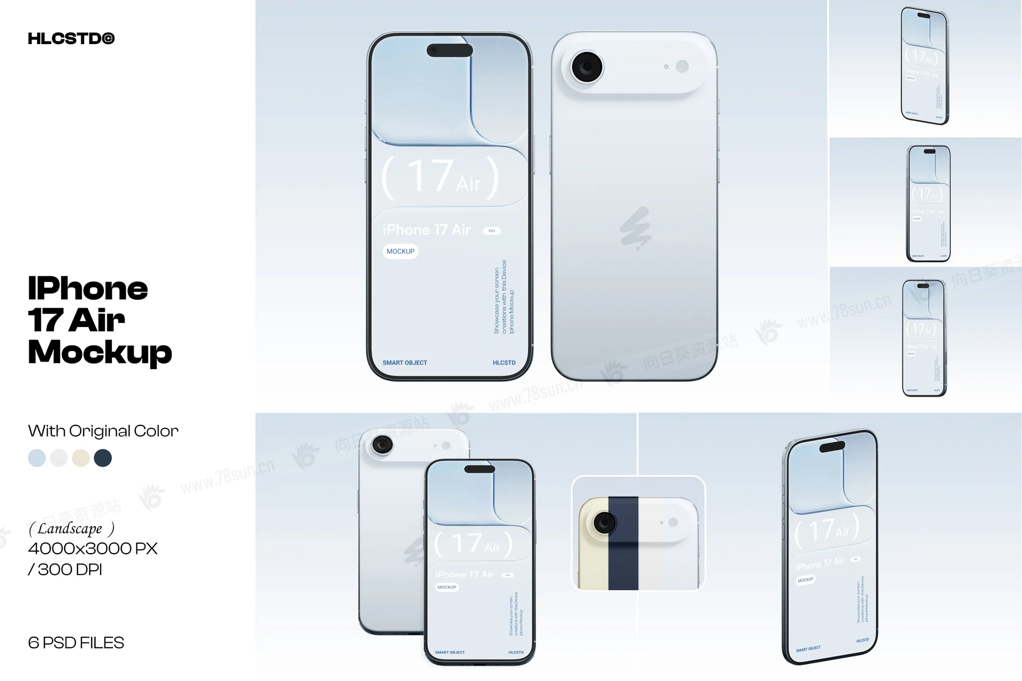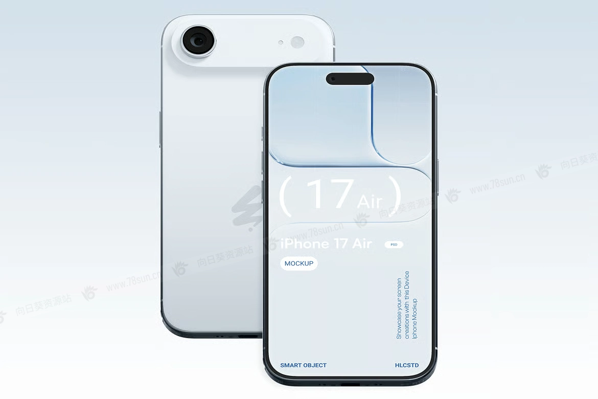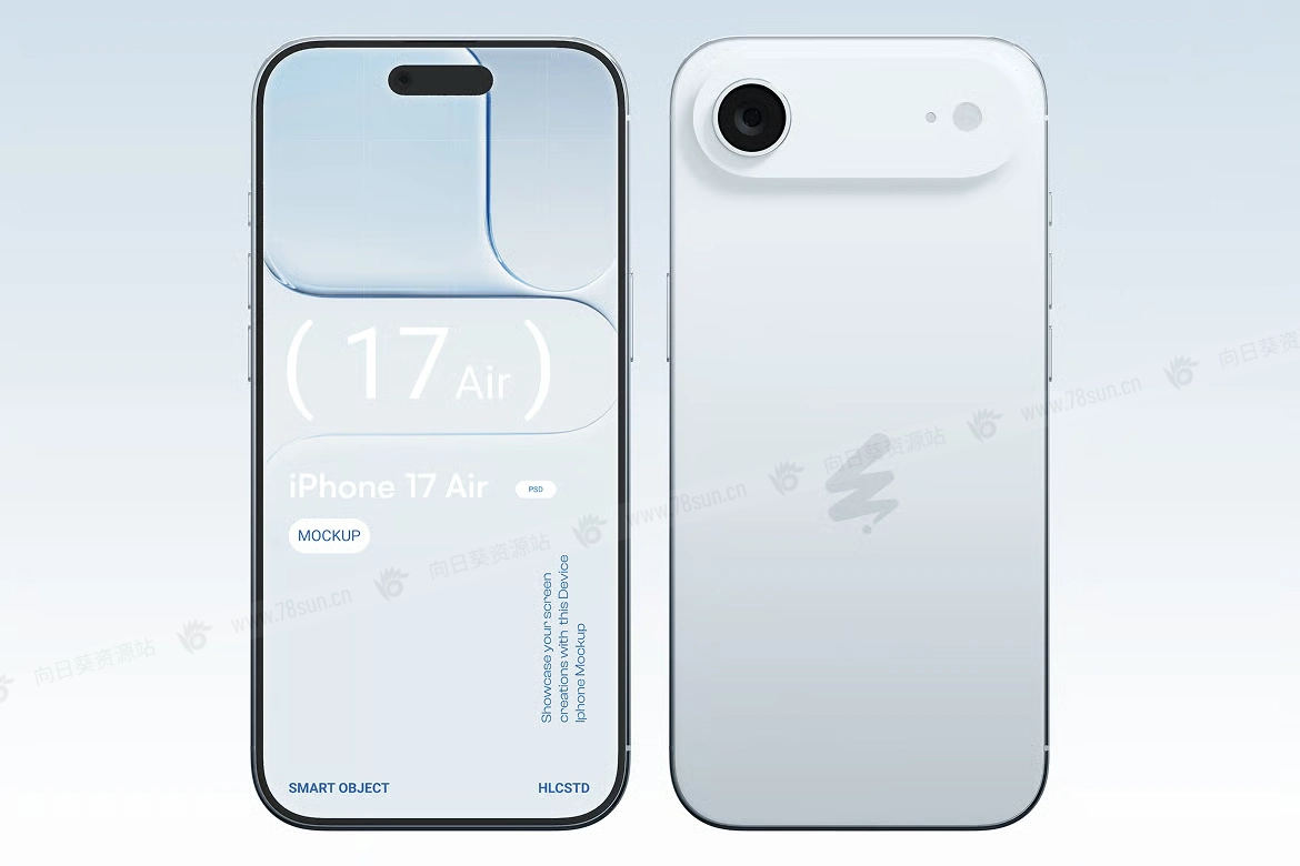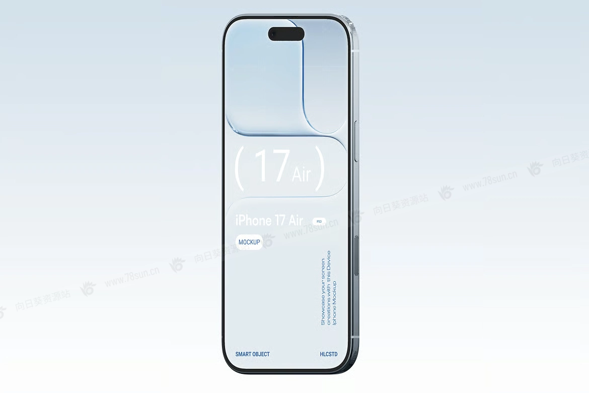 iPhone 17 Air苹果手机UI效果图展示智能贴图psd设计样机。使用这款高品质 iPhone 17 Pro 模型展示您的 UI/UX、应用程序设计或品牌演示。