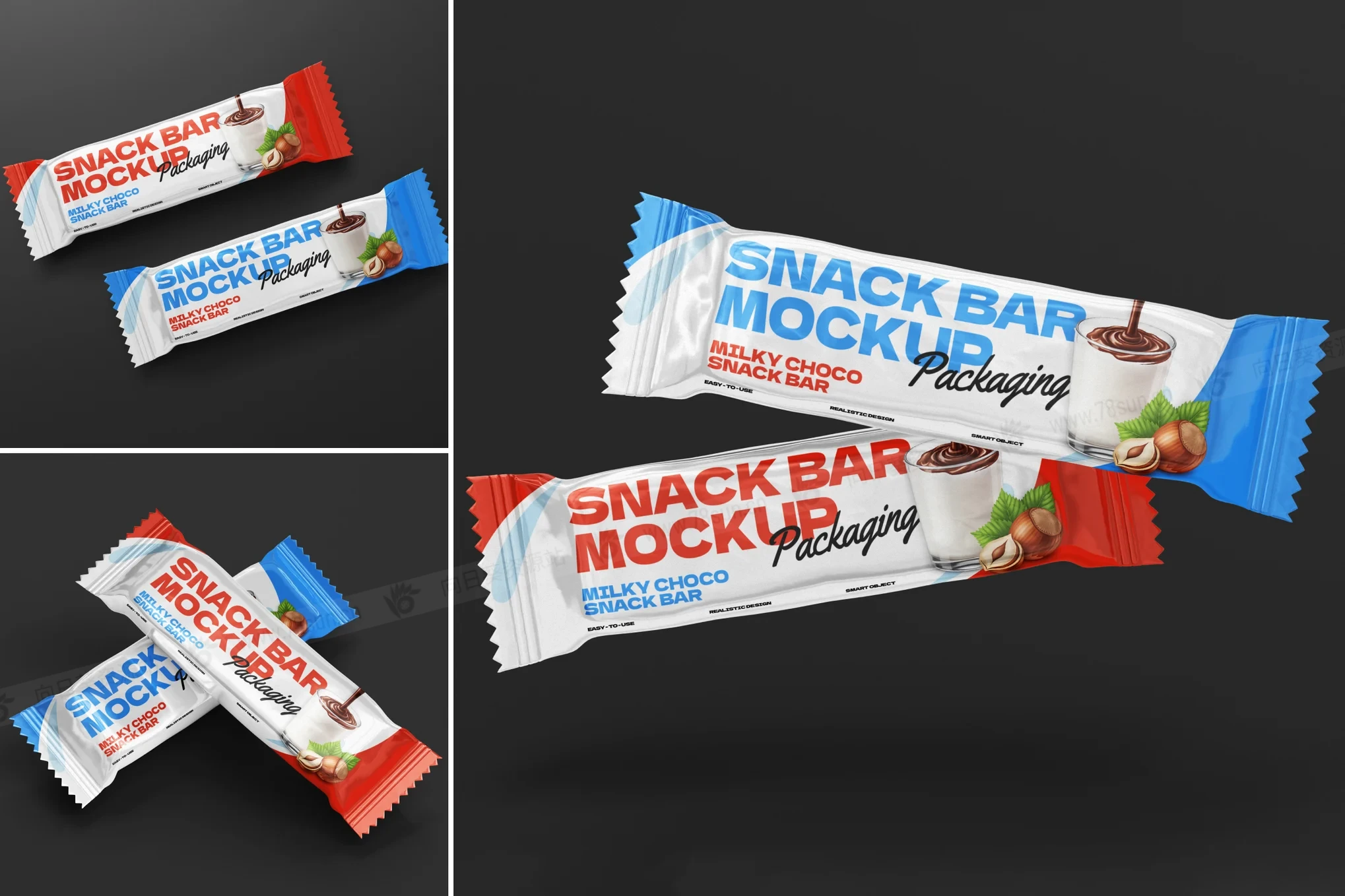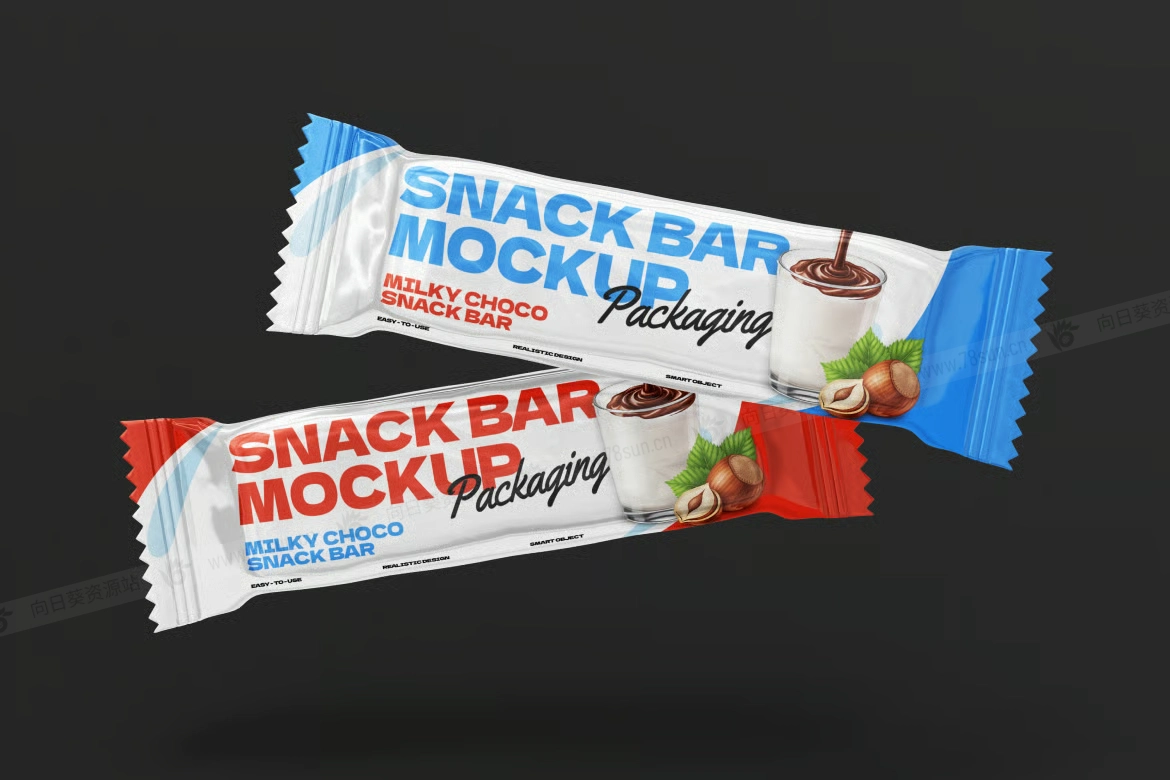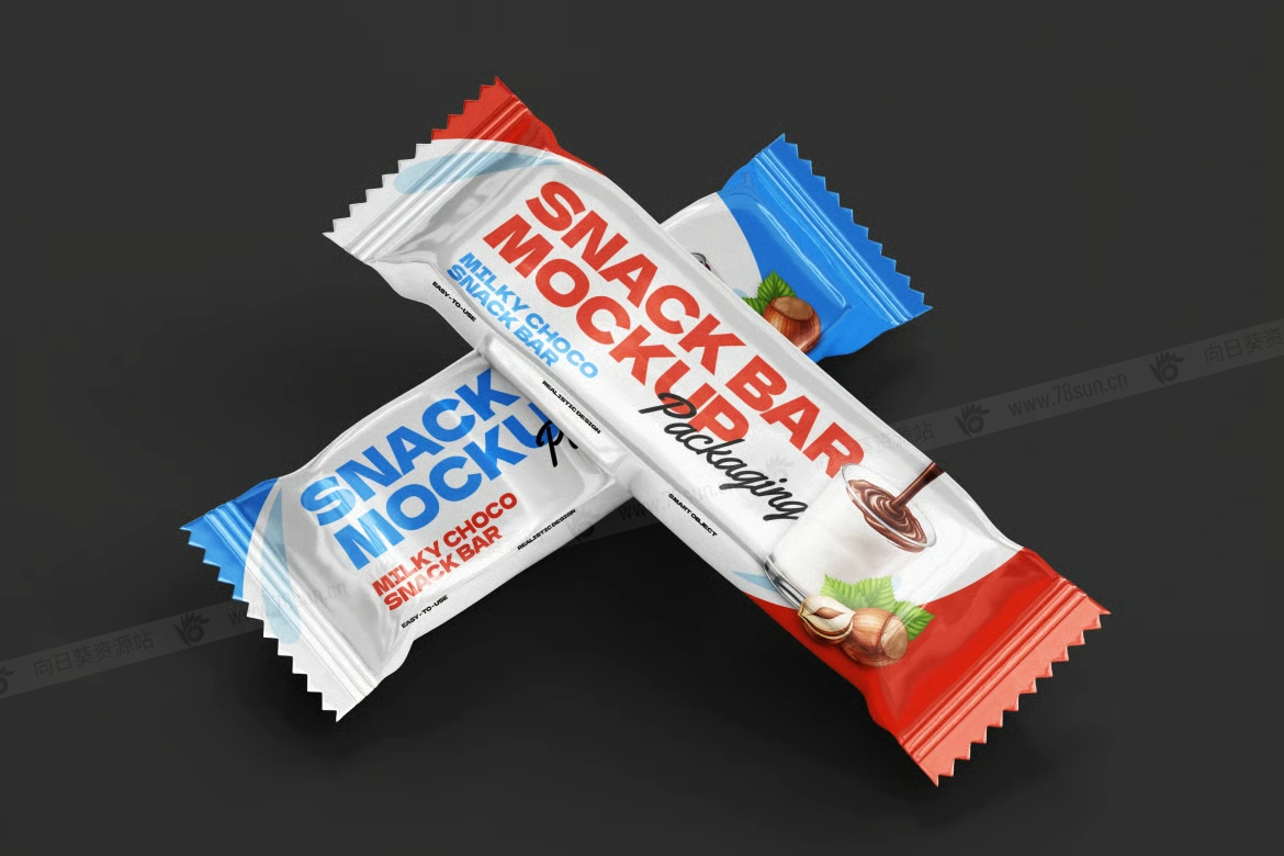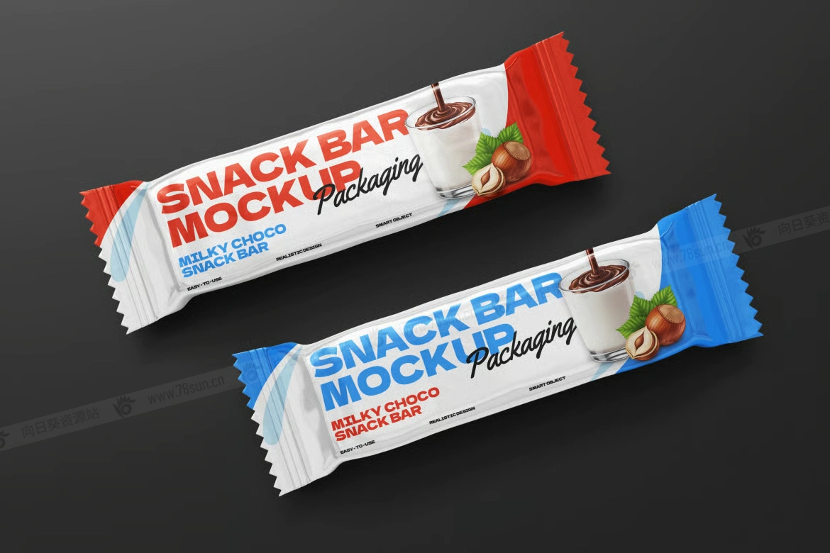 食品零食巧克力棒包装袋品牌VI效果图展示智能贴图psd设计样机。该模型采用高分辨率设计,具有分层 PSD 文件、易于编辑的智能对象以及可自定义的背景。它具有多个角度、自然的阴影和细致的纹理,提供了一种精致而真实的方式来突出您的零食包装设计。