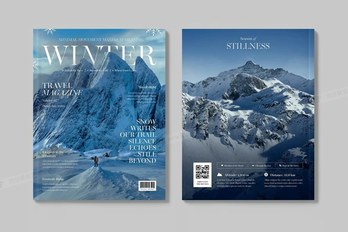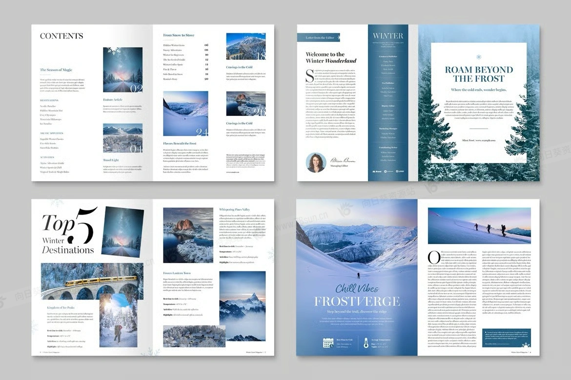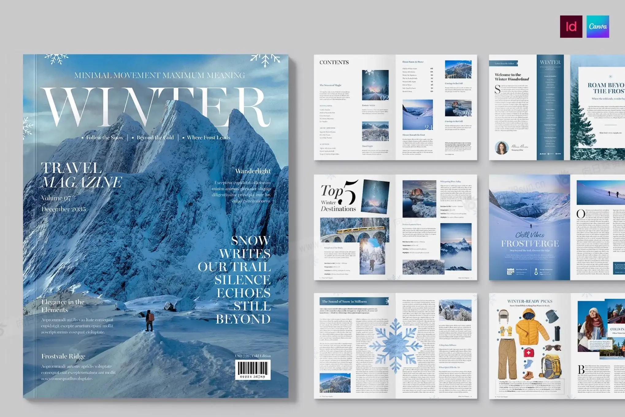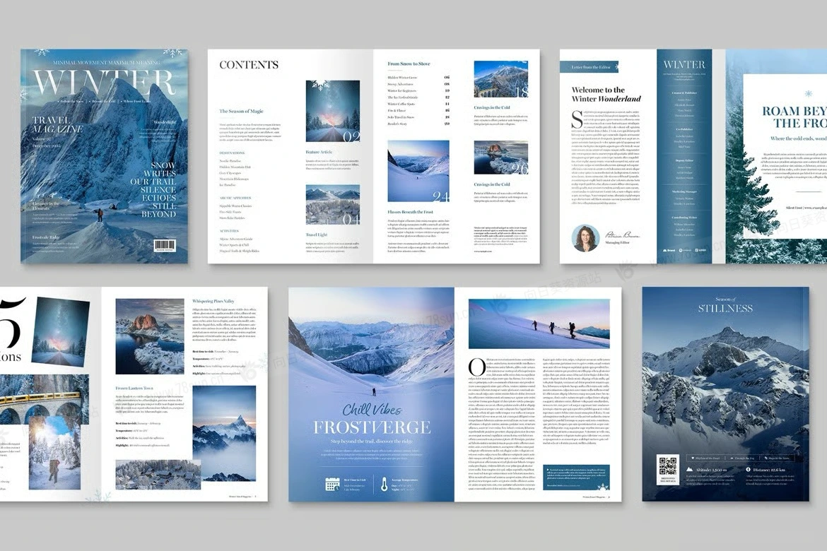 冬季旅游旅行社滑雪探险户外运动小册子杂志宣传册画册indd设计模板,InDesign IDML/INDD 展示了雪地度假、圣诞市场、滑雪、滑雪和雪上运动冒险。为旅游局、旅行社、户外品牌、度假村、博主和旅行社提供简洁的布局,如小册子、目录/目录、指南、行程、造型手册或活动计划。可编辑设计,可打印,数字友好。