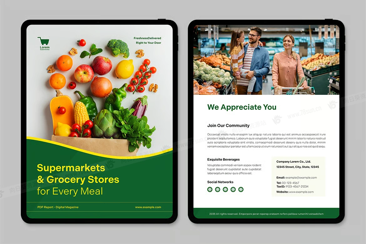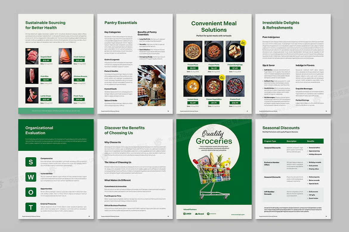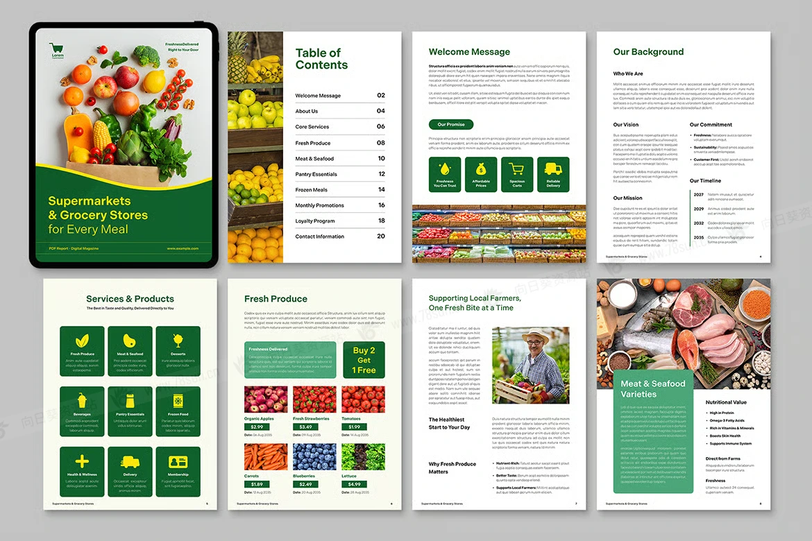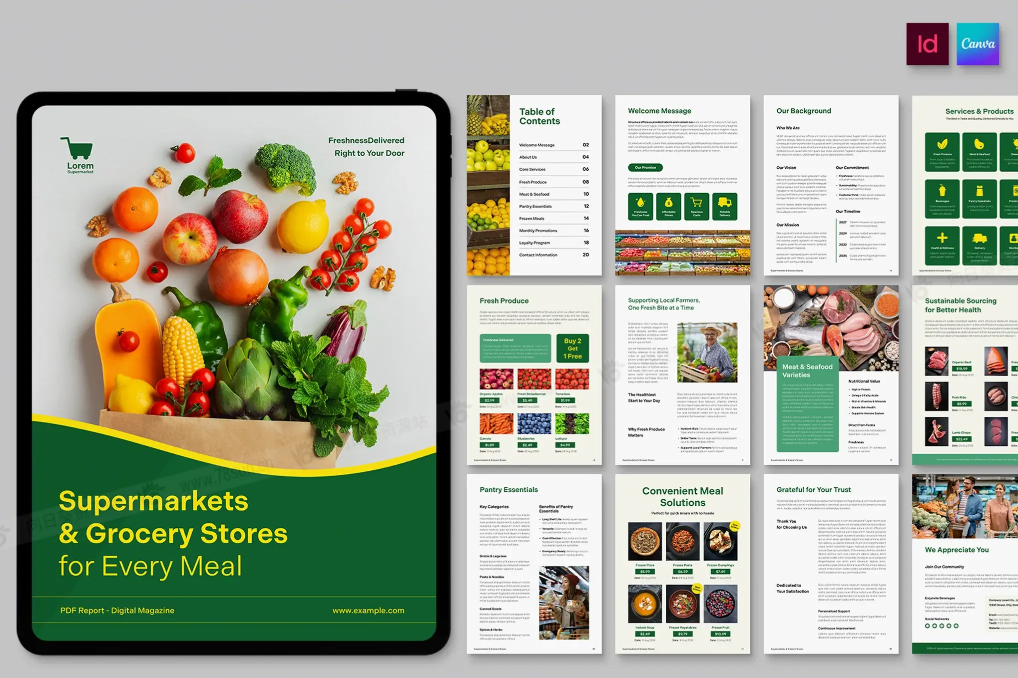 蔬果零售杂货店超市数字电子书小册子杂志宣传册画册indd设计模板。它以 Canva、InDesign IDML 和 InDesign INDD 形式提供,具有模块化布局和完全可编辑的文档样式。非常适合零售营销人员、杂货品牌、连锁超市、代理机构和非营利组织创建案例研究、公司简介、年度报告、研究文档或产品目录 – 快速获得专业结果。