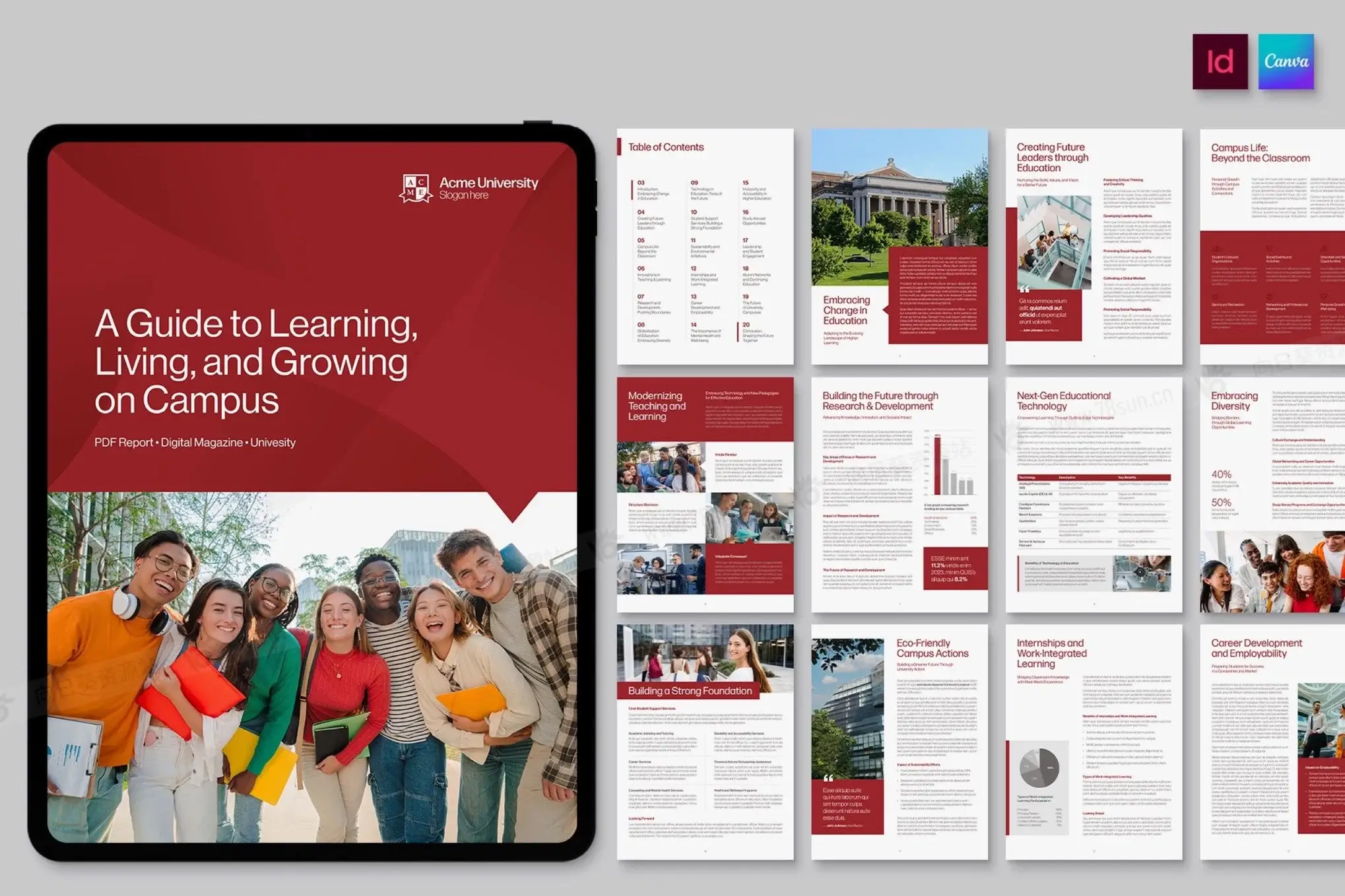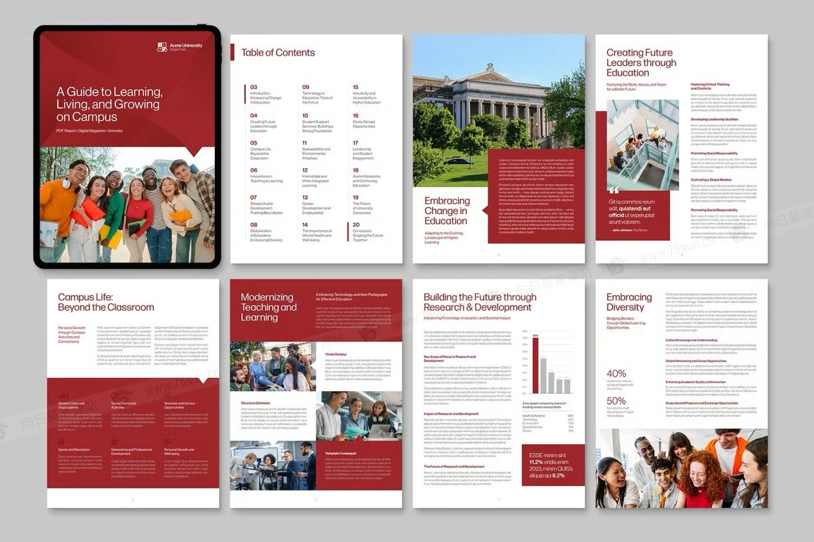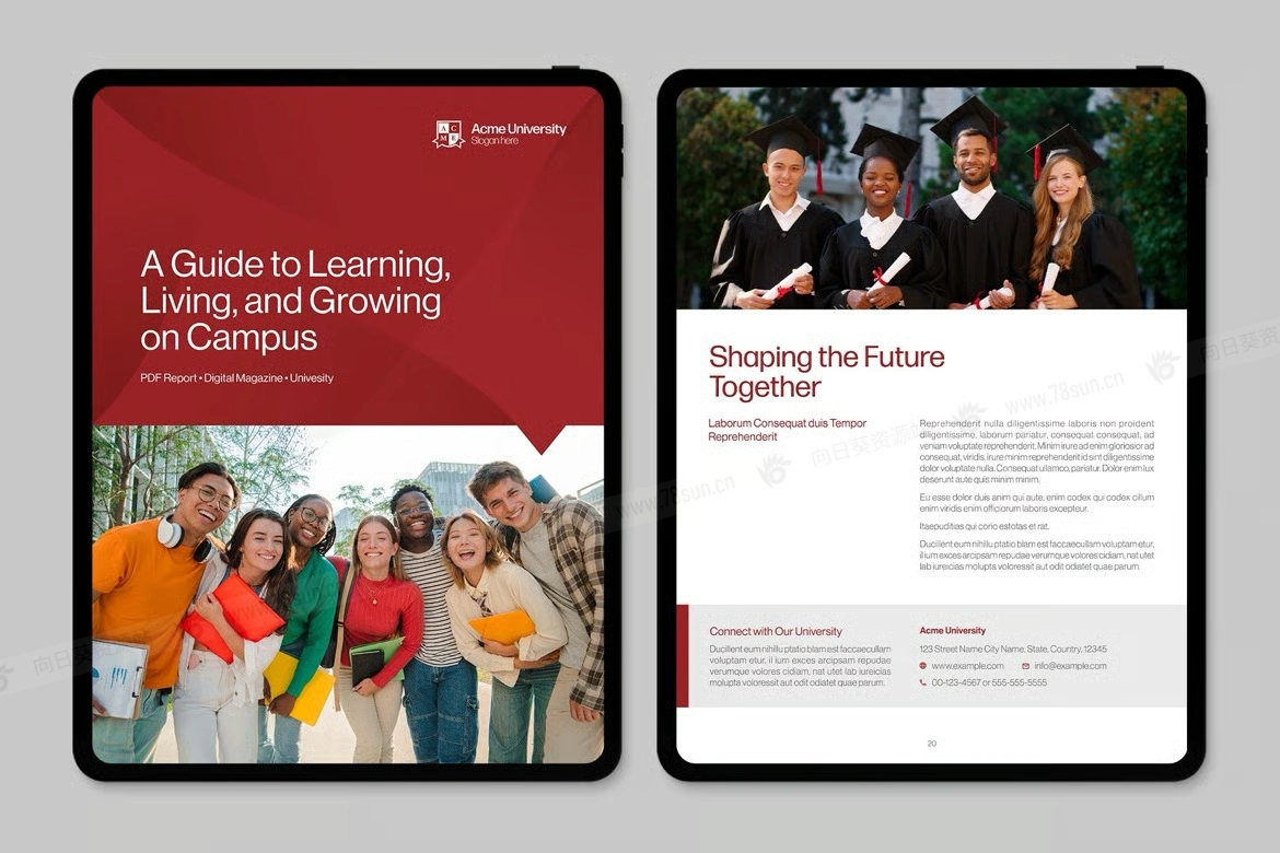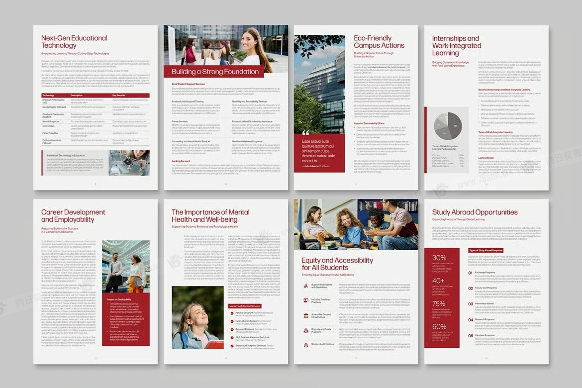 学校大学教育学术报告电子书数字小册子杂志宣传册画册indd设计模板。非常适合创建 PDF、杂志、电子书、报告、开放日计划的学院、学校和学术部门。简洁的布局、灵活的网格和样式简化了招生指南、课程列表、研究文件、校友通讯和会议材料。非常适合需要专业、可编辑文档模板的营销团队、注册商和传播办公室。