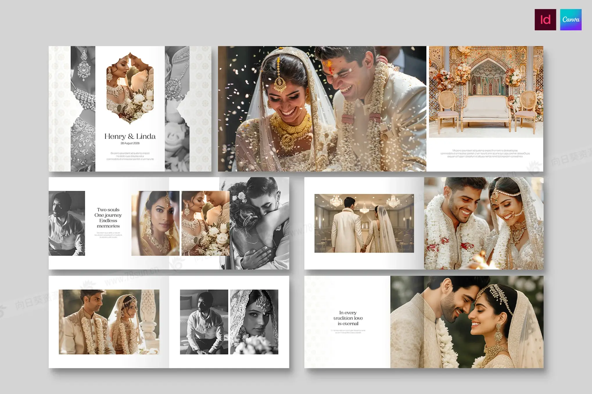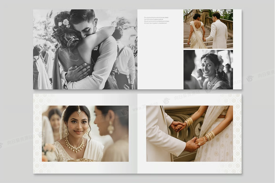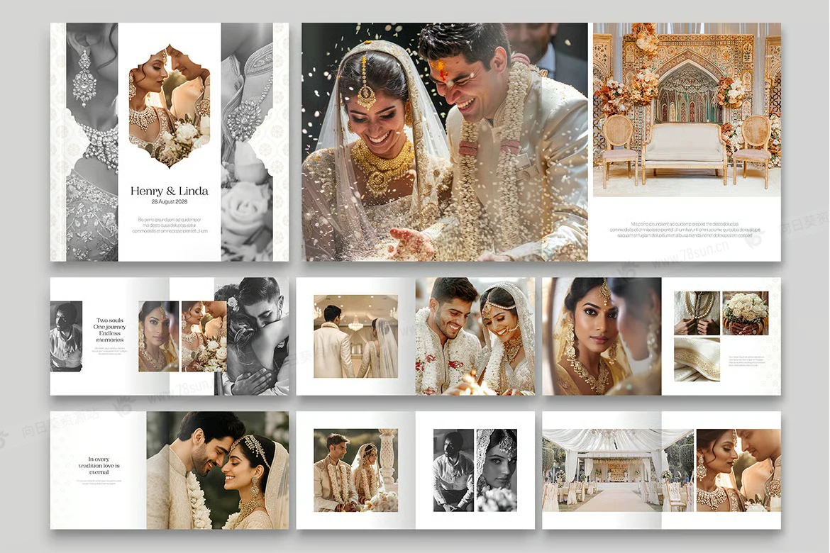 印度婚礼相册模板,带有曼陀罗图案和拱形图像蒙版的横向布局— 用于捕捉仪式、订婚会议、曼海蒂、桑吉特和招待会亮点的豪华风景相册设计。