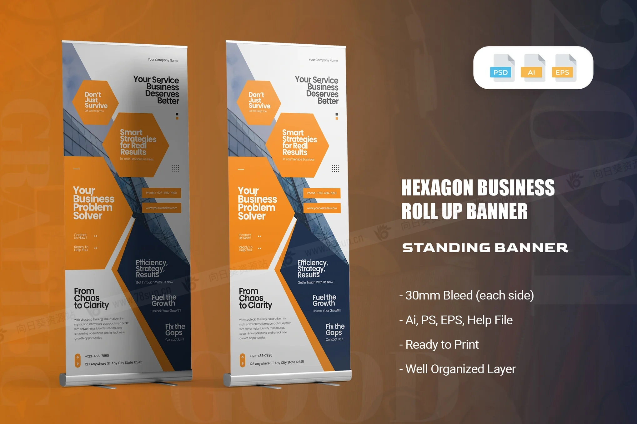 商务公司简介宣传活动展架易拉宝psd ai设计模板。这种布局适用于任何项目目的。非常易于使用和定制。