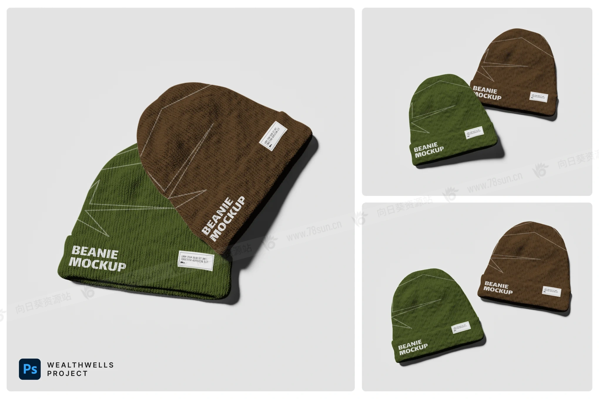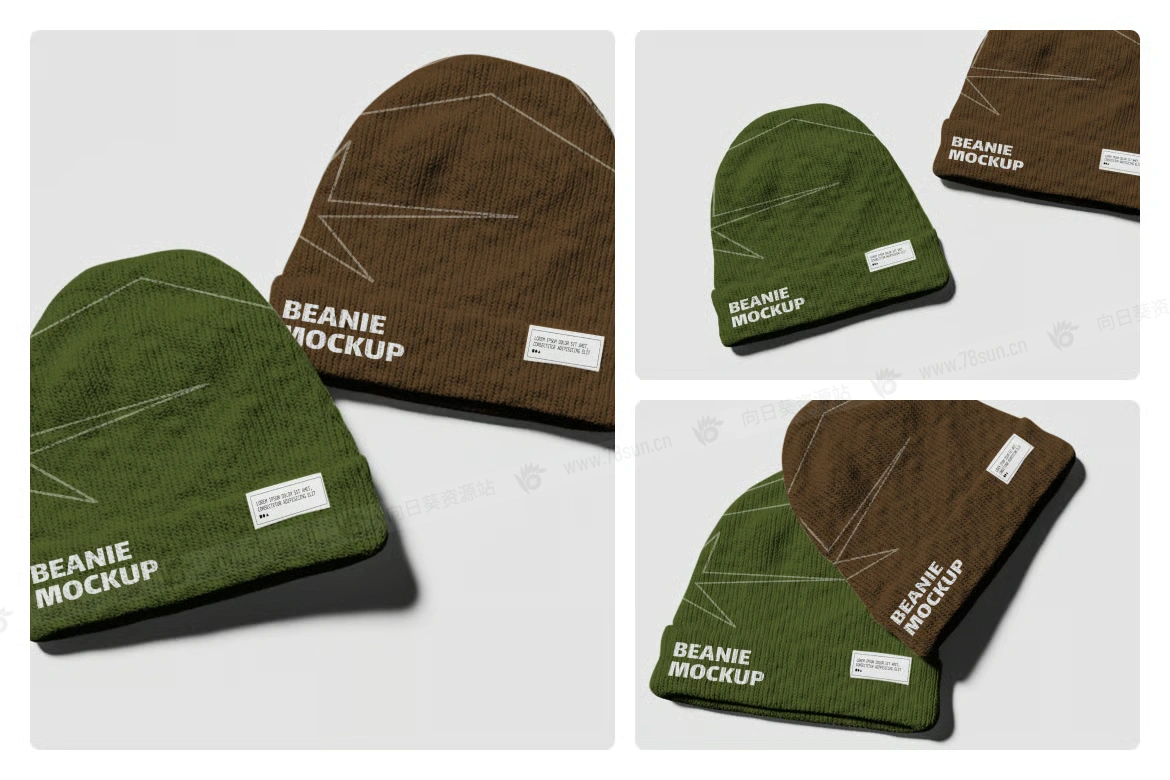 羊毛无檐小便帽毛线帽子VI效果图展示智能贴图psd设计样机,两件橄榄绿和棕色色调的逼真罗纹针织无檐小便帽的俯视图模型,这款PSD文件具有可编辑的标签和详细的纹理织物,非常适合品牌推广、时装设计演示和商品展示。