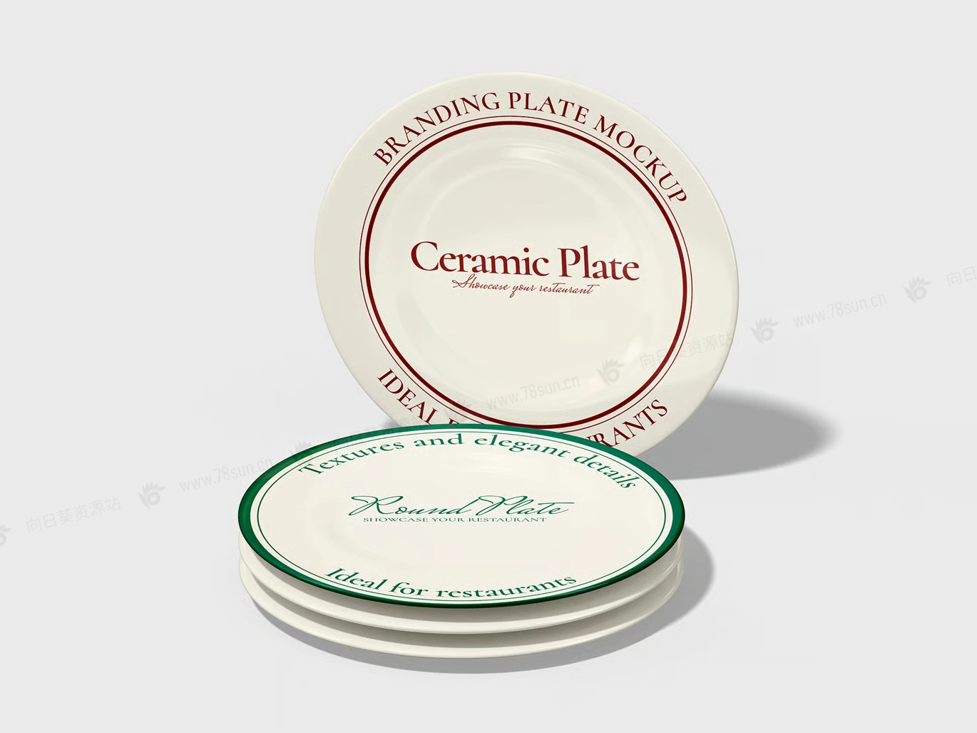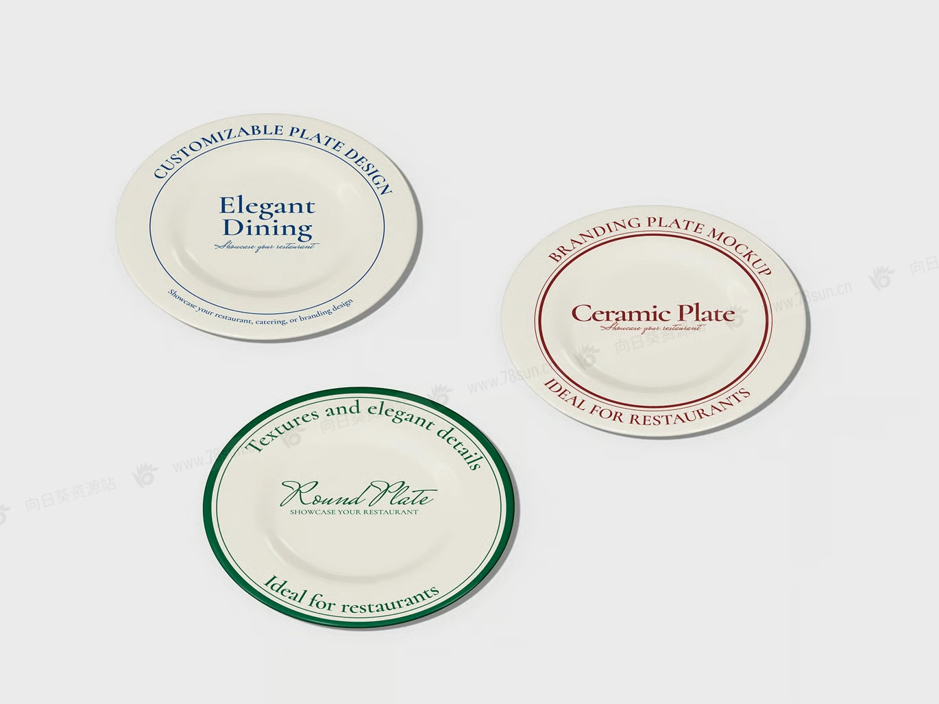 陶瓷盘子碗碟品牌VI效果图展示智能贴图psd设计样机,使用智能对象图层插入您的设计并轻松定制盘或背景的颜色。