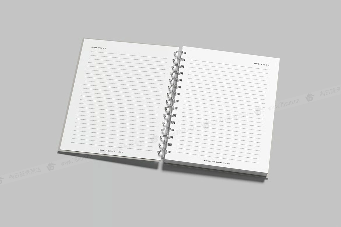 线圈装订螺旋笔记本日记本品牌VI效果图展示智能贴图psd设计样机,该模型包括 04 个带有分层良好 PSD 文件,并且该模型还使用智能对象功能,这意味着您可以在几秒钟内轻松快速地使用自己的设计更改当前设计。