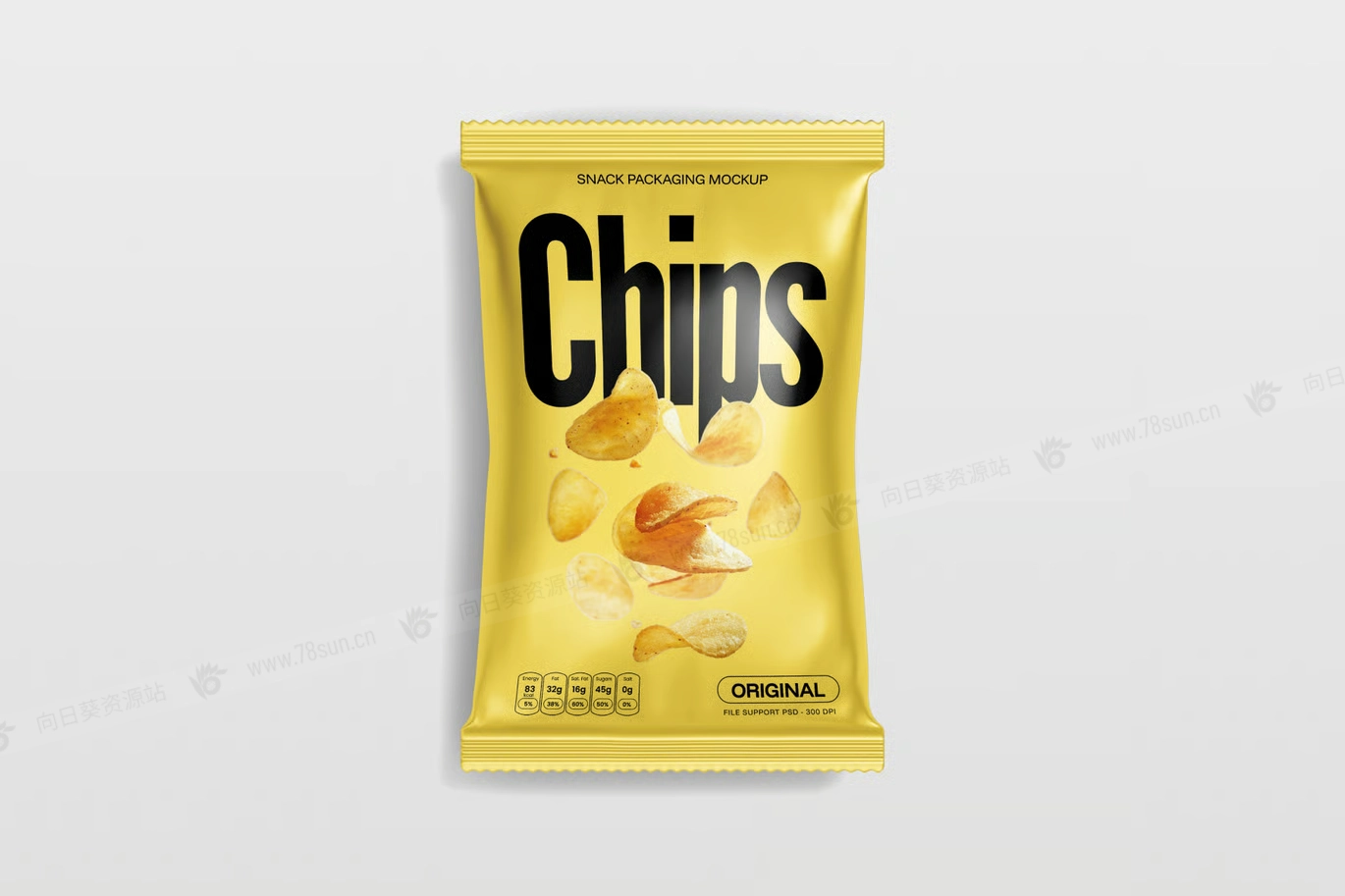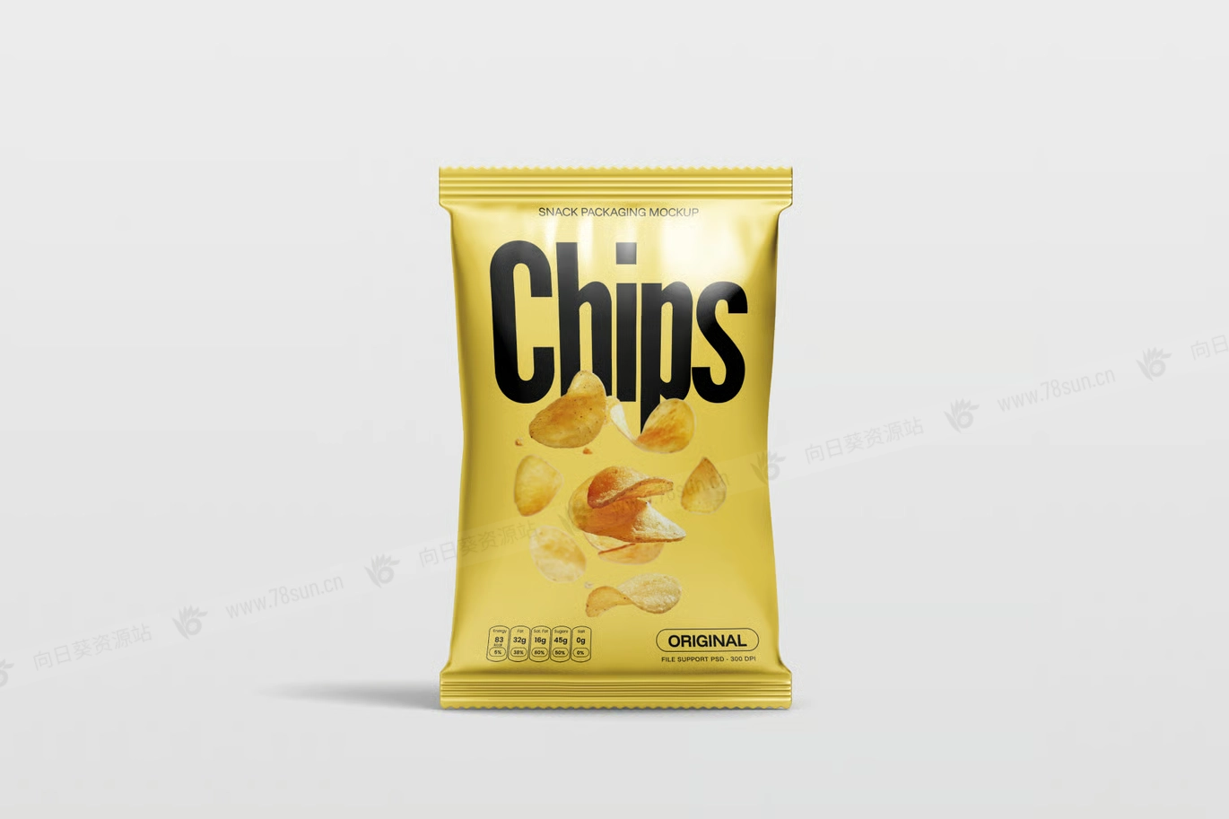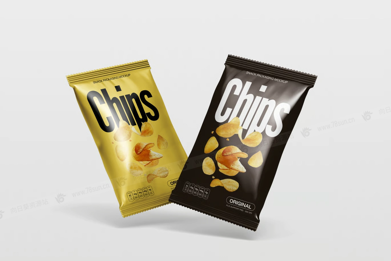 零食薯片薯条膨化食品包装袋品牌VI效果图展示智能贴图psd设计样机,模特图像和照片仅供演示之用,不包含在您的商品中。