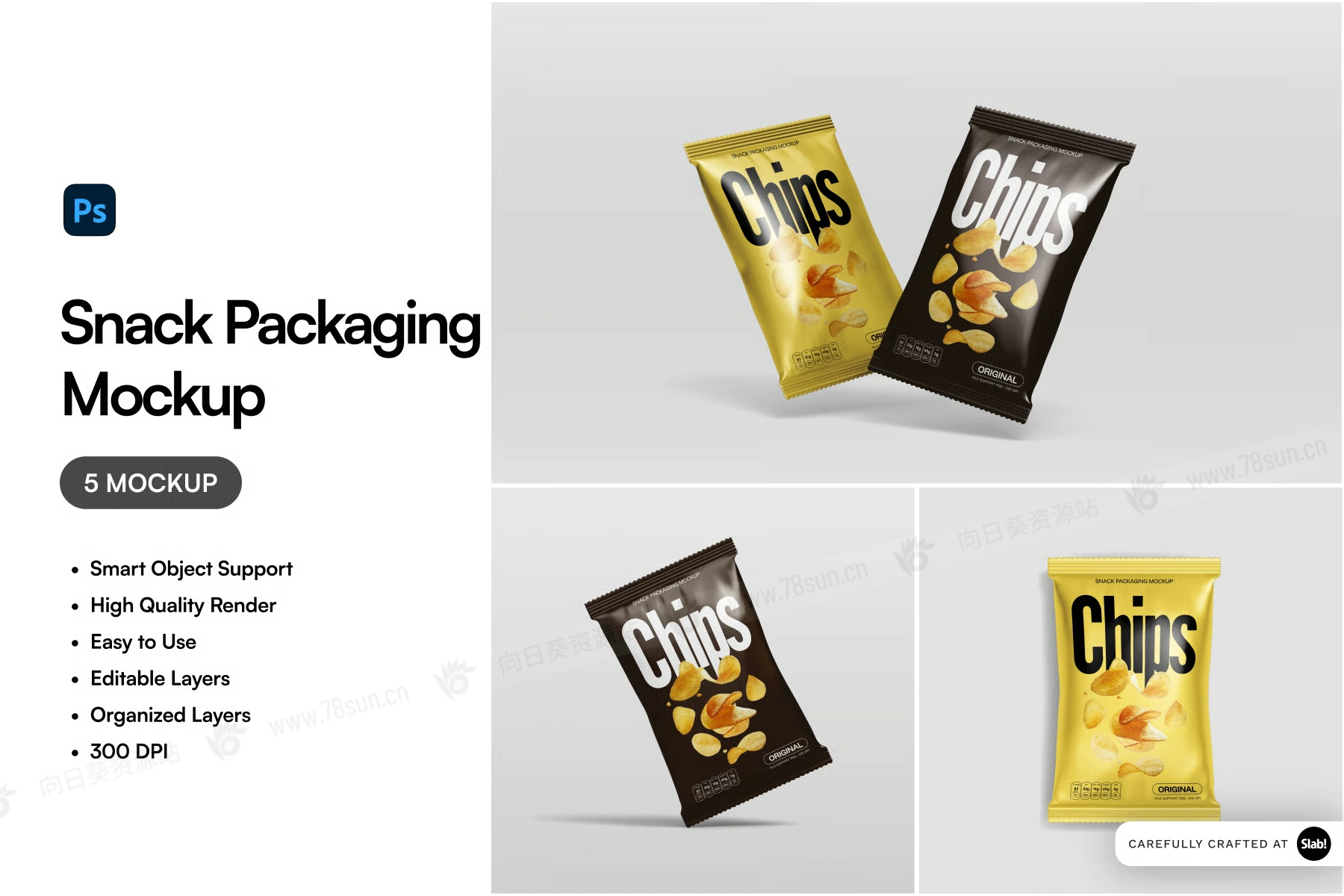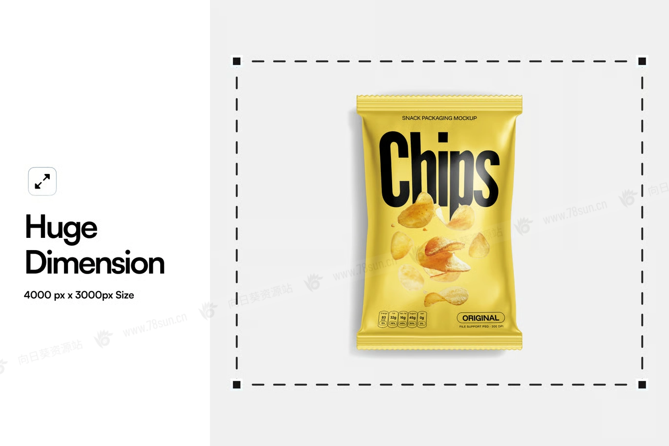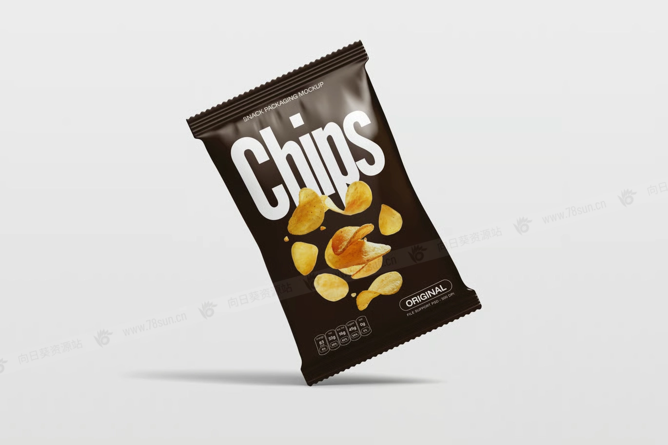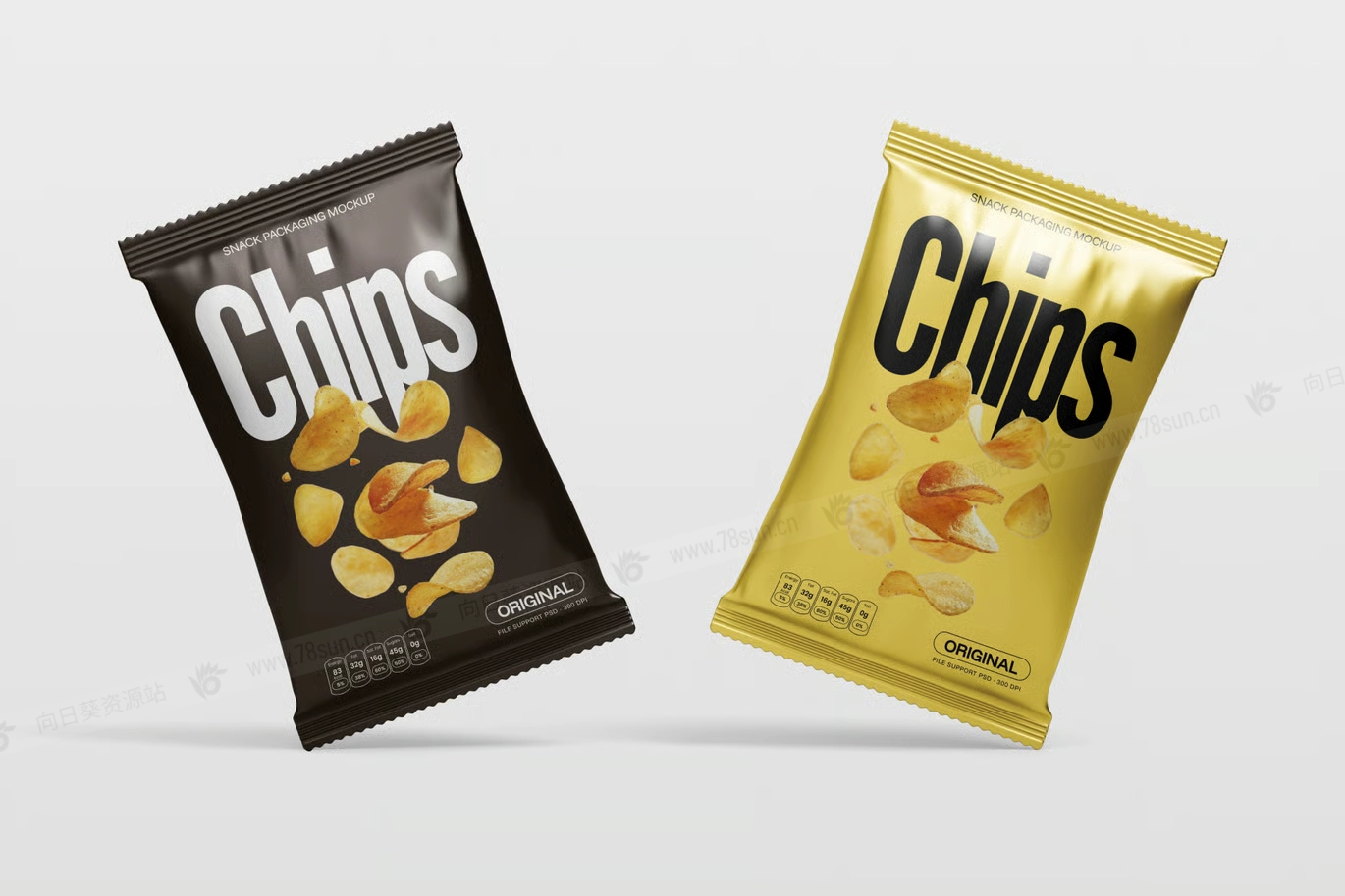 零食薯片薯条膨化食品包装袋品牌VI效果图展示智能贴图psd设计样机,模特图像和照片仅供演示之用,不包含在您的商品中。