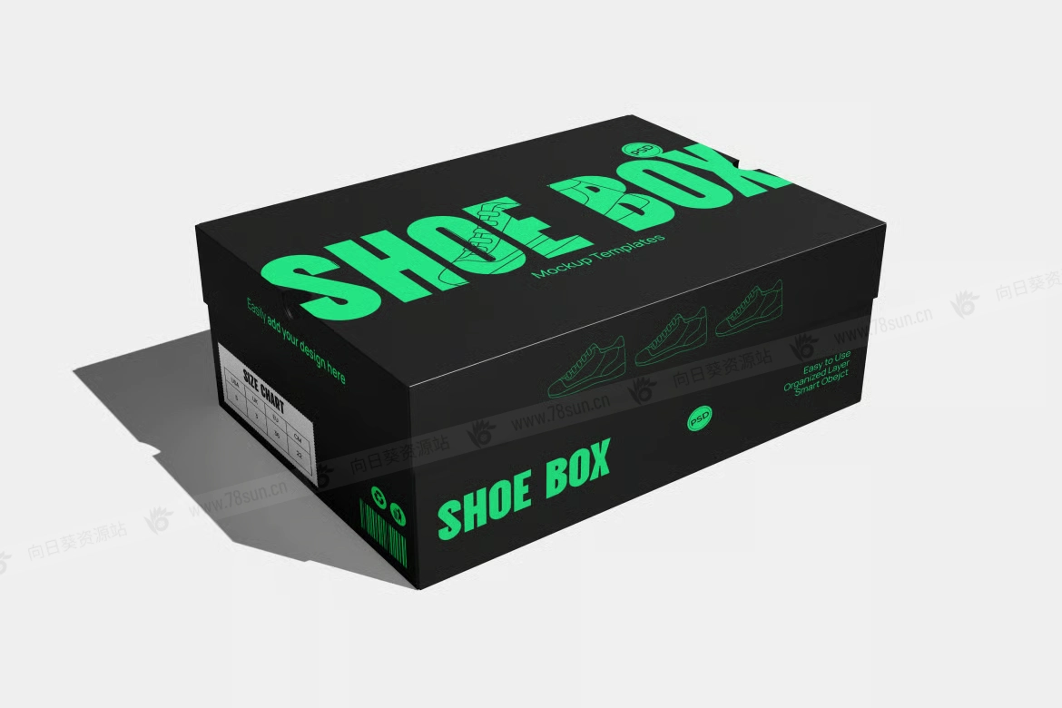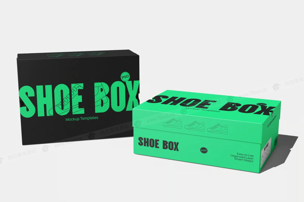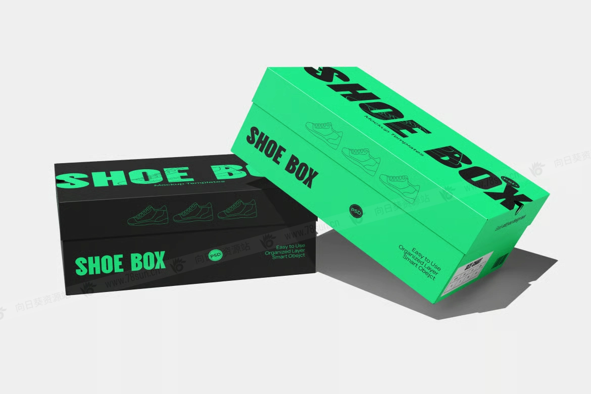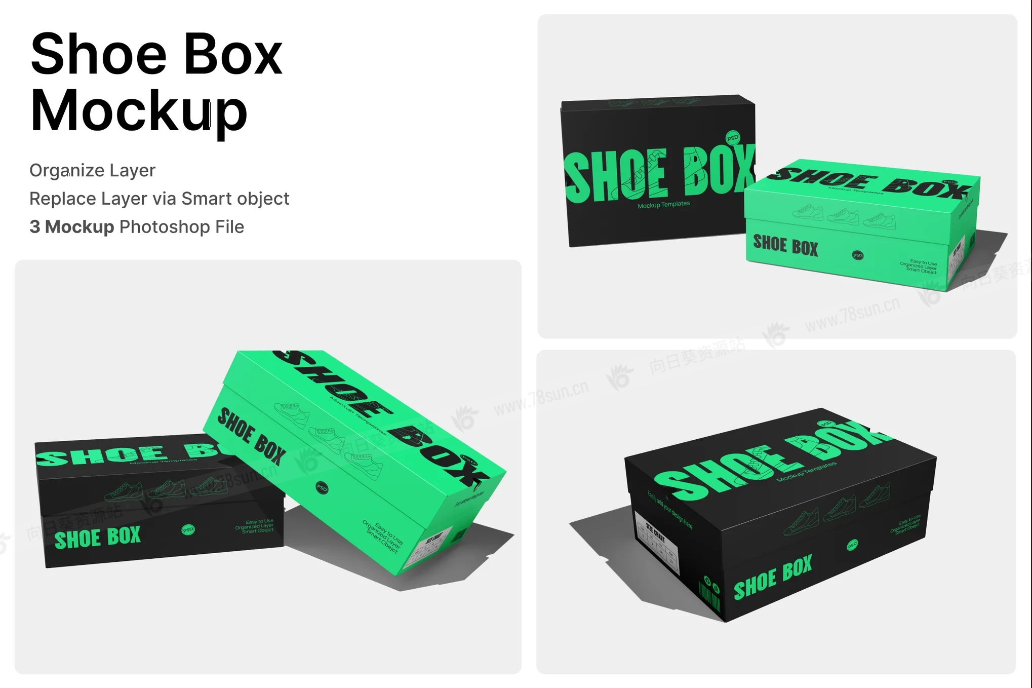 鞋子包装纸盒品牌VI效果图展示智能贴图psd设计样机.该模板包含 3 个高质量的 Photoshop 模型,可让您通过智能对象轻松替换图层,