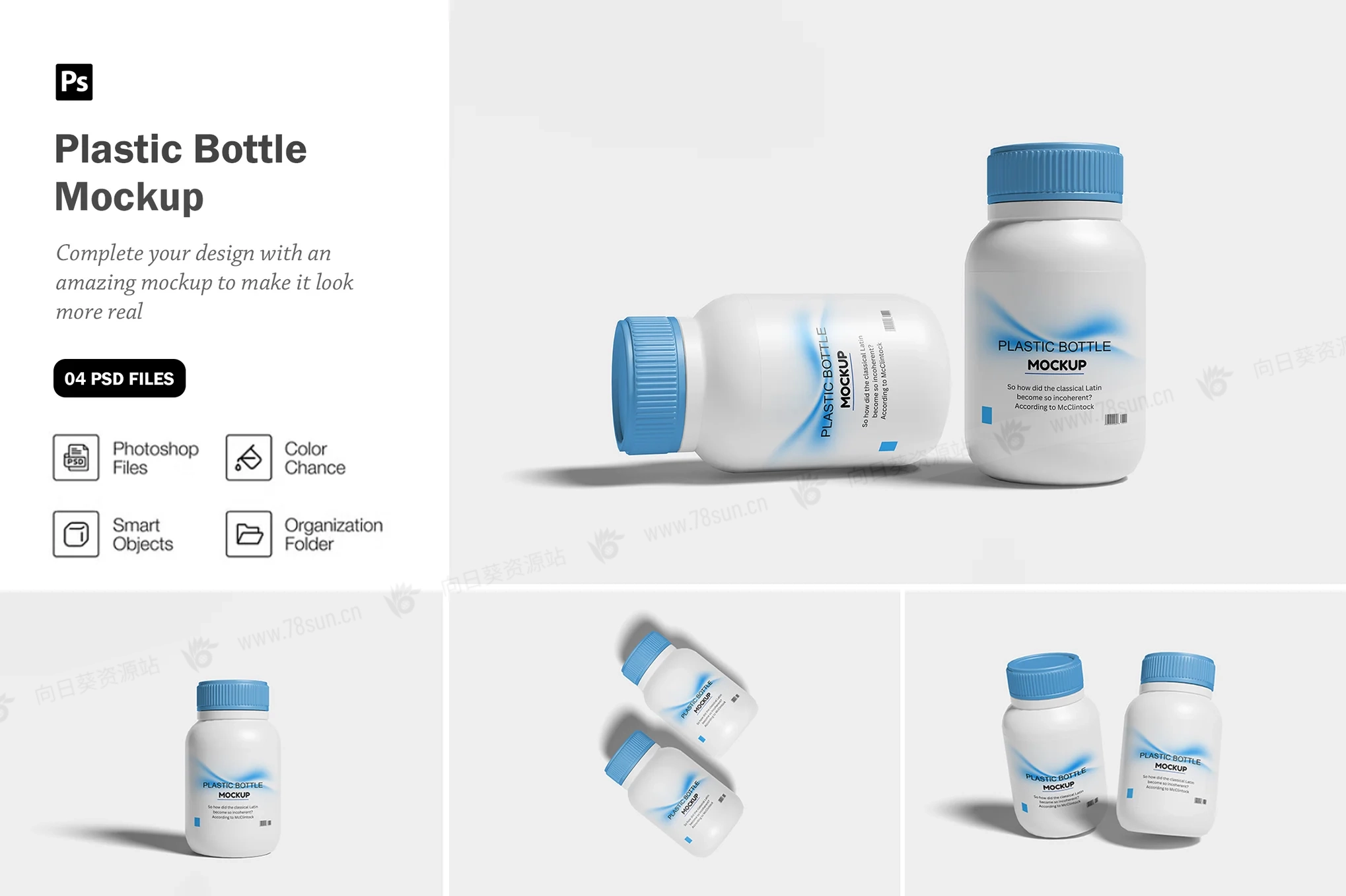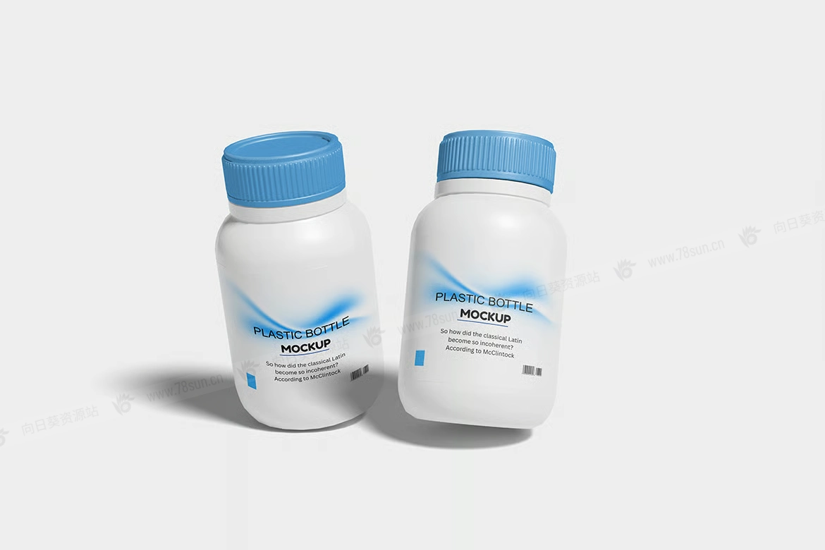 医疗药瓶塑料瓶品牌VI效果图展示智能贴图psd设计样机。该模型包括 4 个带有分层良好 PSD 文件,并且该模型还使用智能对象功能,这意味着您可以在几秒钟内轻松快速地使用自己的设计更改当前设计。