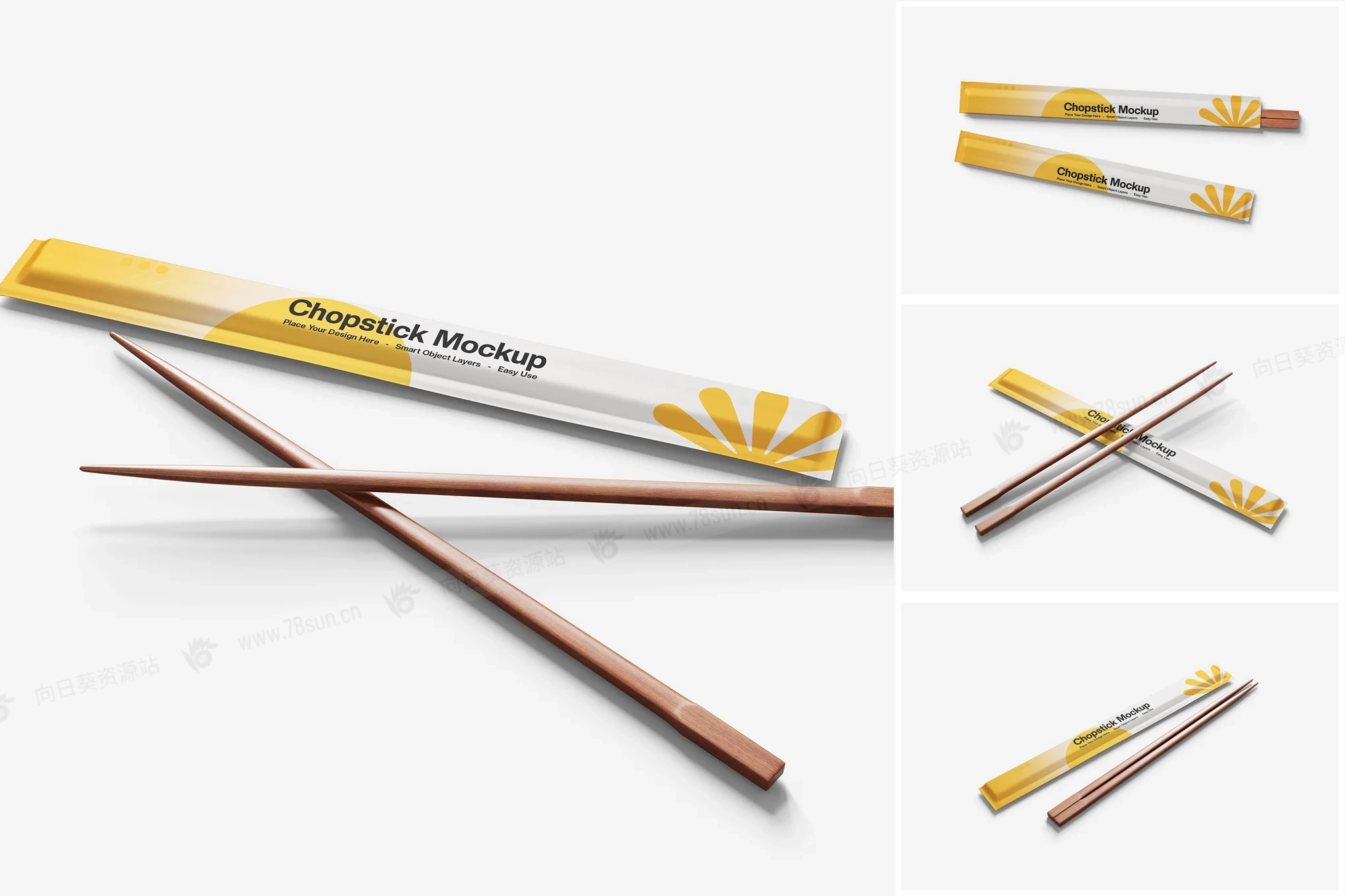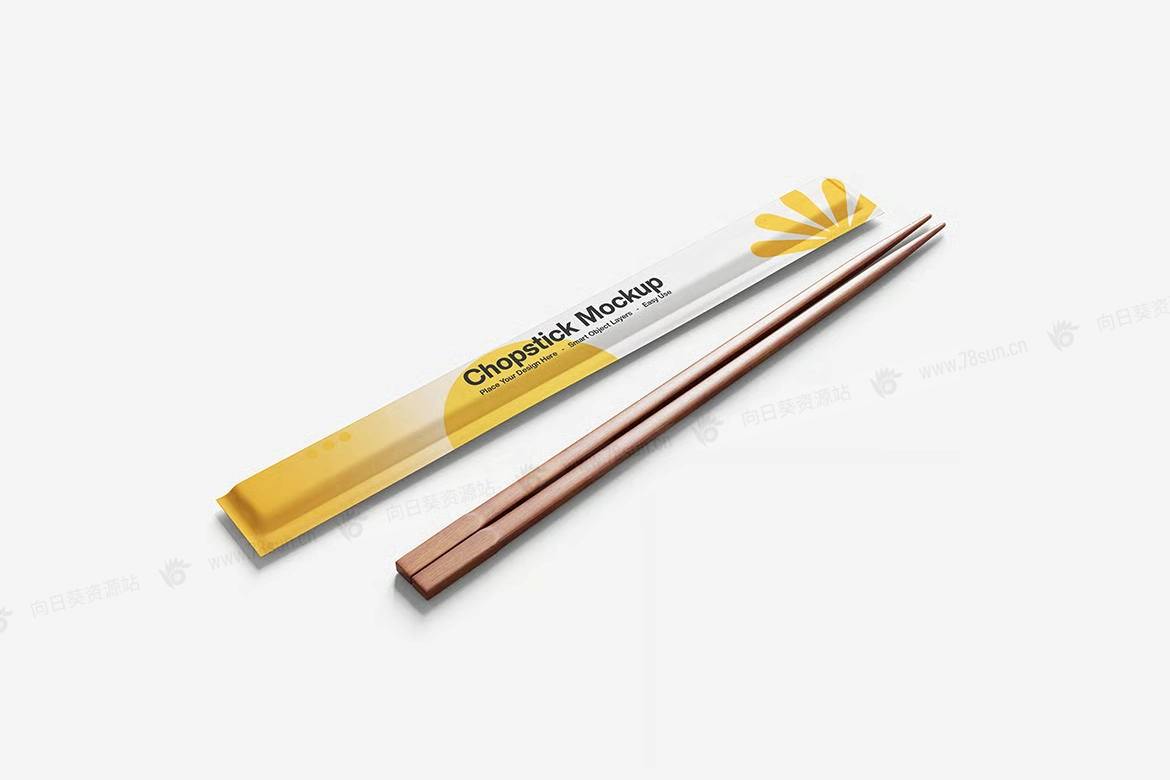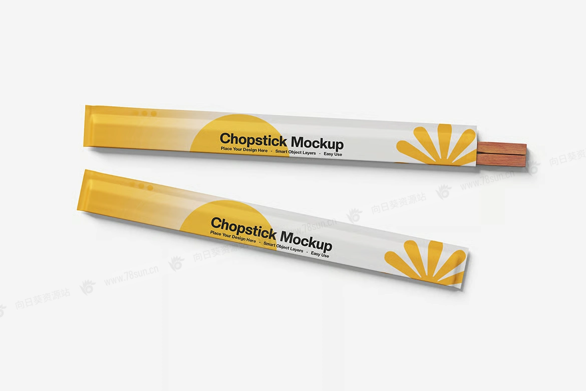 筷子包装纸袋品牌VI效果图展示智能贴图psd设计样机。使用智能对象轻松替换您的设计,双击智能图层,复制并粘贴您的图稿,保存即可完成!