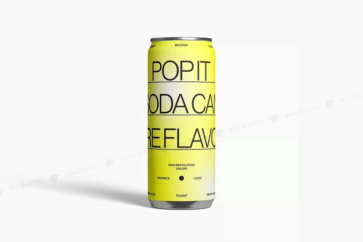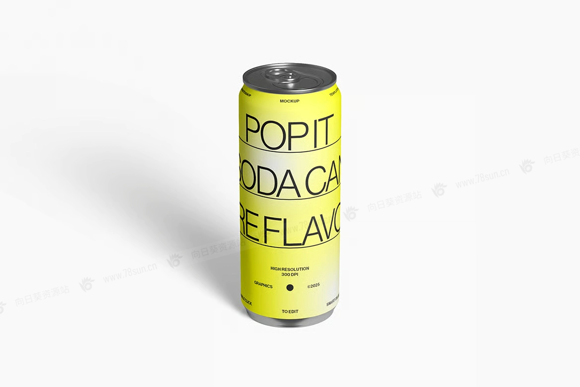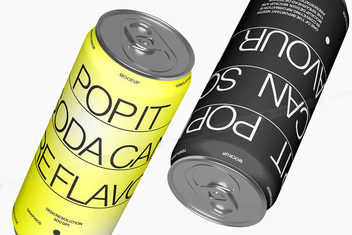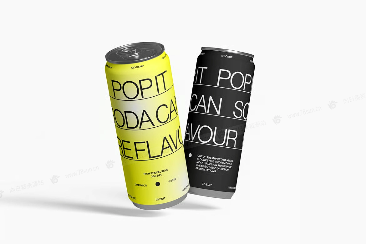 汽水饮料易拉罐头品牌VI效果图展示智能贴图psd设计样机,逼真的高脚汽水罐模型具有可自定义的背景颜色和智能对象,可轻松更换设计。