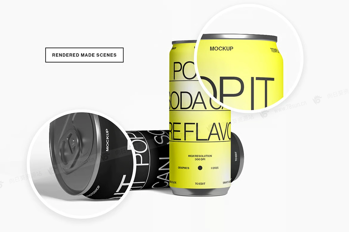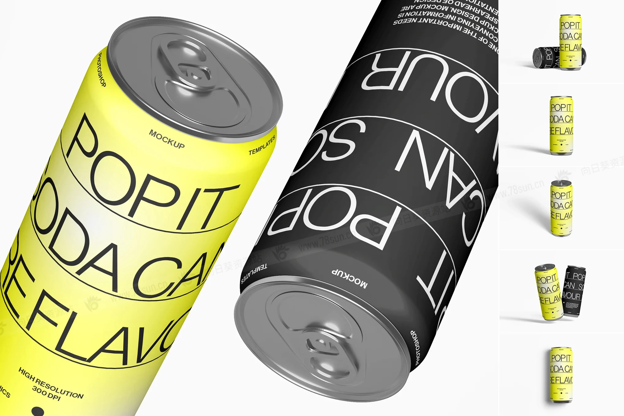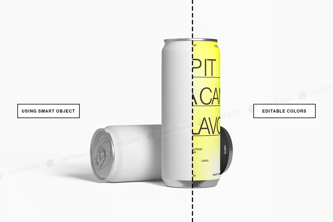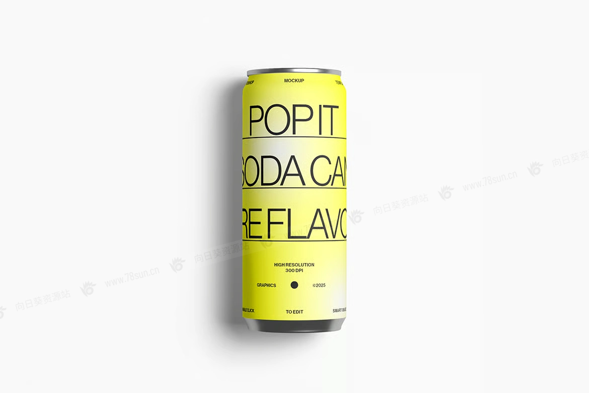 汽水饮料易拉罐头品牌VI效果图展示智能贴图psd设计样机,逼真的高脚汽水罐模型具有可自定义的背景颜色和智能对象,可轻松更换设计。