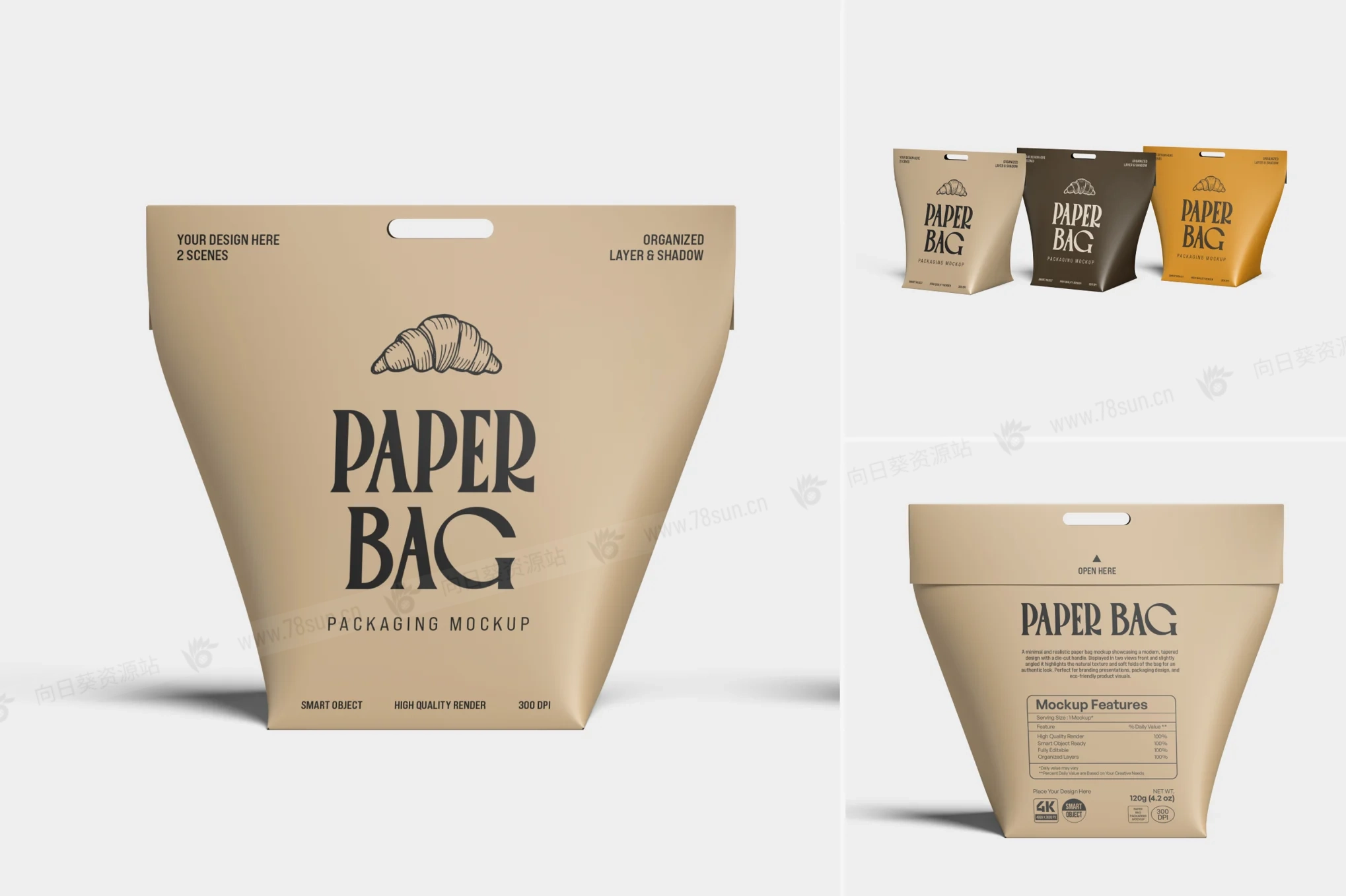 食品牛皮纸包装纸袋品牌VI效果图展示智能贴图psd设计样机。此模型非常适合面包店、食品或可持续产品品牌推广,它具有 2 个高分辨率 PSD 场景,可展示单个和多个包视图。每个包都使用智能对象轻松插入艺术品,让您可以快速切换设计、纹理或背景色调以匹配您的品牌审美。