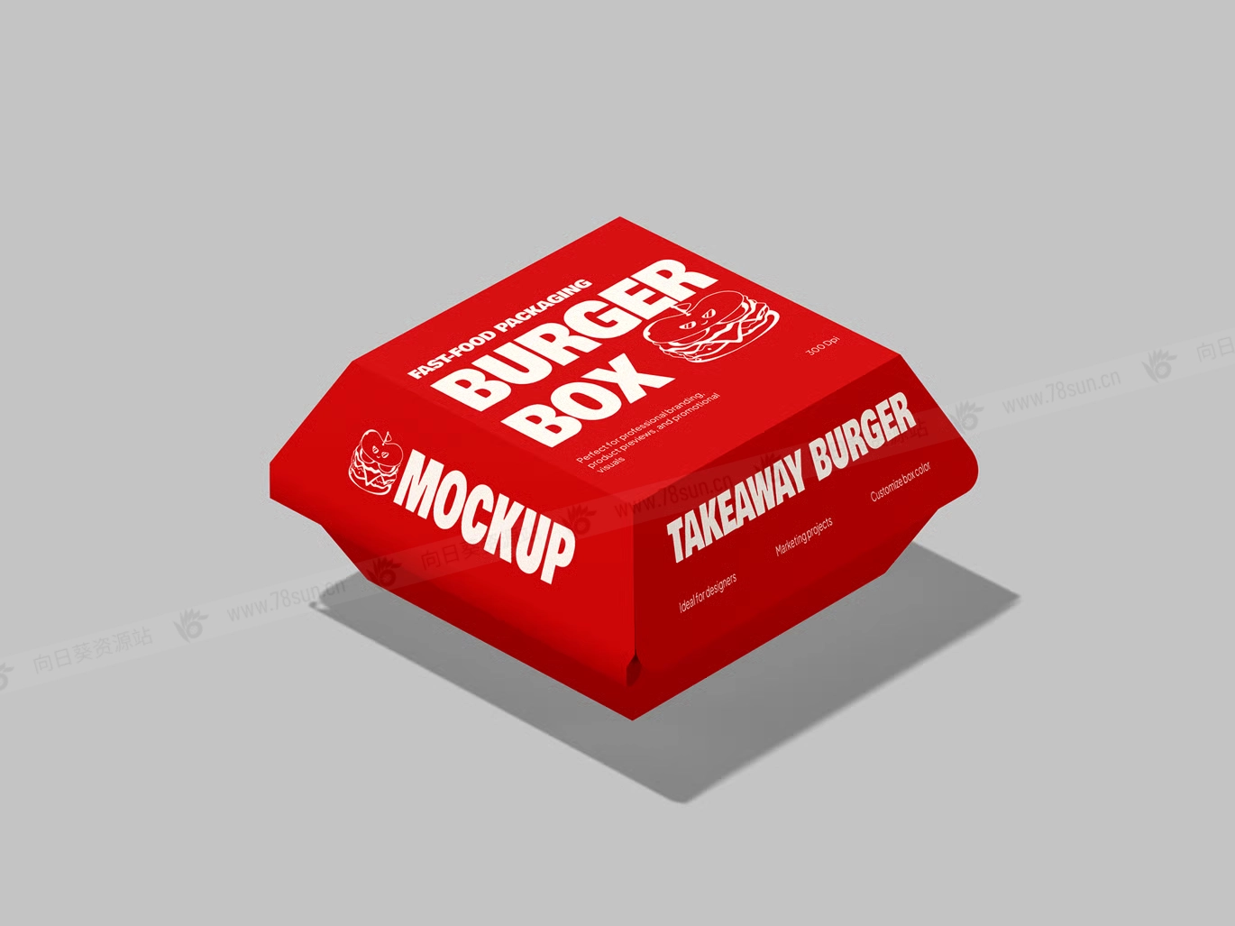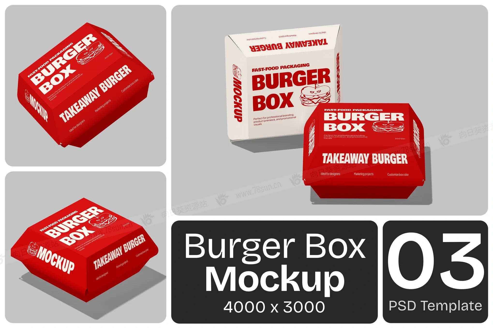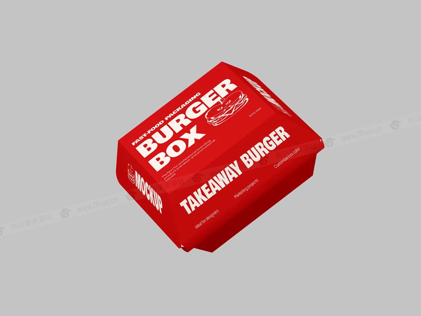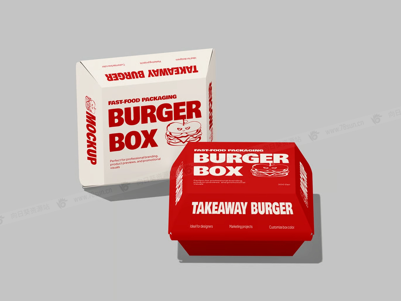 汉堡快餐包装纸盒品牌VI效果图展示智能贴图psd设计样机,使用智能对象图层快速应用您的设计、更改框颜色以及自定义背景以获得干净的演示。