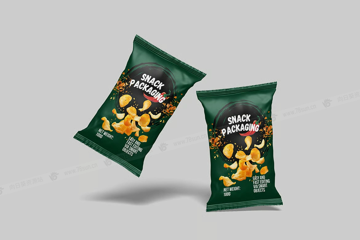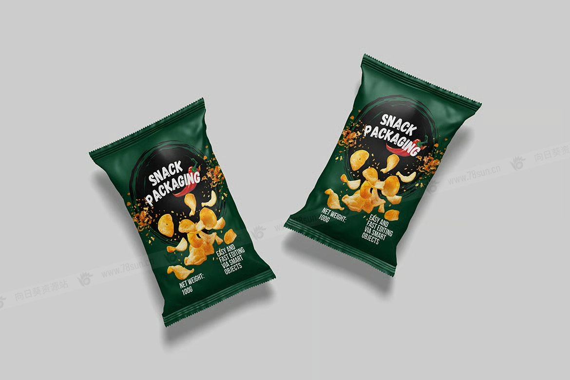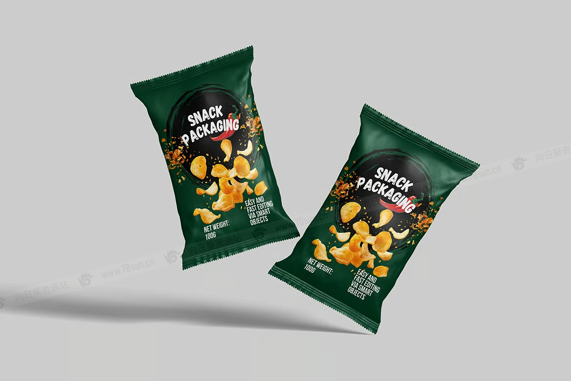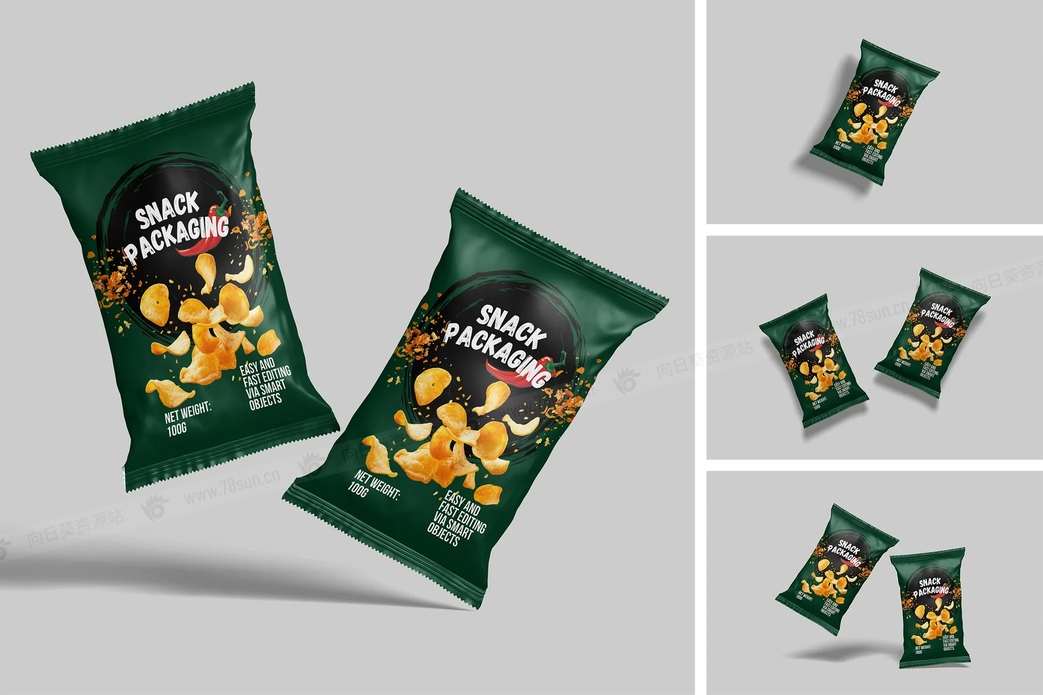 零食薯片膨化食品包装袋品牌VI效果图展示智能贴图psd设计样机。该模型包括 6 个带有分层良好 PSD 文件,并且该模型还使用智能对象功能,这意味着您可以在几秒钟内轻松快速地使用自己的设计更改当前设计。