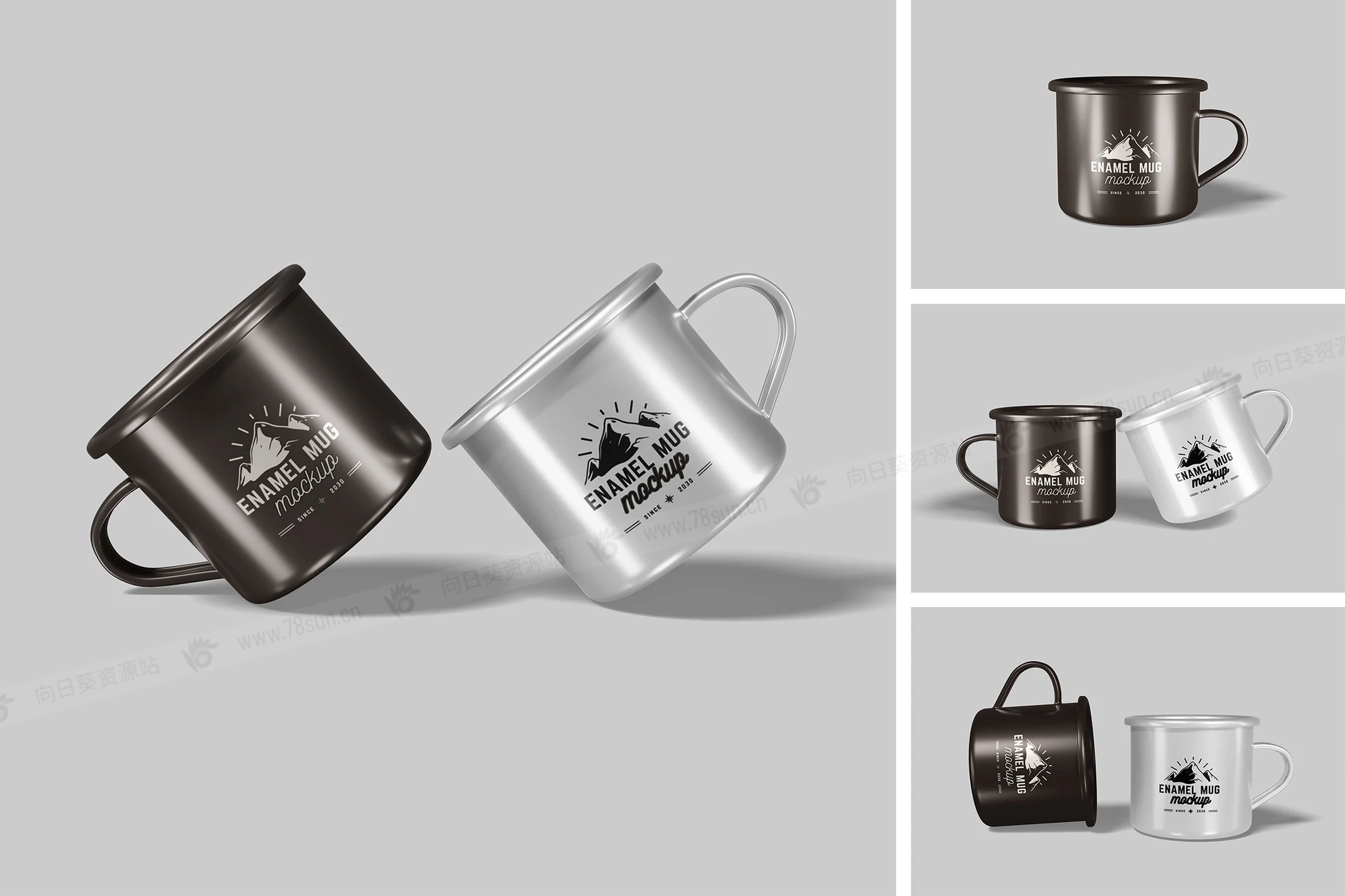 珐琅马克杯品牌VI效果图展示智能贴图psd设计样机。该模型包括 6 个带有分层良好 PSD 文件,并且该模型还使用智能对象功能,这意味着您可以在几秒钟内轻松快速地使用自己的设计更改当前设计。