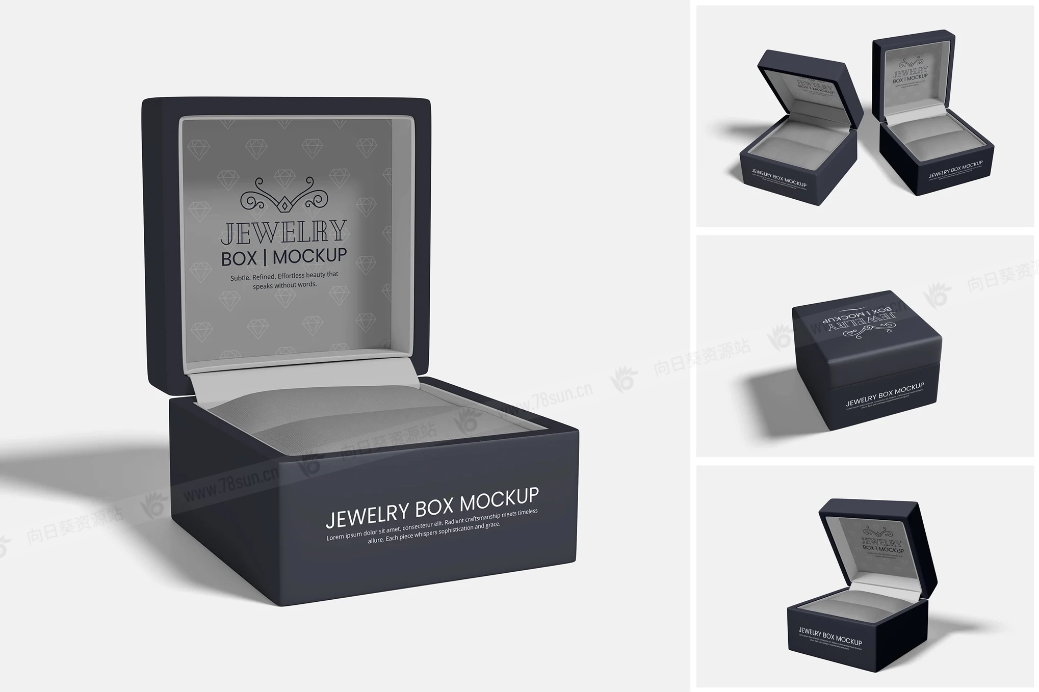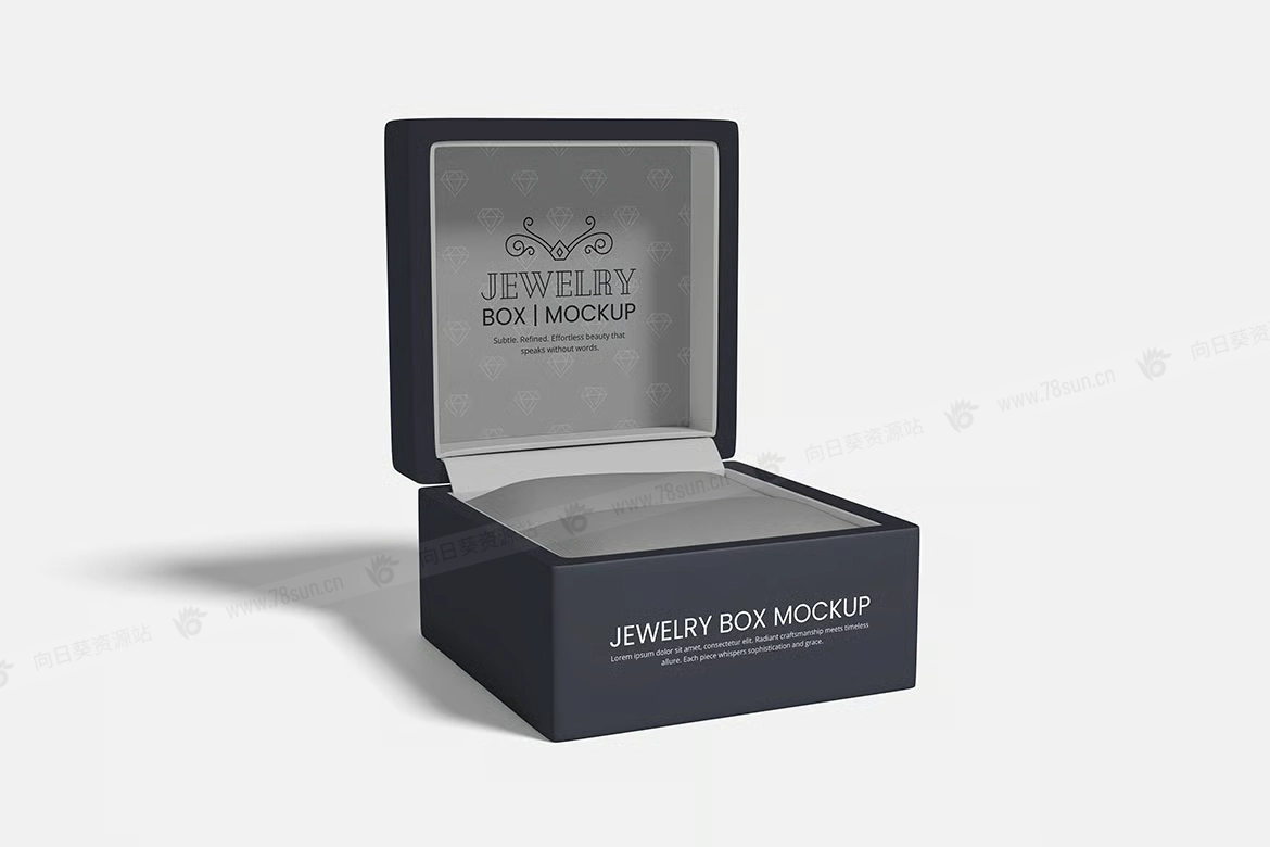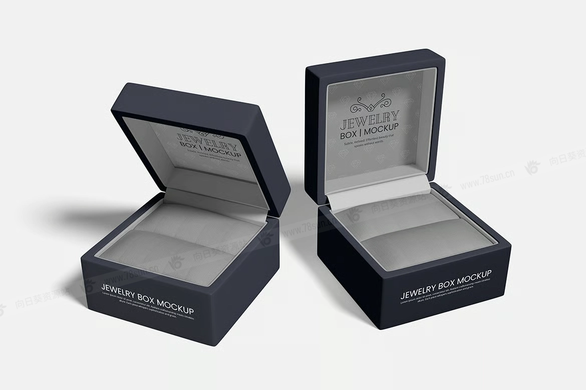 戒指首饰包装礼盒品牌VI效果图展示智能贴图psd设计样机。使用智能对象轻松替换您的设计,双击智能图层,复制并粘贴您的图稿,保存即可完成!