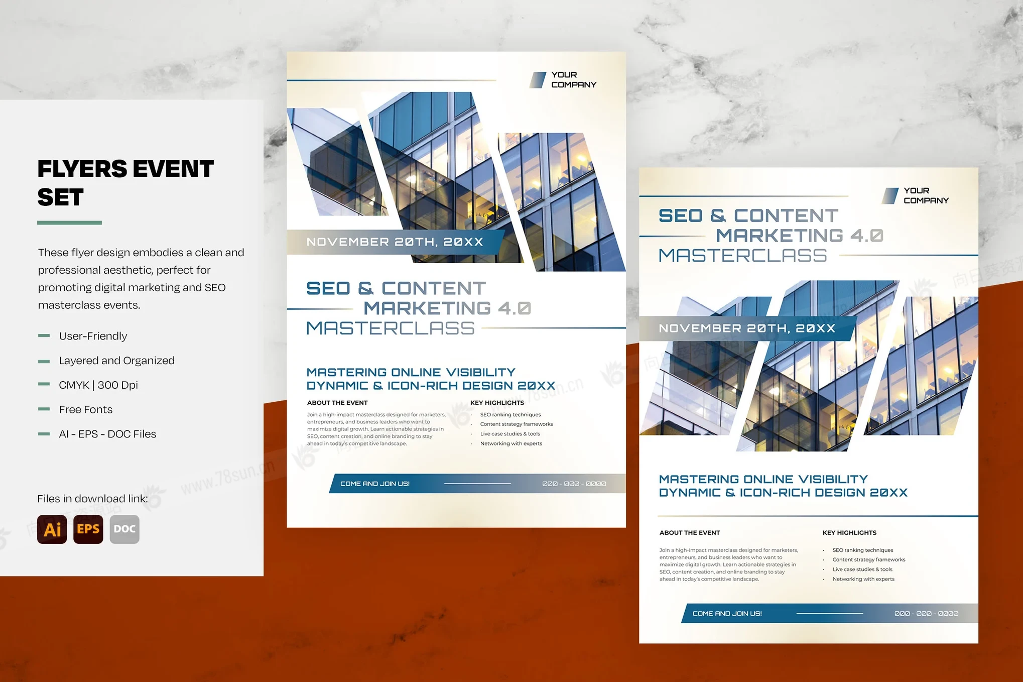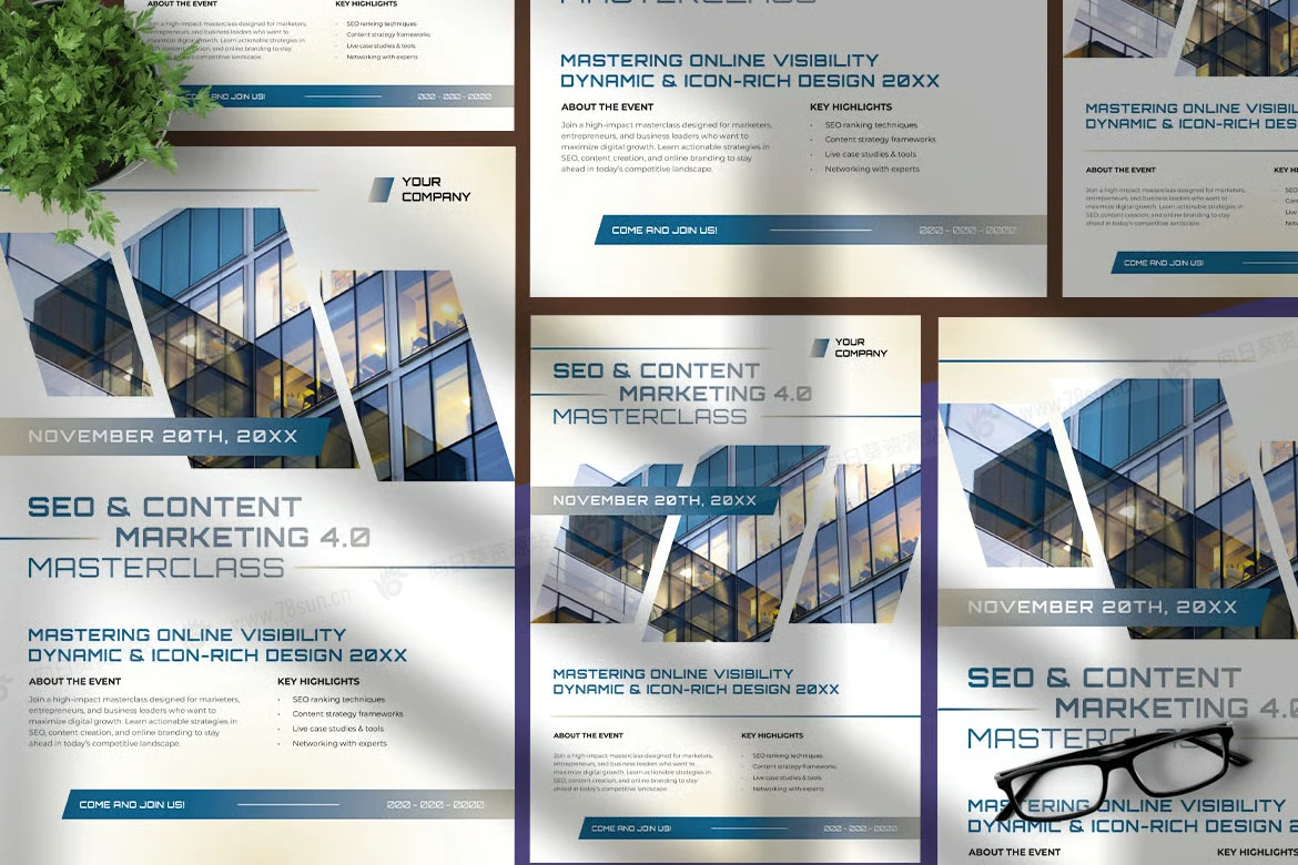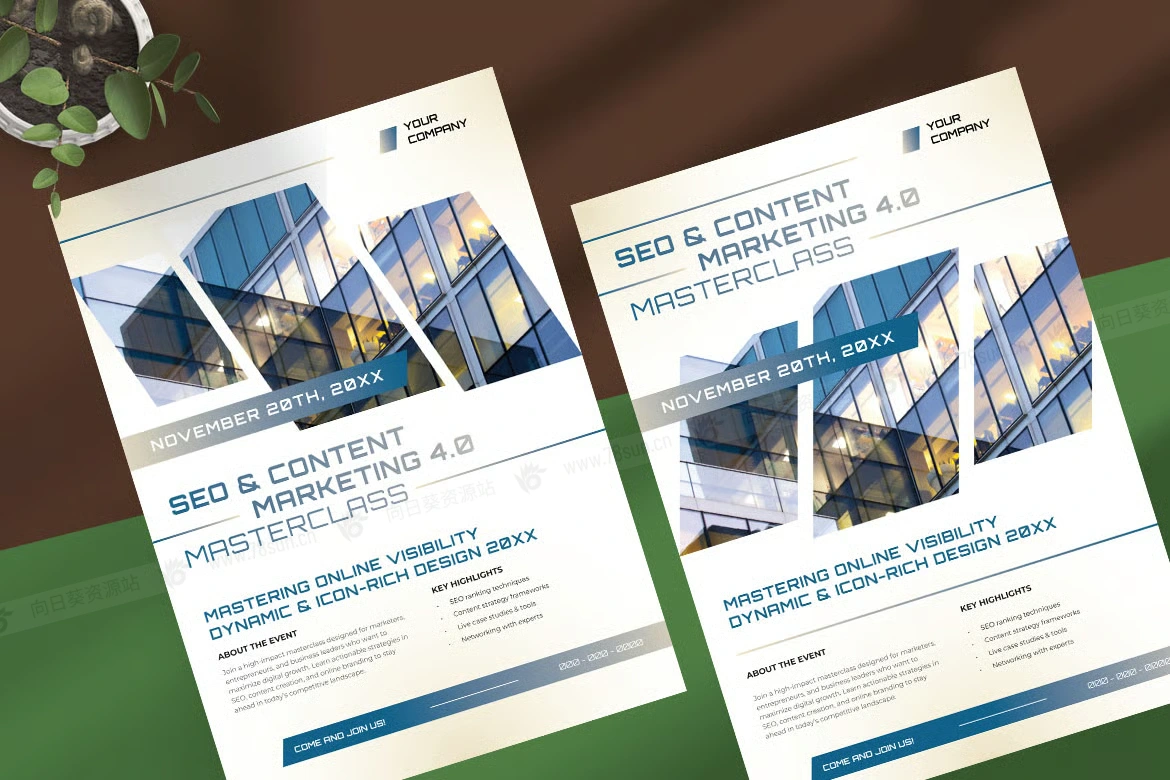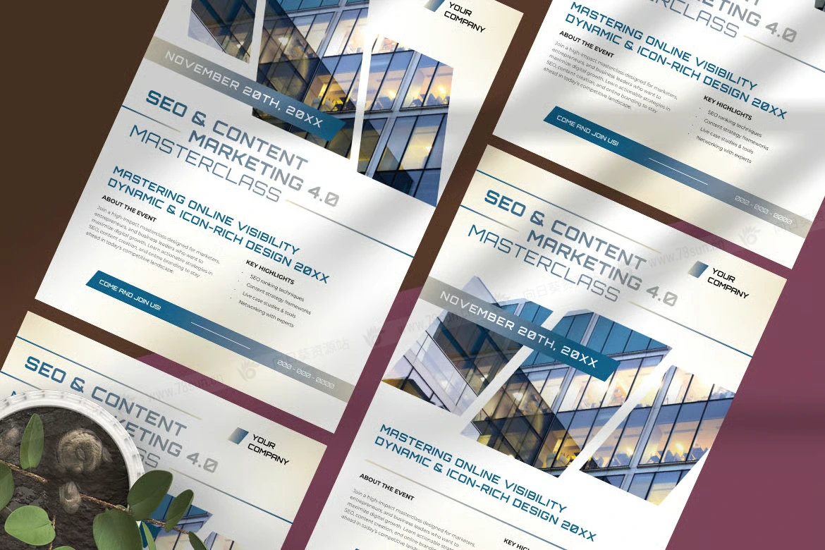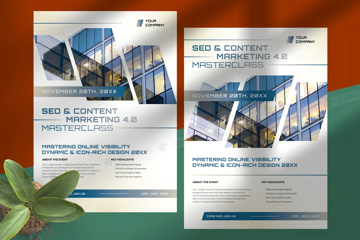 商务企业宣传推广数字营销活动传单海报ai设计模板。布局采用清晰的几何形状和平衡的排版,确保清晰易读。当代办公楼的高质量图像增添了企业和创新的感觉,与增长和战略的主题相一致。这些设计非常适合营销机构、商业研讨会或专业培训活动,将优雅与功能无缝结合,吸引具有前瞻性思维的专业人士的注意力。