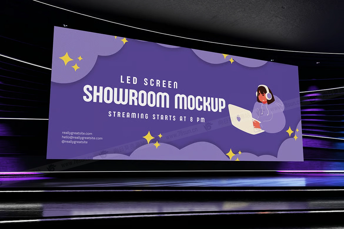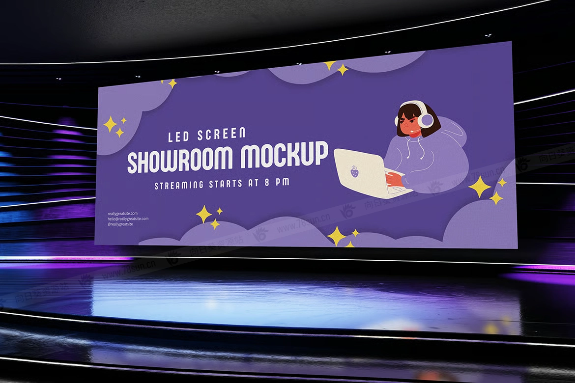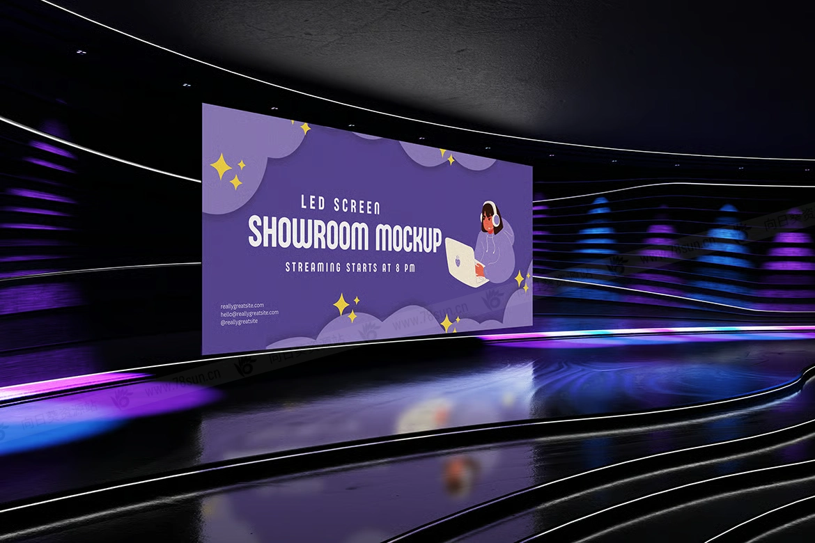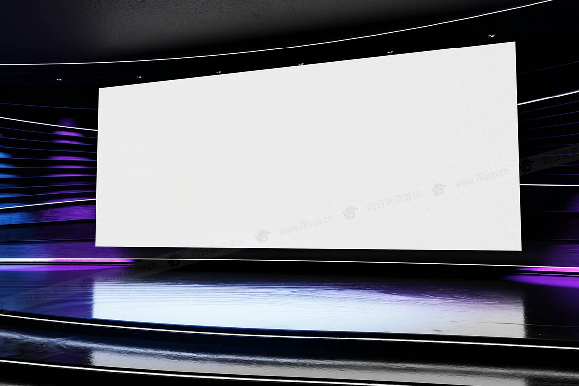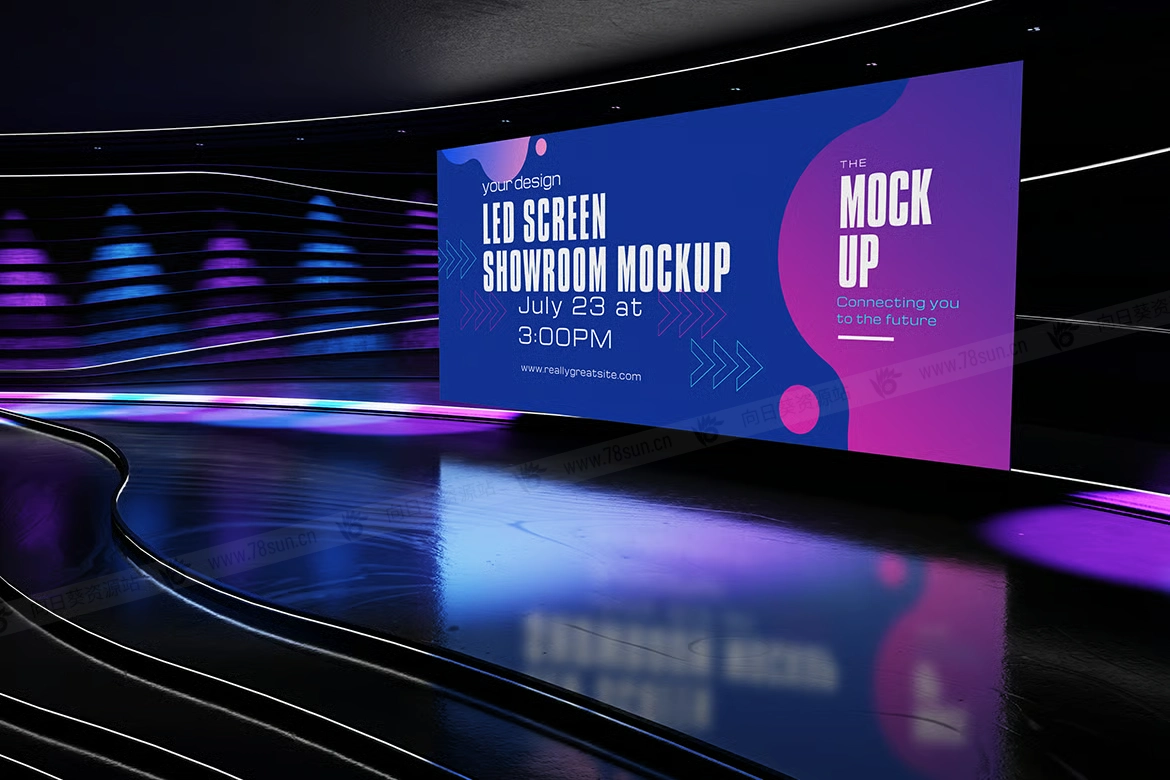 会议厅LED演示活动屏幕品牌VI效果图展示智能贴图psd设计样机。使用智能对象轻松替换您的设计,双击智能图层,复制并粘贴您的图稿,保存即可完成!