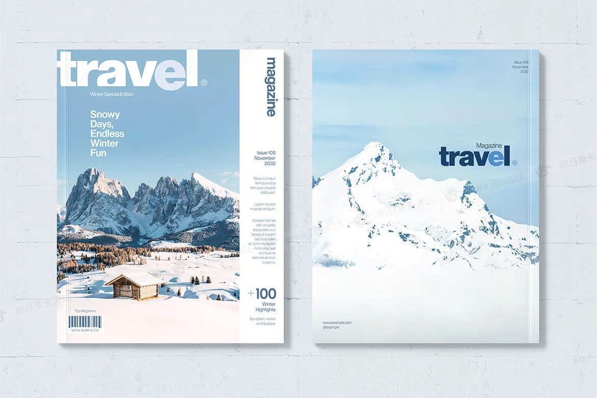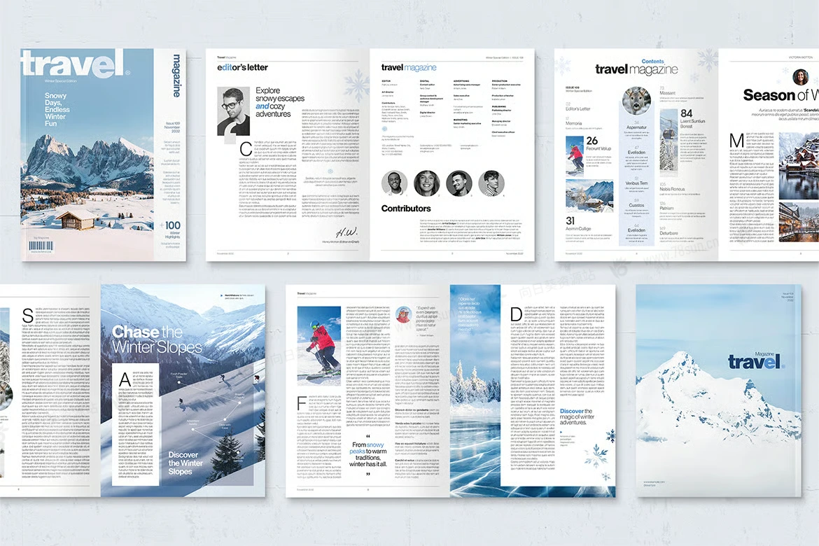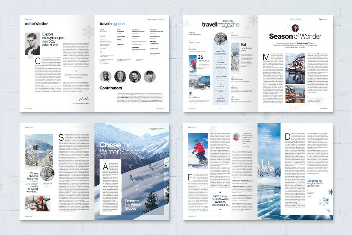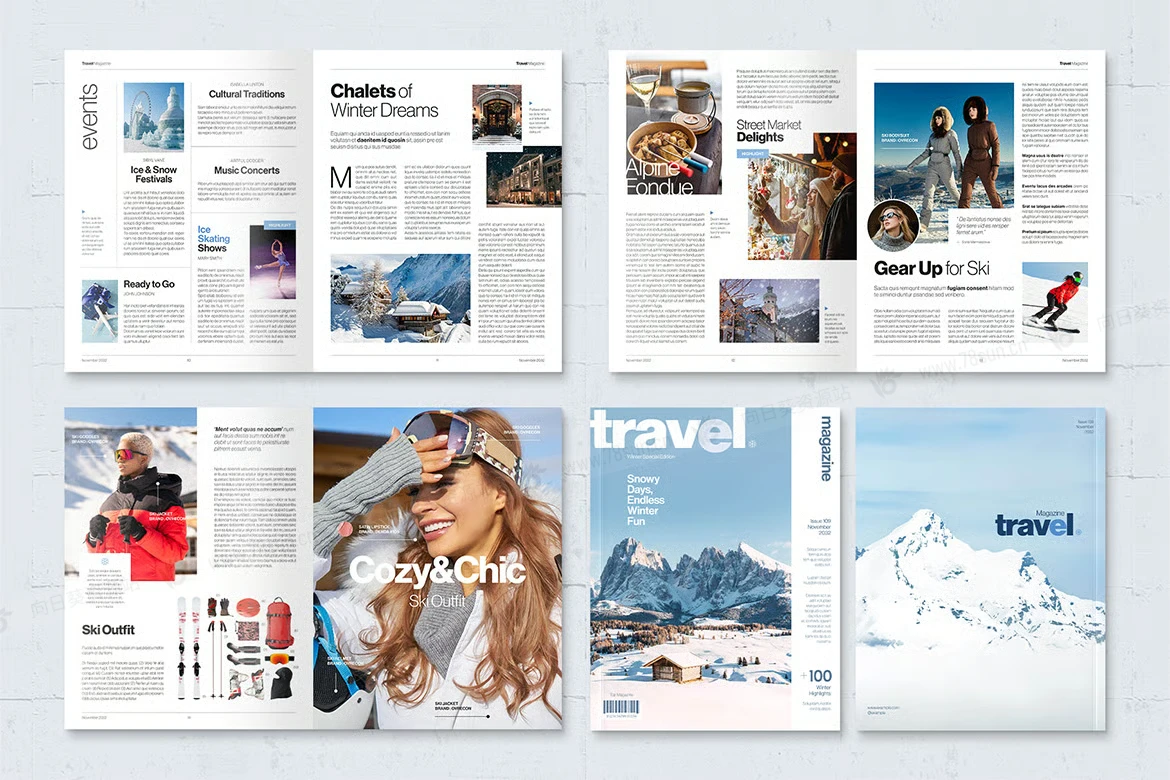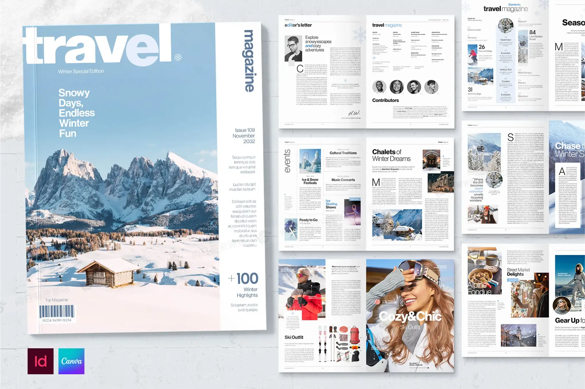 冬季旅游旅行指南雪上运动小册子杂志宣传册画册indd设计模板,冬季旅游杂志模板 – 一个干净、喜庆的布局,适合圣诞节故事和高山旅游。专为滑雪胜地、旅行社和旅游局设计,用于制作杂志、小册子、目录/目录和目的地指南,重点介绍滑雪、雪上运动、探险和户外度假。灵活的页面适合度假村特色、圣诞市场、行程和装备评论。提供 Canva、InDesign IDML、InDesign INDD,可轻松定制、印刷或数字发布,以及季节性活动的快速品牌推广。