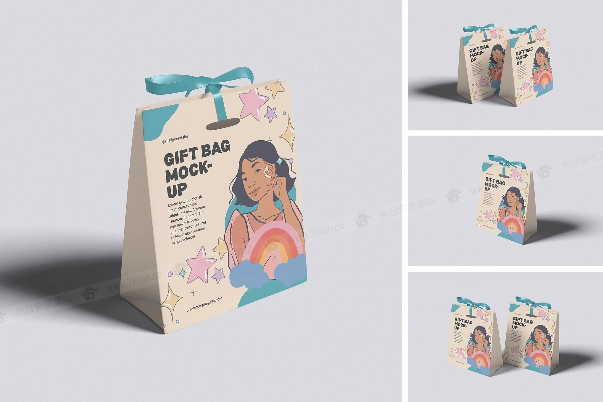 礼品袋品牌VI效果图展示智能贴图psd设计样机,该模型包括 04 个带有分层良好 PSD 文件,并且该模型还使用智能对象功能,这意味着您可以在几秒钟内轻松快速地使用自己的设计更改当前设计。
