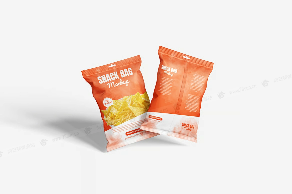 饼干零食包装袋品牌VI效果图展示智能贴图psd设计样机。使用智能对象轻松替换您的设计,双击智能图层,复制并粘贴您的图稿,保存即可完成!