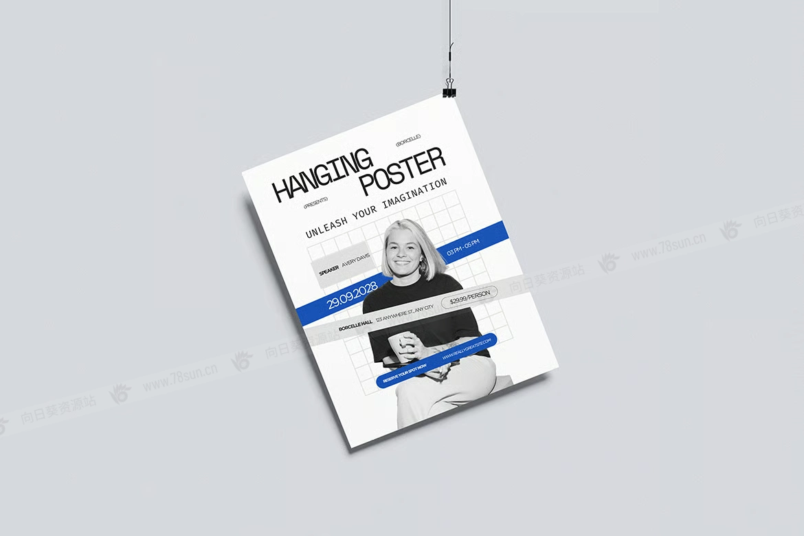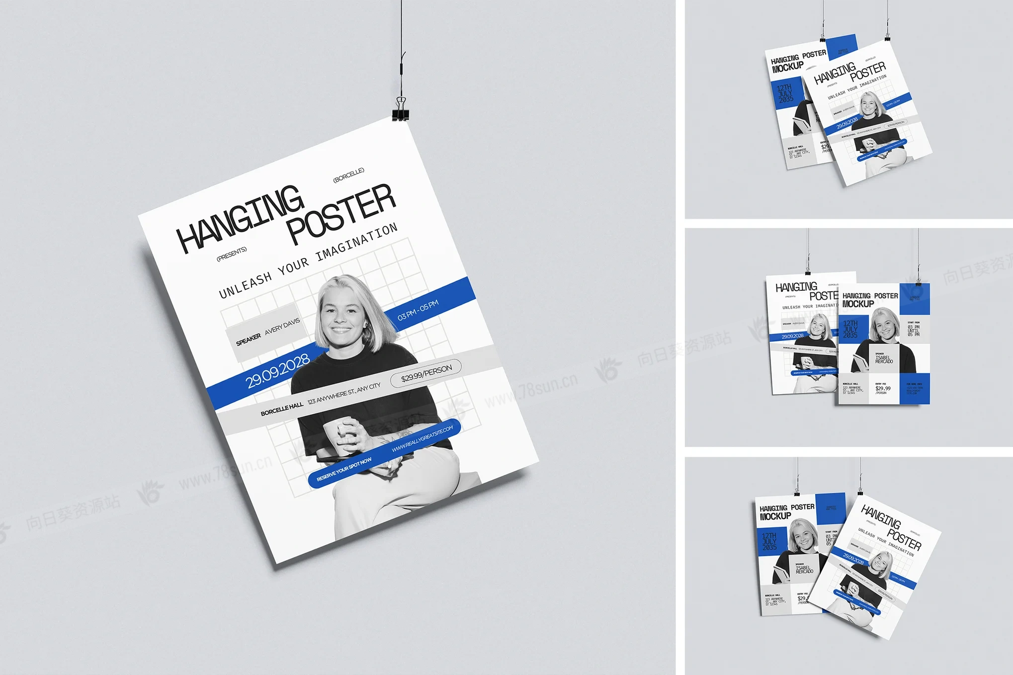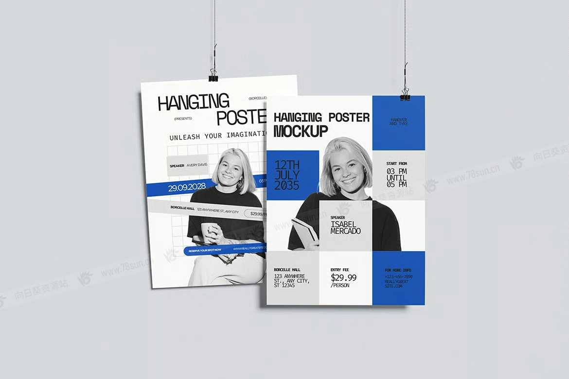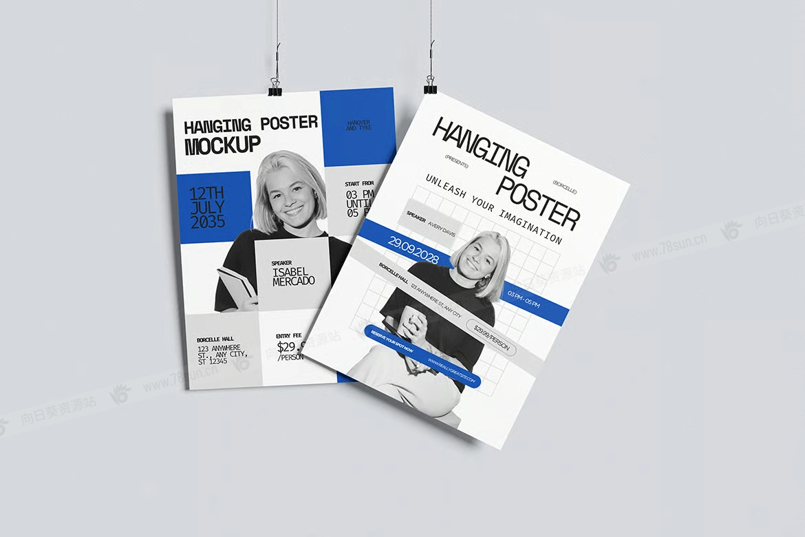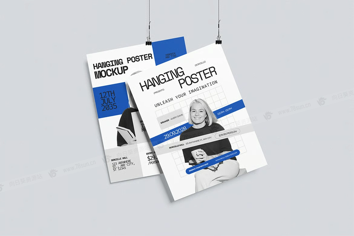 悬挂海报广告宣传单品牌VI效果图展示智能贴图psd设计样机。该模型包括 4 个带有分层良好 PSD 文件,并且该模型还使用智能对象功能,这意味着您可以在几秒钟内轻松快速地使用自己的设计更改当前设计。