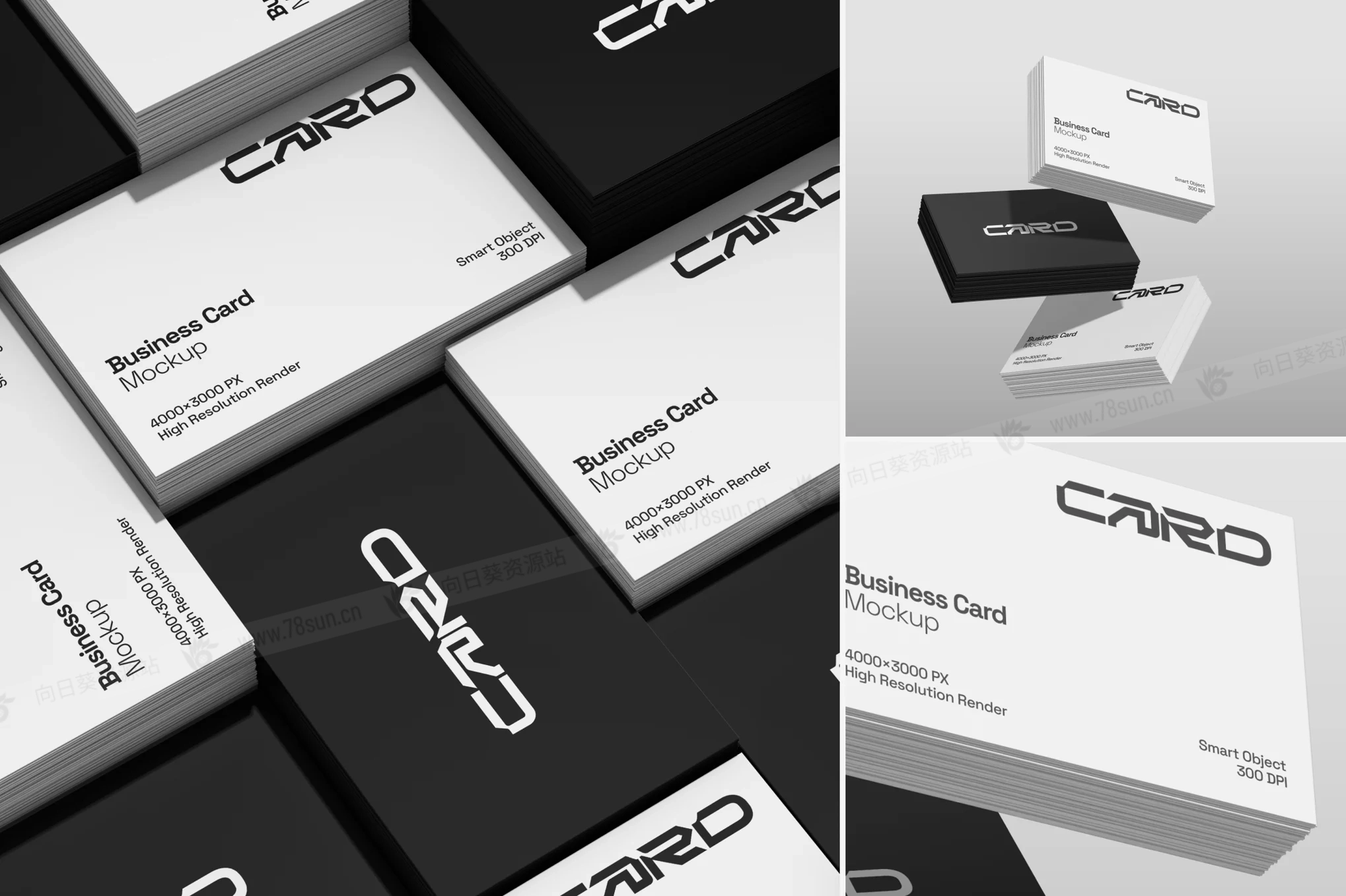 名片商业卡片品牌VI效果图展示智能贴图psd设计样机,使用可完全自定义为任何颜色的隔离背景进行专业渲染。该套装包含多叠标准尺寸的水平名片。这两个场景包括一个平面网格排列和一个动态浮动排列,用于多功能可视化。所有艺术品(正面和背面设计)都通过直观的智能对象进行控制,证明了全面的定制。