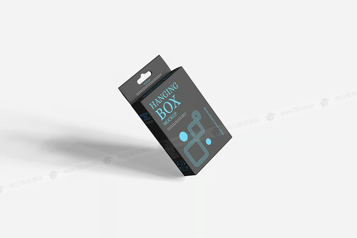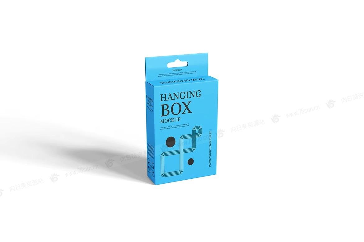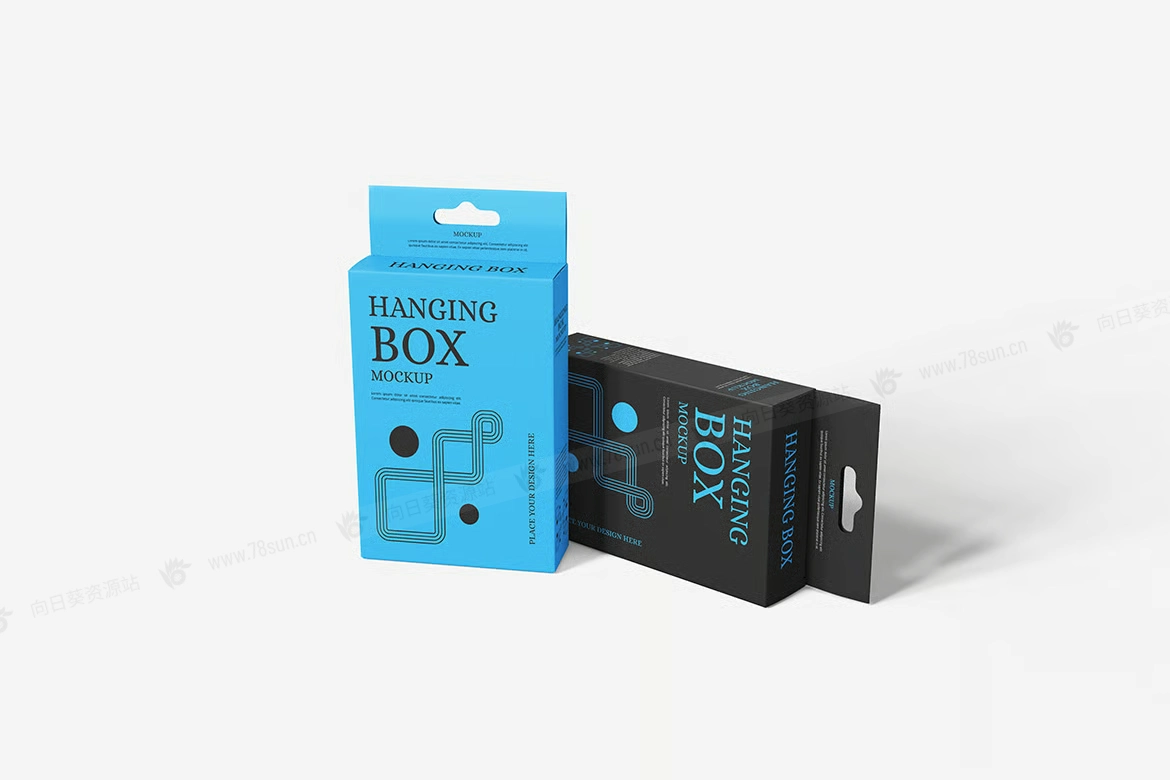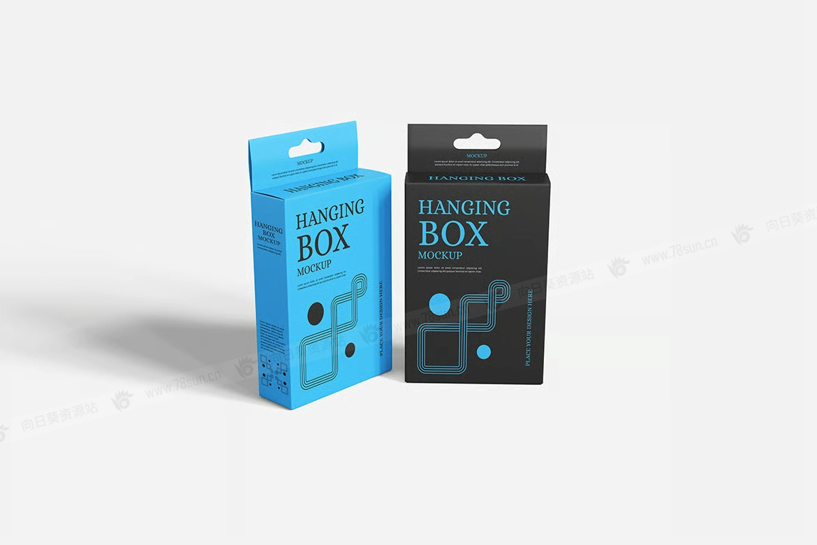 吊箱带挂钩悬挂纸盒品牌VI效果图展示智能贴图psd设计样机。用智能对象替换你的设计很容易。双击智能图层,复制粘贴你的艺术作品,保存,完成任务!