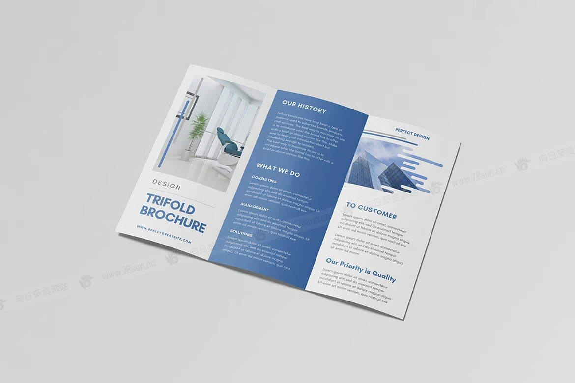 三折页产品宣传小册子品牌VI效果图展示智能贴图psd设计样机。这个模型包含4个带有分层良好的PSD文件的物品,并且还采用了智能对象功能,这意味着你可以在几秒钟内轻松快速地用自己的设计替换当前设计。