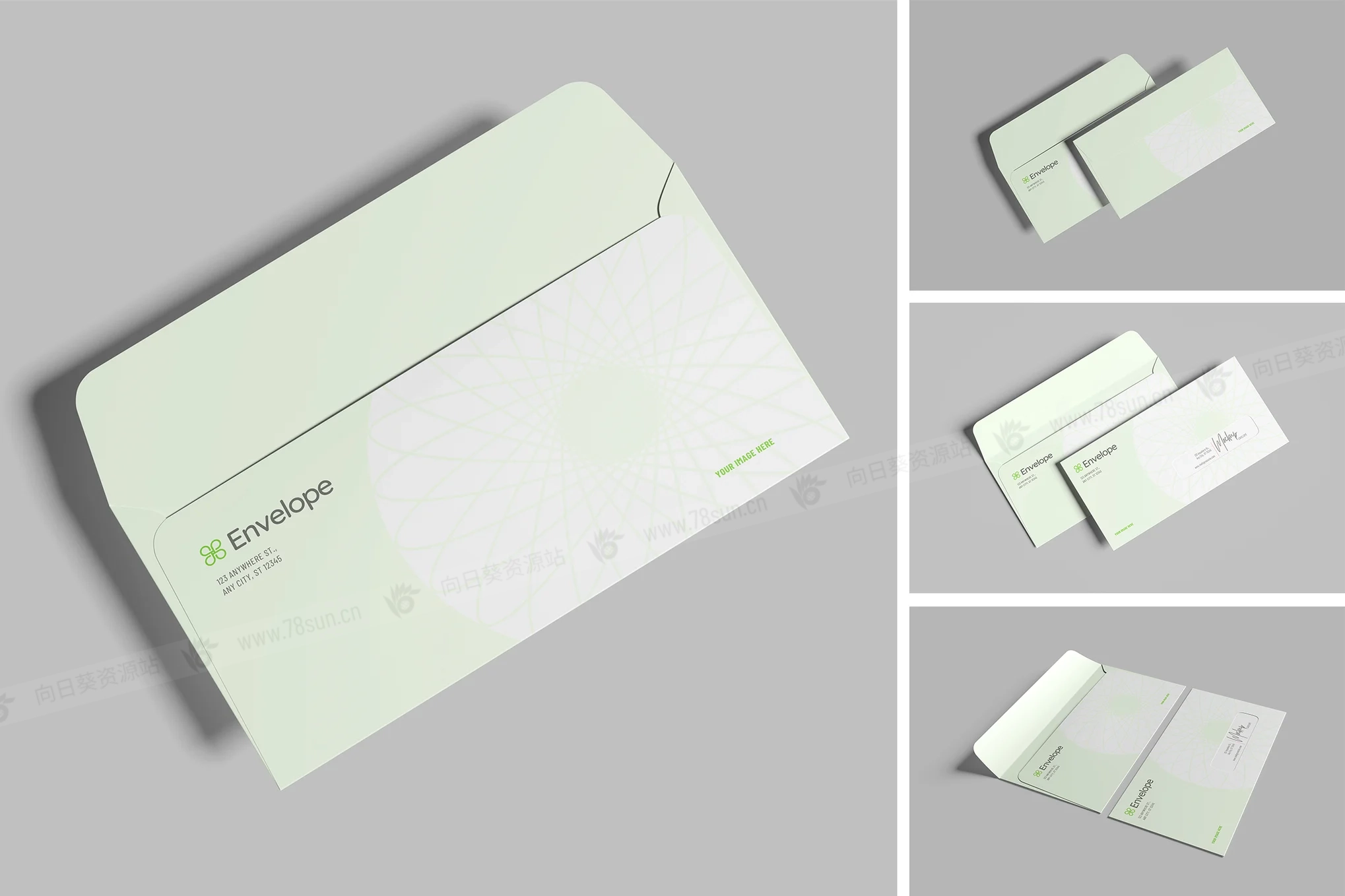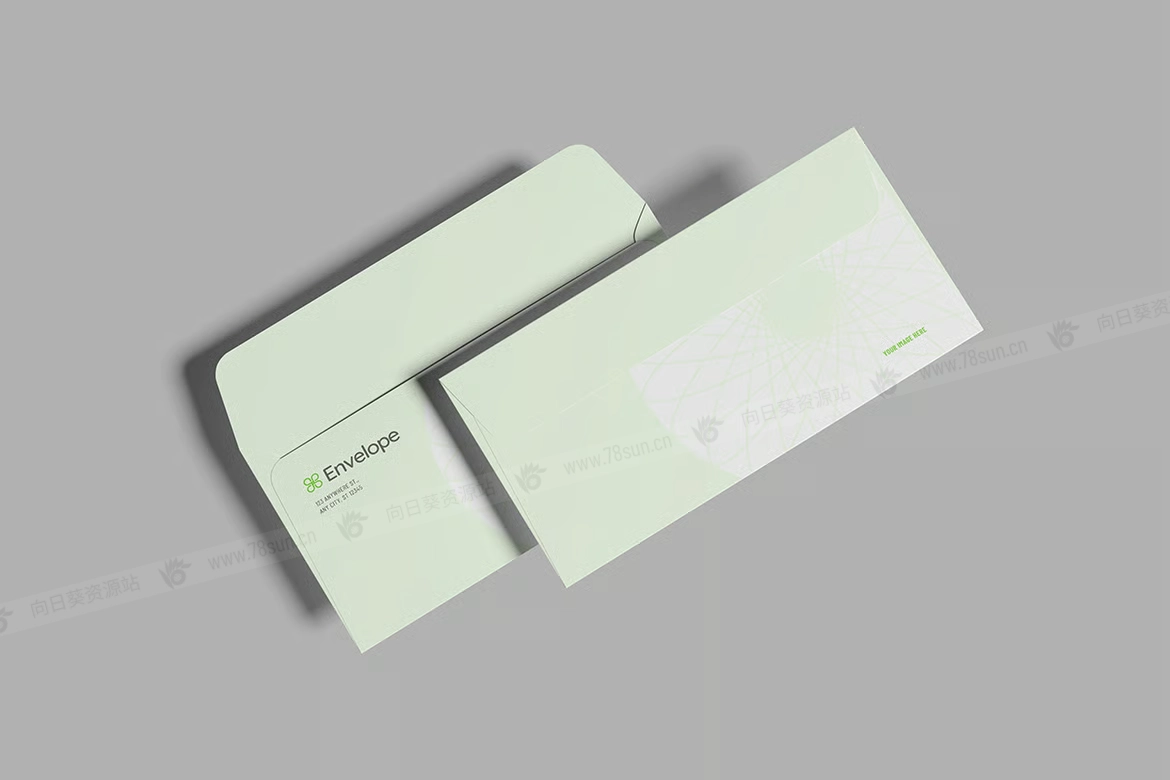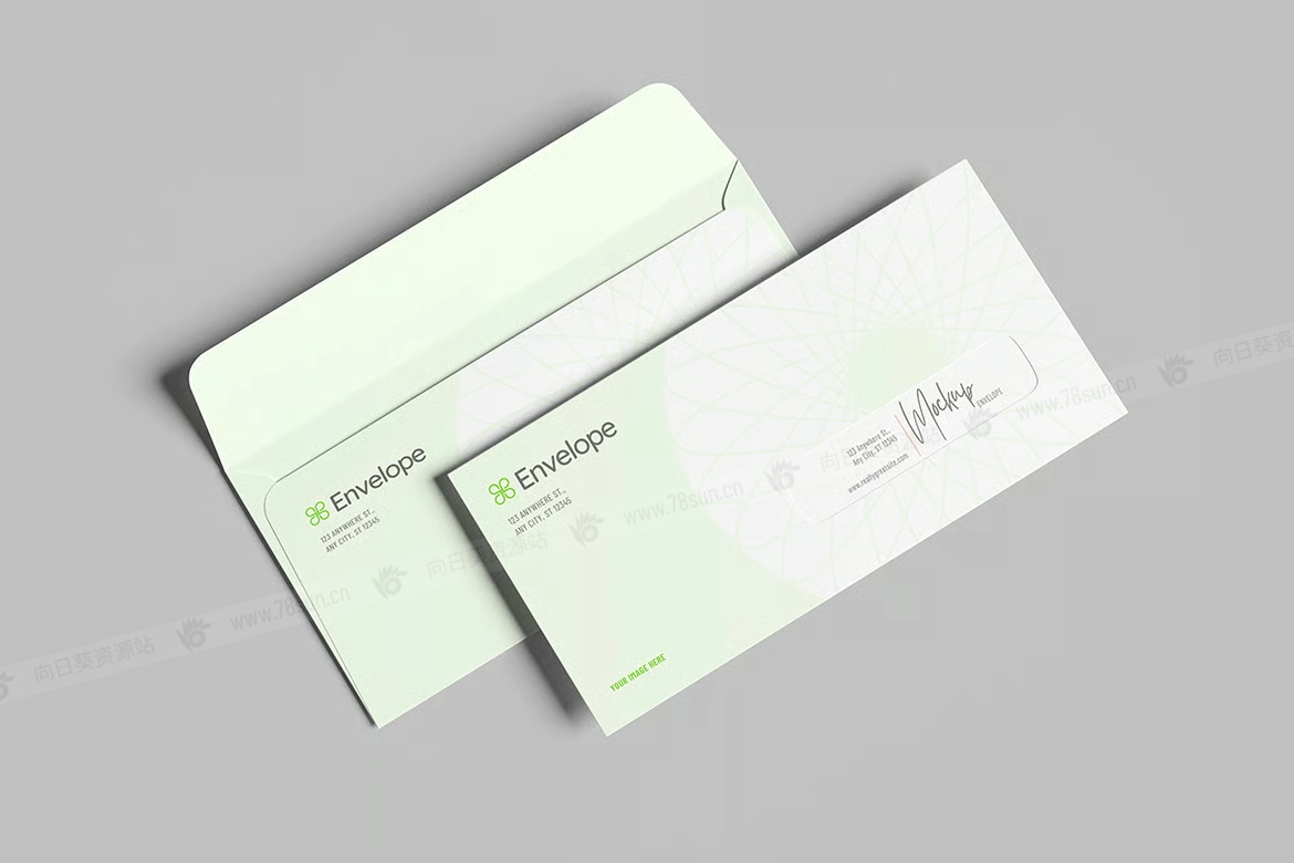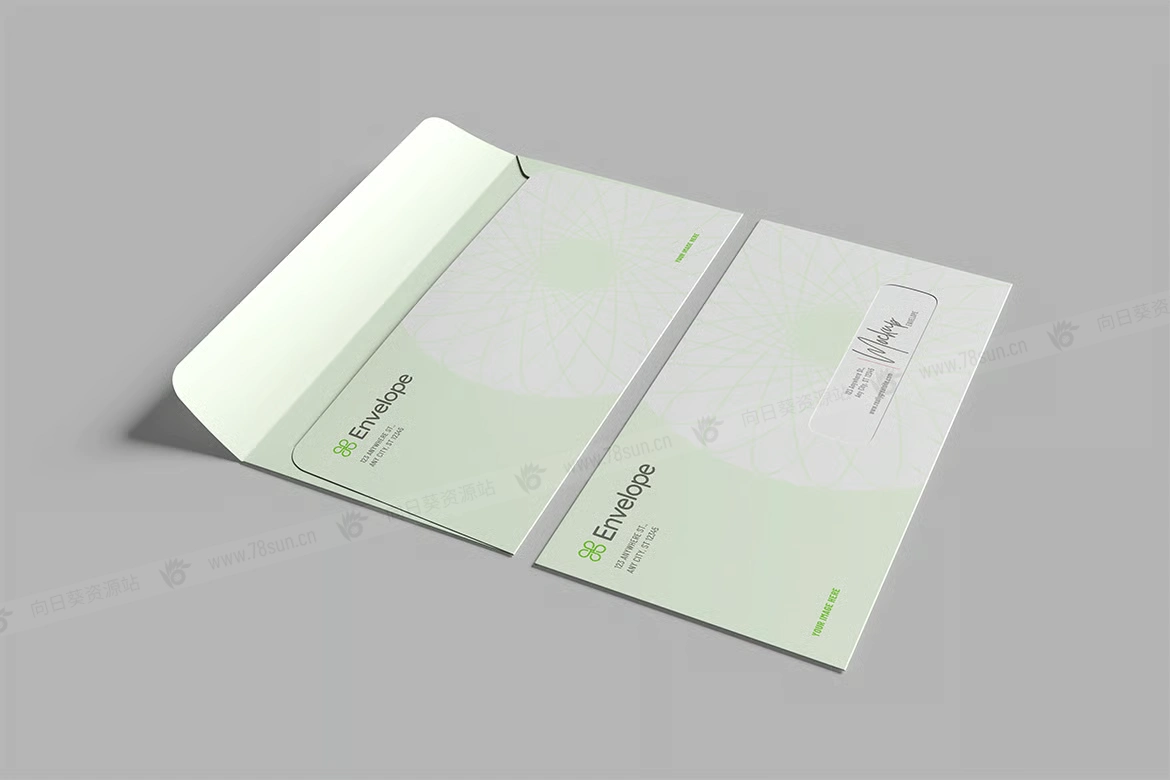 信封品牌VI效果图展示智能贴图psd设计样机,带有分层良好的PSD文件,并且还采用了智能对象功能,这意味着你可以在几秒钟内轻松快速地用自己的设计替换当前设计。