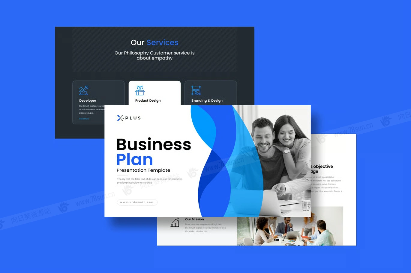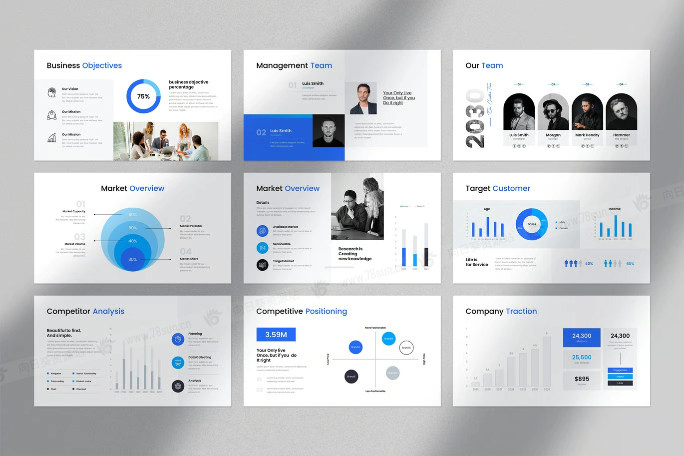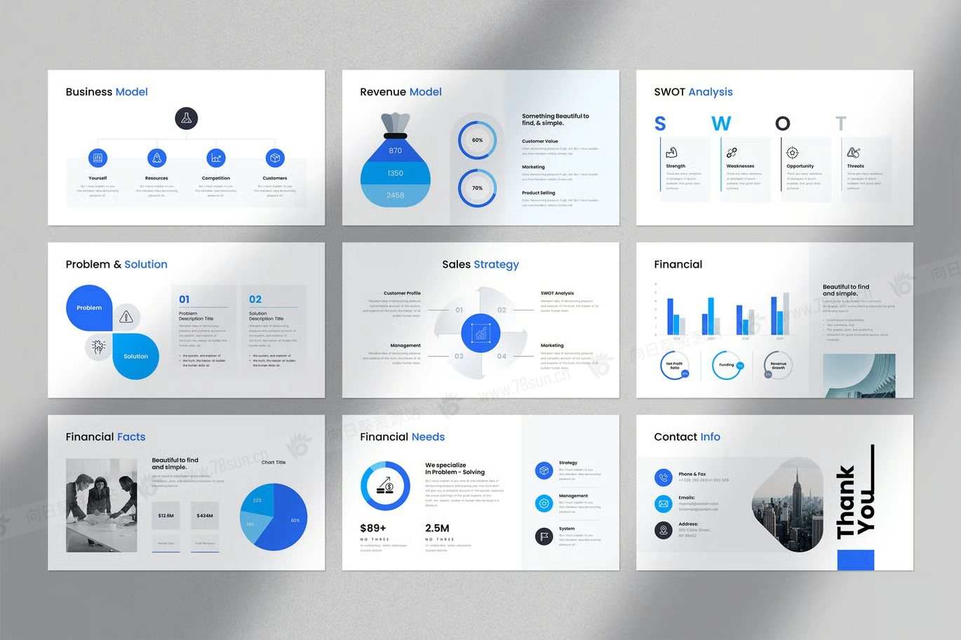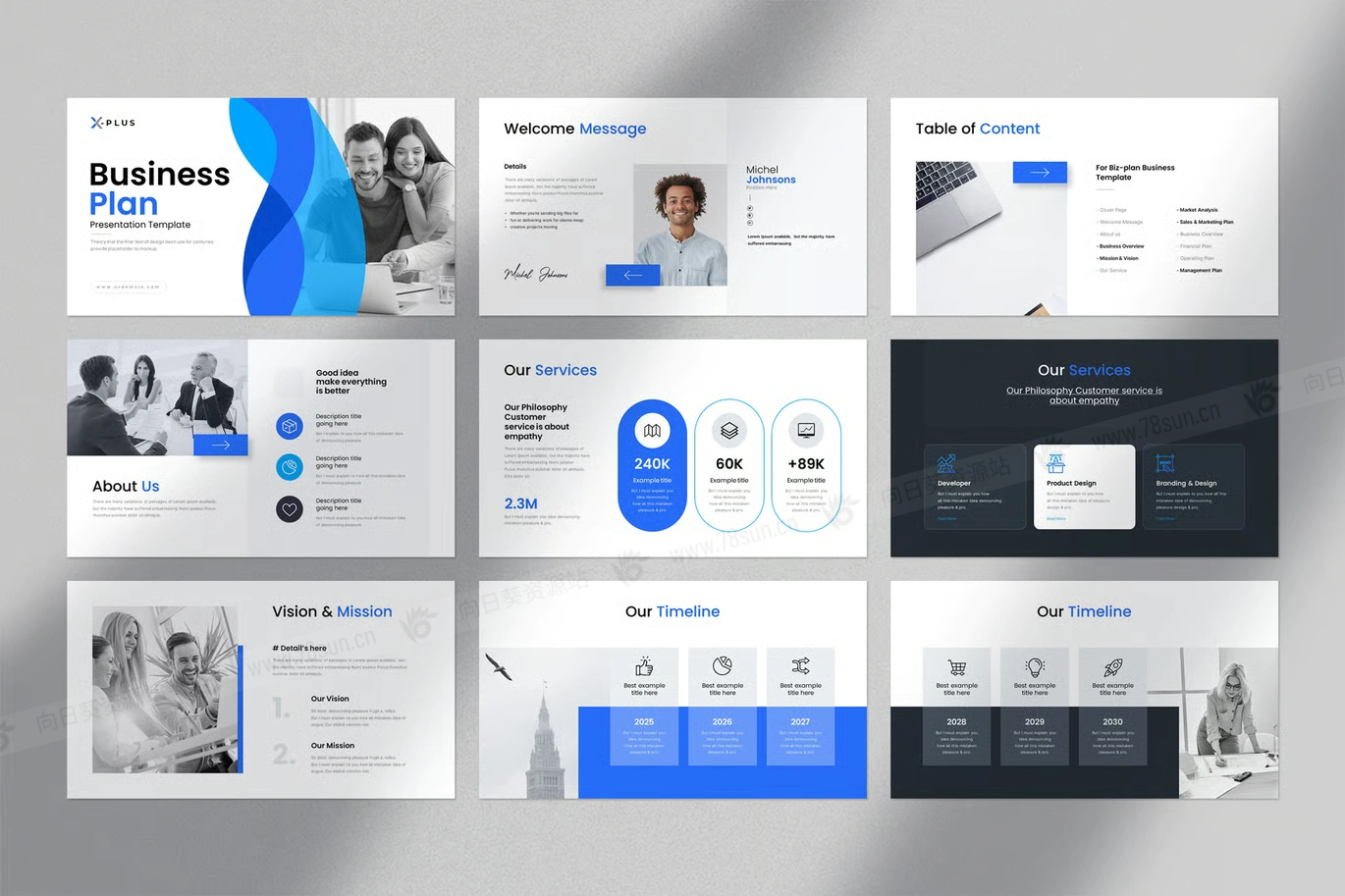 公司简介商业计划书信息图表统计演示PowerPoint幻灯片模板。这款蓝色商业计划简报设计搭配信息图布局设计,集成的信息图布局包括图表、时间线、地图和图表,简化复杂数据并增强受众参与度。